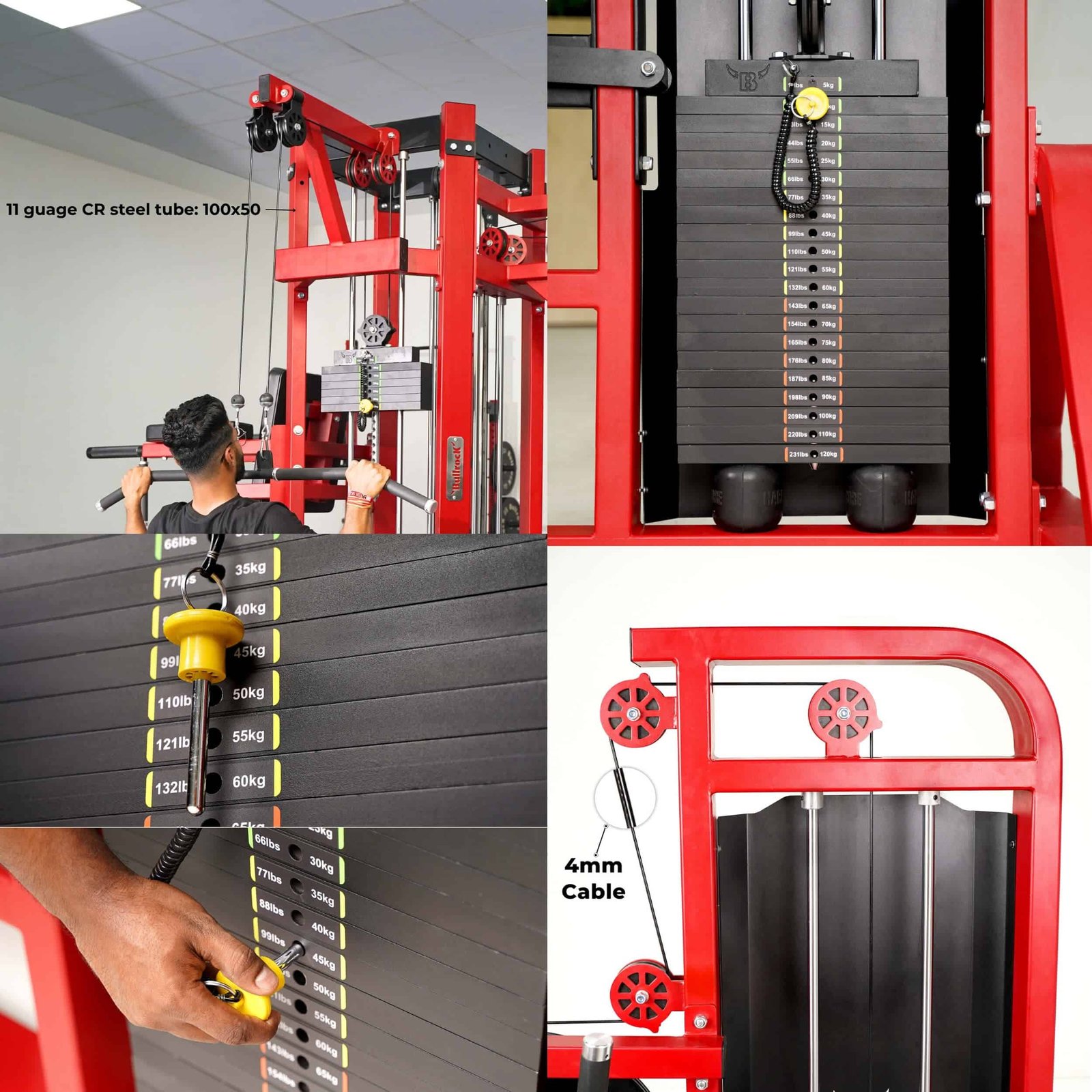 The Square box frame is used as a strong structural support to strength stations, and it also provides easy individual access to each station. Solid Nylon Machined Pulleys with Automobile grade FAG bearing ensuring durability. 4″ Solid Rubber Balls at the Base of Stack for Shock Absorption when the weights are smashed. Guide rods connecting weight stacks are solid steel and hardened hard chromed, ensuring longer service life. 4mm High Strength Cable for Smooth Movement. Inner diameter 4mm, Outer Diameter 6mm Weight selector pin magnetically locks in place and is connected to stack to prevent loss. All CR Tube of 3mm thickness (11 Gauge) Construction. Main frame features 100x50mm Rectangular tube. The Square box frame is used as a strong structural support to strength stations, and it also provides easy individual access to each station. Guide rods connecting weight stacks are solid steel and hardened hard chromed, ensuring longer service life Hand grips are made from a durable, non-absorbent thermoplastic rubber compound that resists wear and tear, ensuring a long-lasting and reliable grip. Hand grips are capped with Aluminium alloy at the ends to prevent slippage. Solid Nylon Machined Pulleys with Automobile grade FAG bearing ensuring durability 4mm High Strength Cable for Smooth Movement. Inner diameter 4mm, Outer Diameter 6mm. CNC machined precision steel weight stack – 5kg incremental. 4″ Solid Rubber Balls at the Base of Stack for Shock Absorption when the weights are smashed. Weight selector pin magnetically locks in place and is connected to stack to prevent loss.