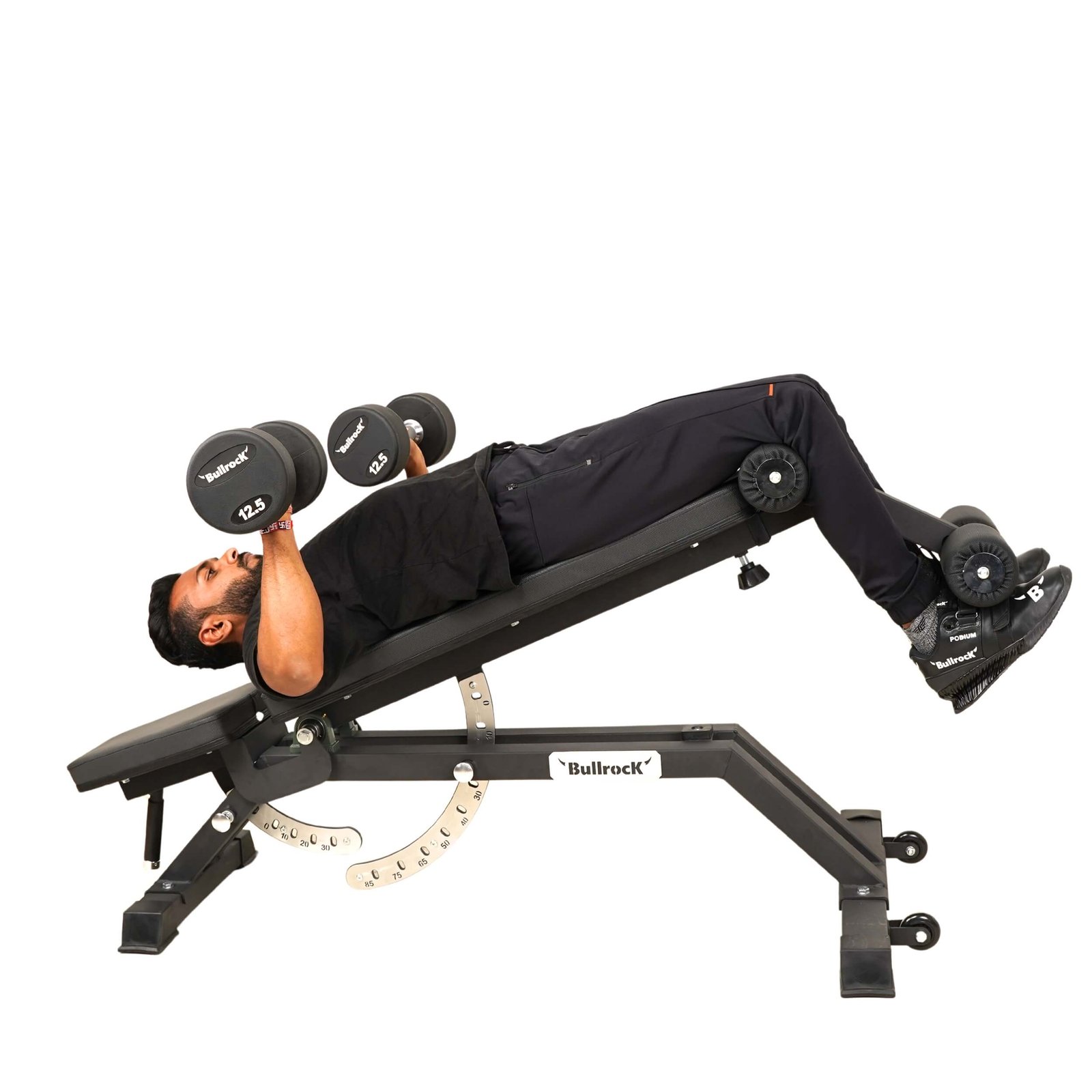 This FID Bench, features a removable leg roller attachment for added exercise variety. It enables one to perform feet locking exercises such as Decline Dumbbell presses, Sit ups and crunches.
