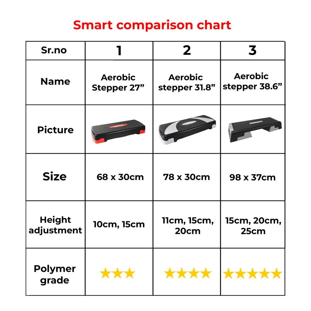 A wider and taller design with 3 height adjustments, this stepper is made out of high density polymer. It is sturdy and absorbs impact better while being in place. A wider footprint of 98cm x 37cm helps in better play area while jumps and other explosive movements. This is better aided by a non-slip surface achieved by a textured rubber top.