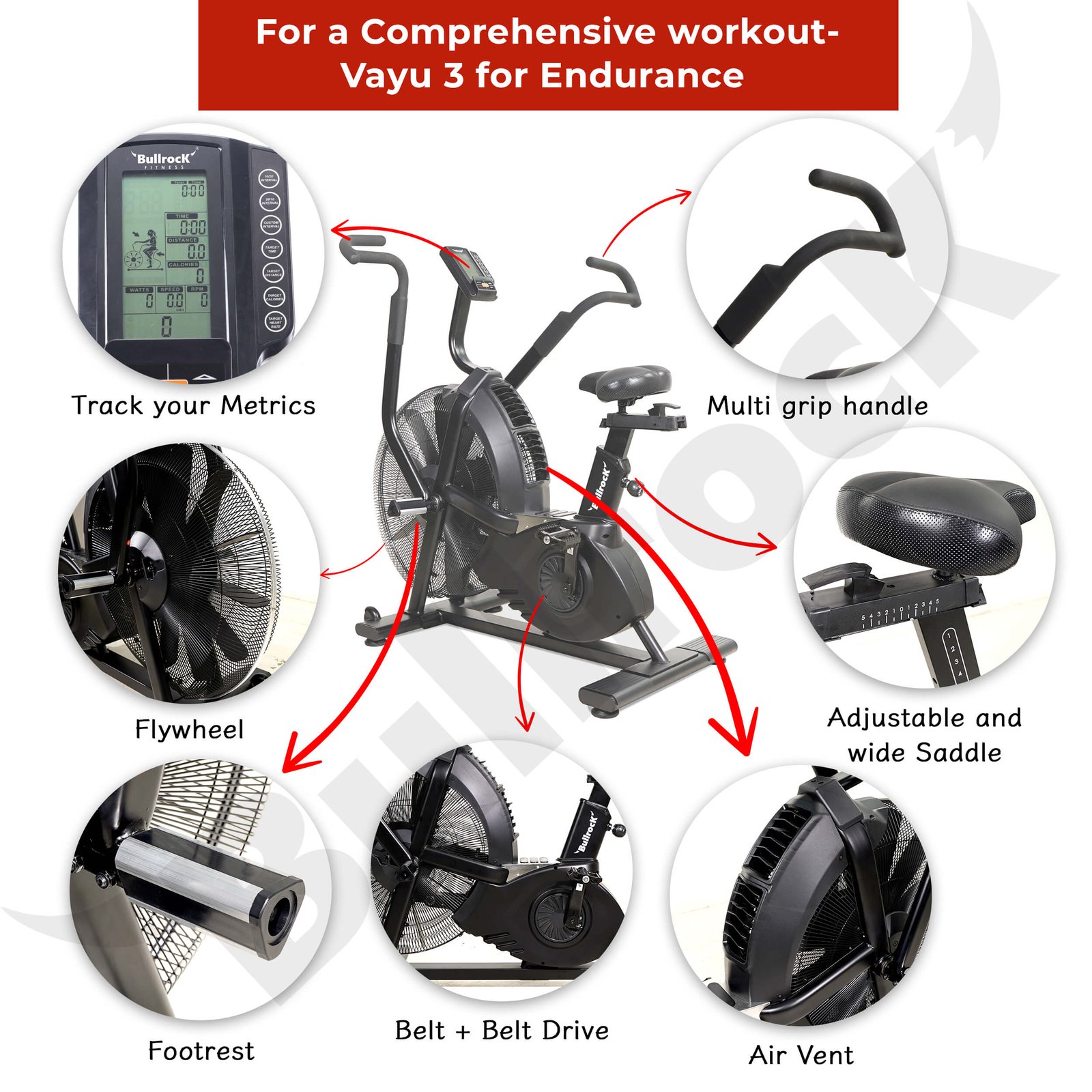 The Vayu3 is our premium air bike engineered for those who demand comfort, refinement, and performance in one package. With its dual belt drive, multi-grip handles, and air-cooling vent, this bike is built for longer sessions, better ergonomics, and smoother rides — making it ideal for both serious home athletes and professional trainers.