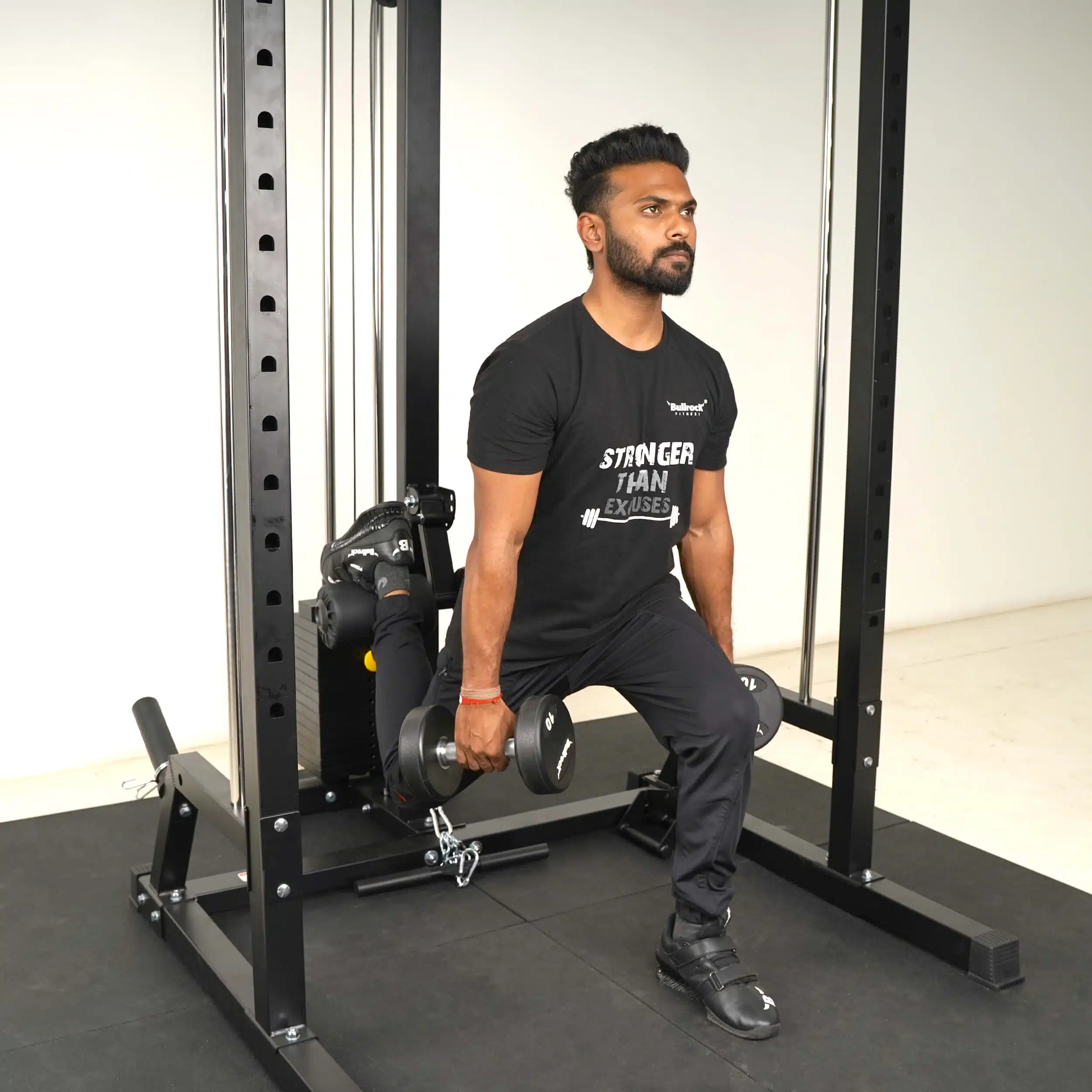 The OX 7 combines a Squat Rack, Smith Machine, Lat Pull Down, Low Row, Biceps Triceps Pulley, Multi-Grip Pull-up, Adjustable Parallel Bar Dip in the footprint of a single half rack.