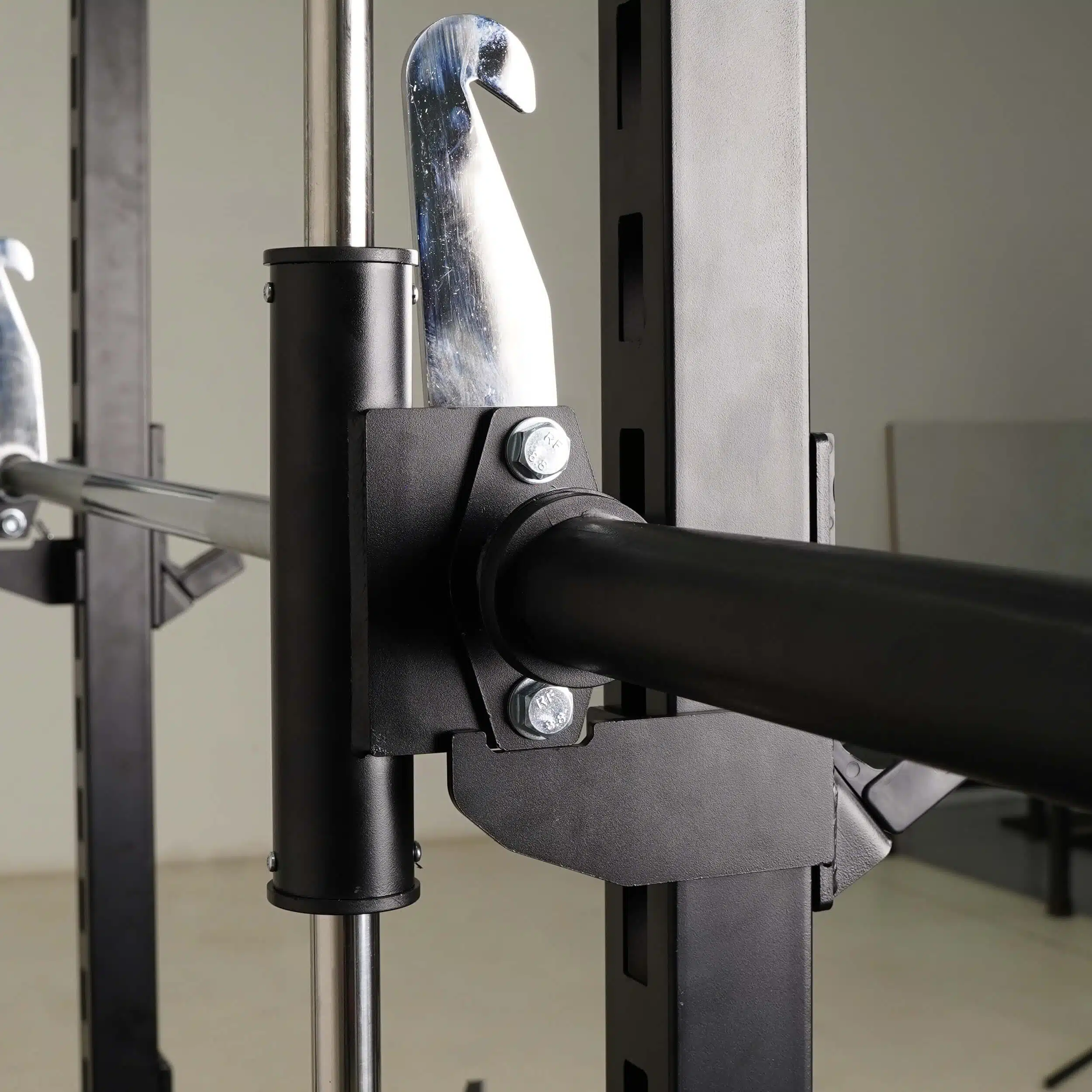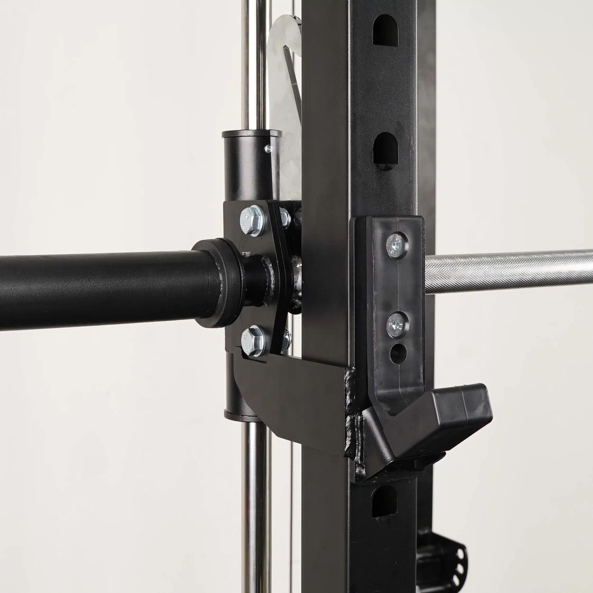 Smith Bar Range Lock feature with J-Cup adjustment. Also can be locked at top when not in use, making it convenient to perform other exercises.