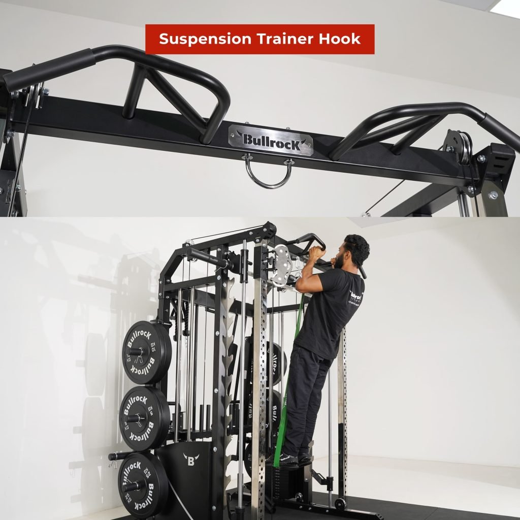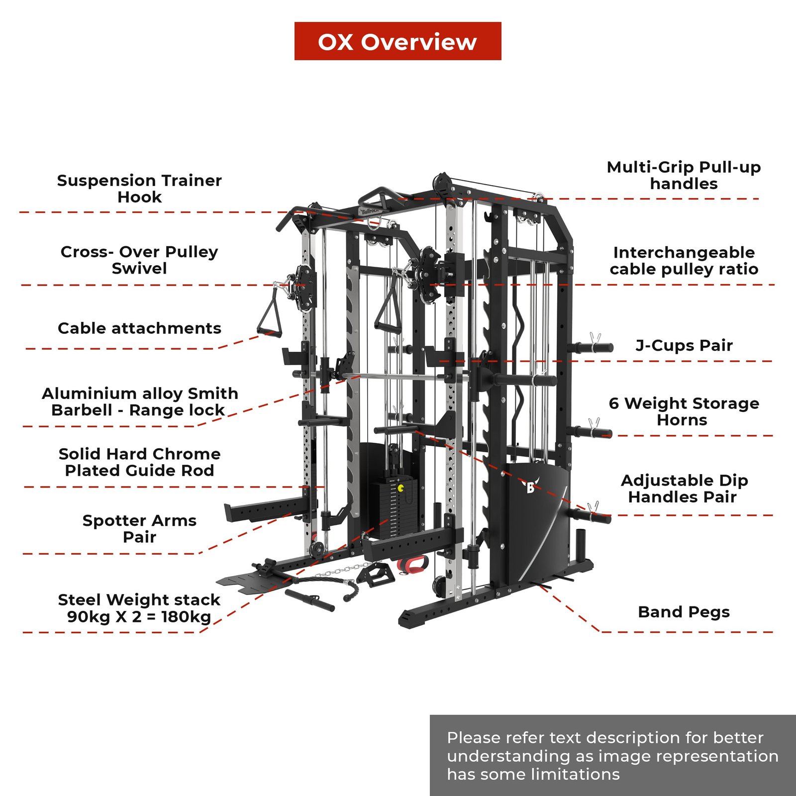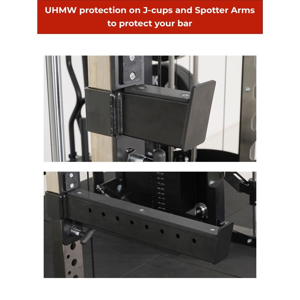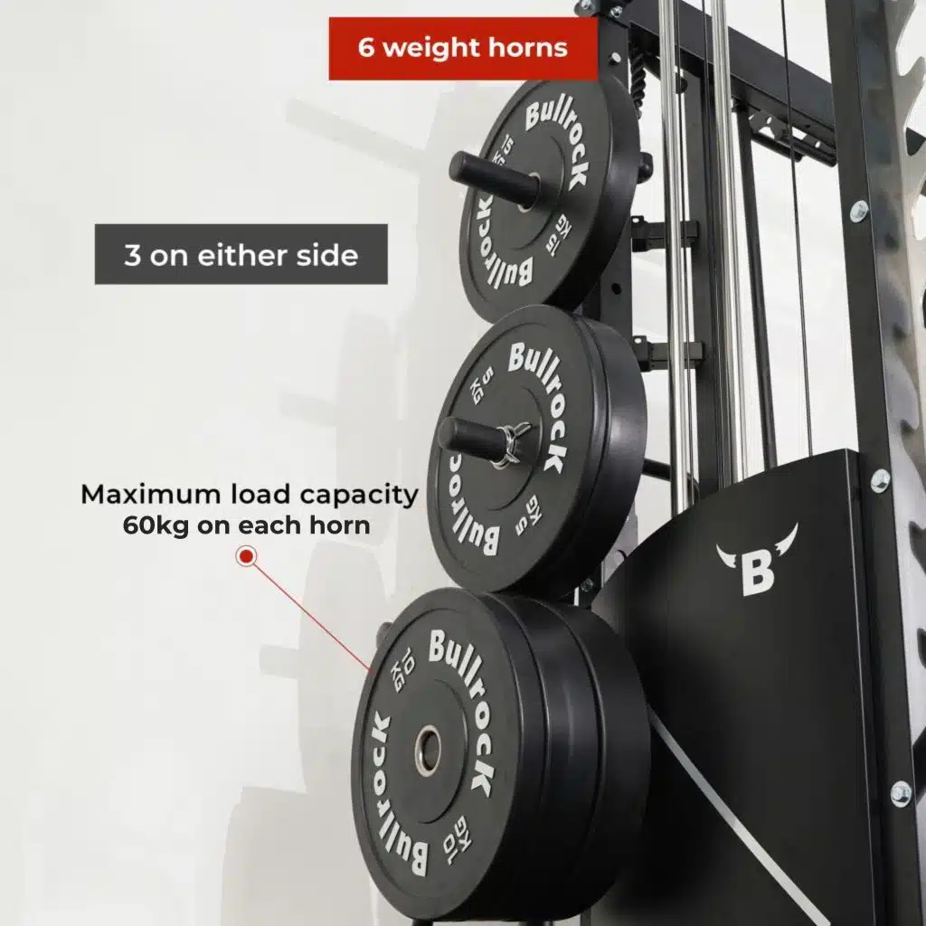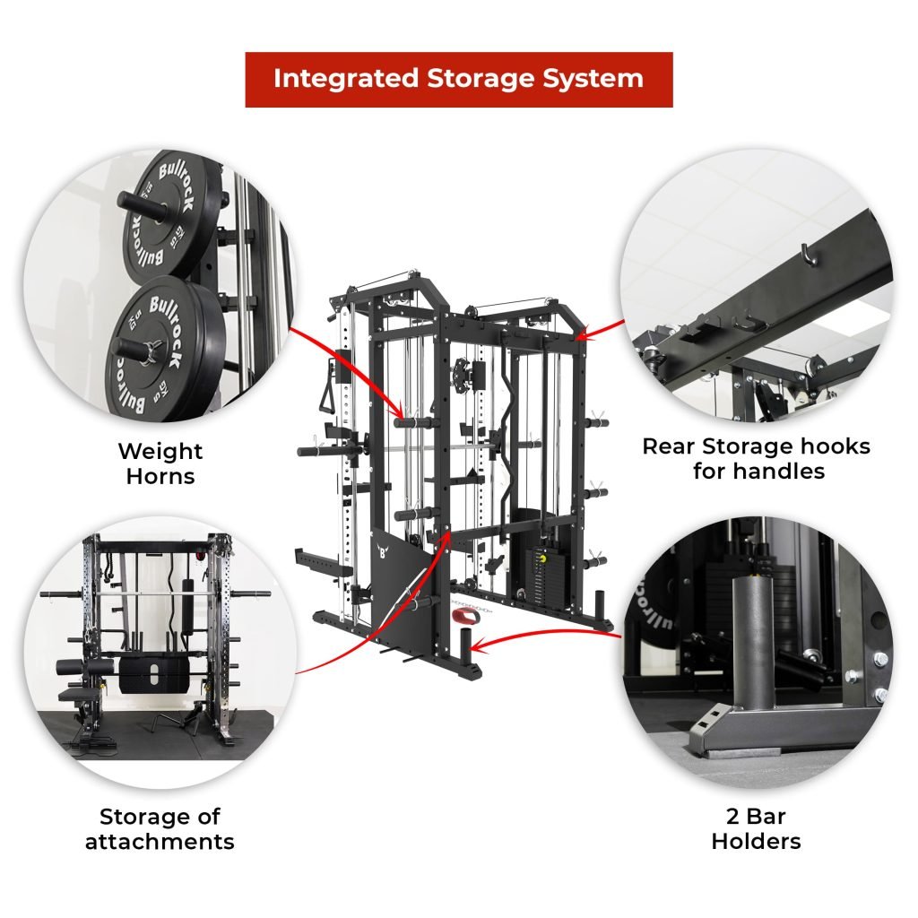 Lift Heavy, Get OX Strong 2:1 or 1:1 Patented Interchangeable cable pulley ratio system – Smith Bar Range Lock feature, Stainless Steel Toothed plate Smith Bar Diameter – 30mm Smith Bar Initial Weight – 14.5kg Suspension Trainer Hook can be used to attach suspension training straps, punching bag, and even resistance bands. Band Pegs for making the exercises more challenging with resistance bands. Organized Training Space Integrated Smart Storage System 6 Weight Horns 2 Bar Holders Rear Storage hooks for handles