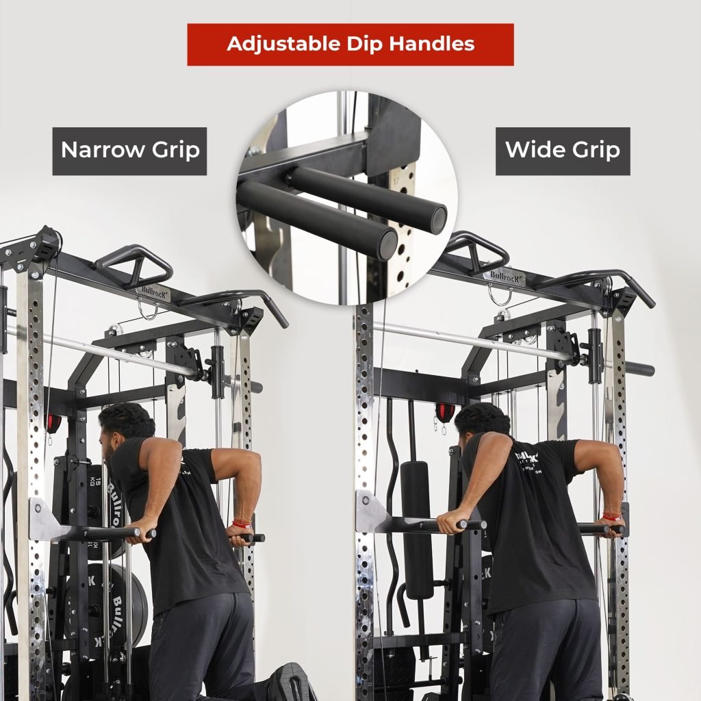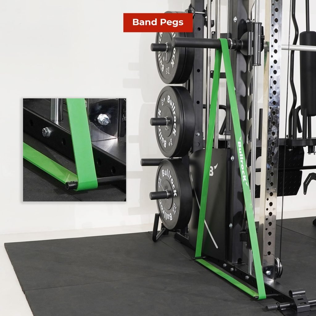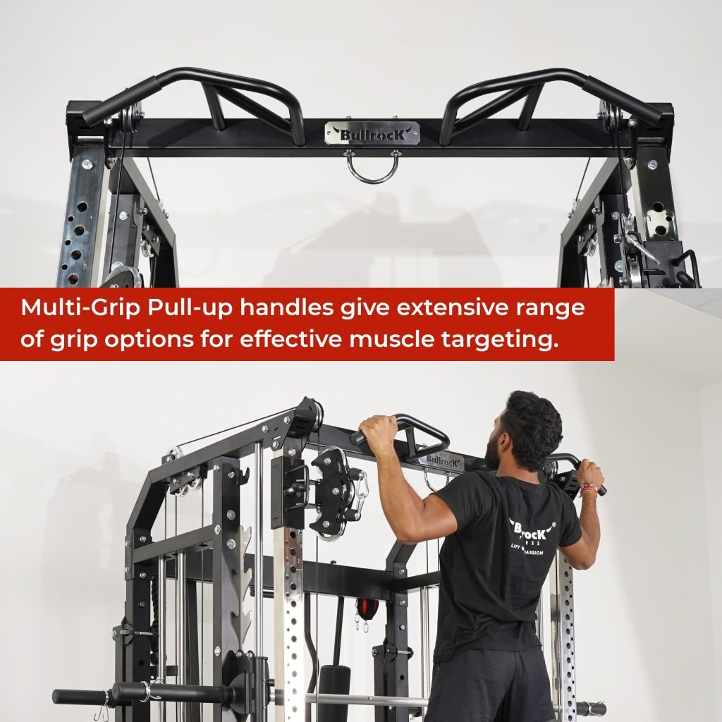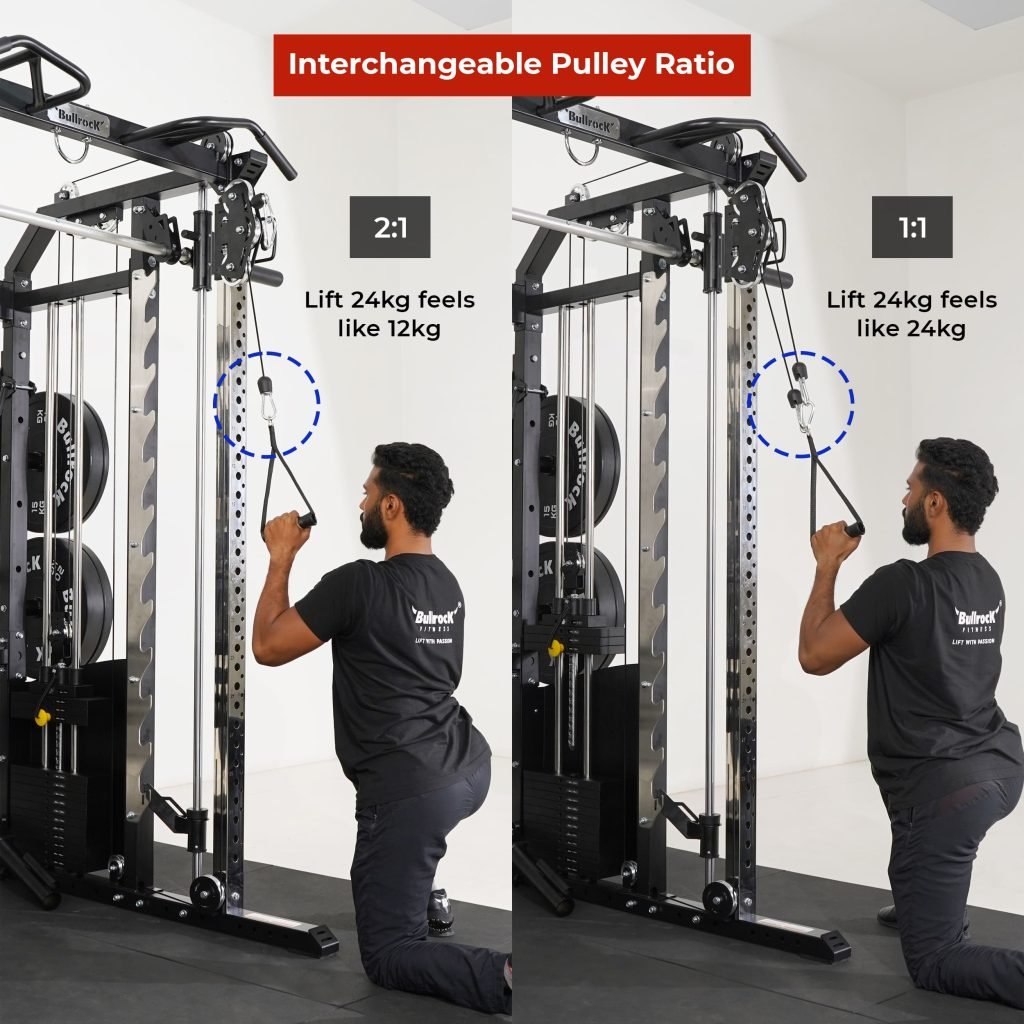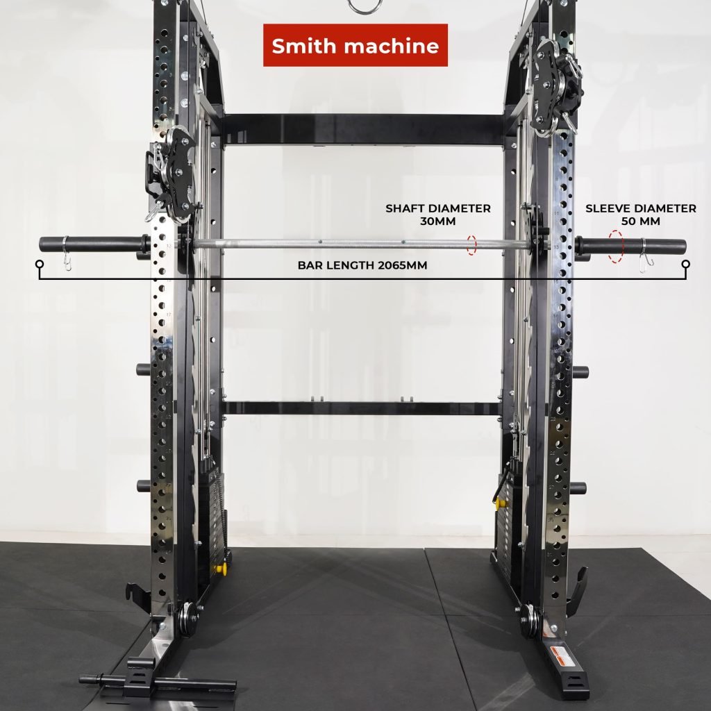 Lift Heavy, Get OX Strong 2:1 or 1:1 Patented Interchangeable cable pulley ratio system – Smith Bar Range Lock feature, Stainless Steel Toothed plate Smith Bar Diameter – 30mm Smith Bar Initial Weight – 14.5kg Suspension Trainer Hook can be used to attach suspension training straps, punching bag, and even resistance bands. Band Pegs for making the exercises more challenging with resistance bands. Organized Training Space Integrated Smart Storage System 6 Weight Horns 2 Bar Holders Rear Storage hooks for handles