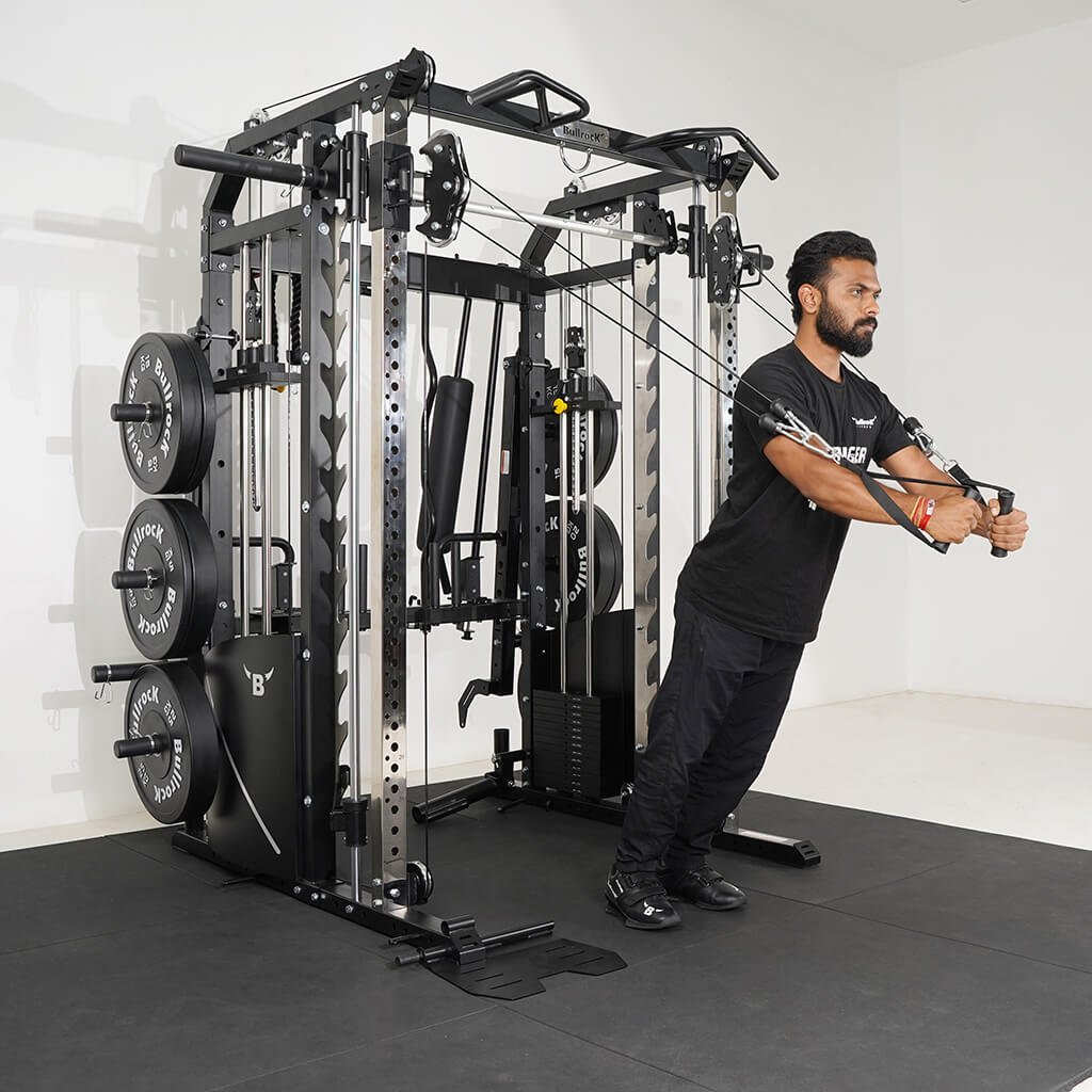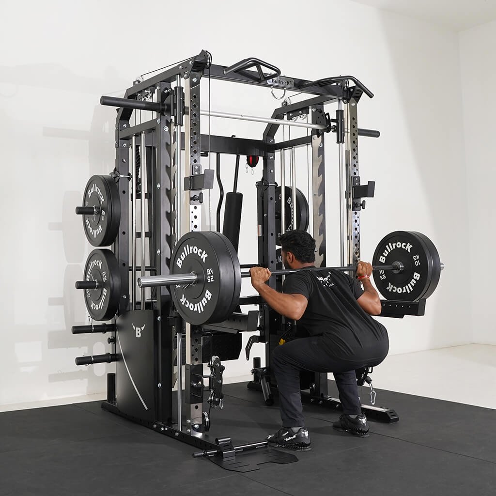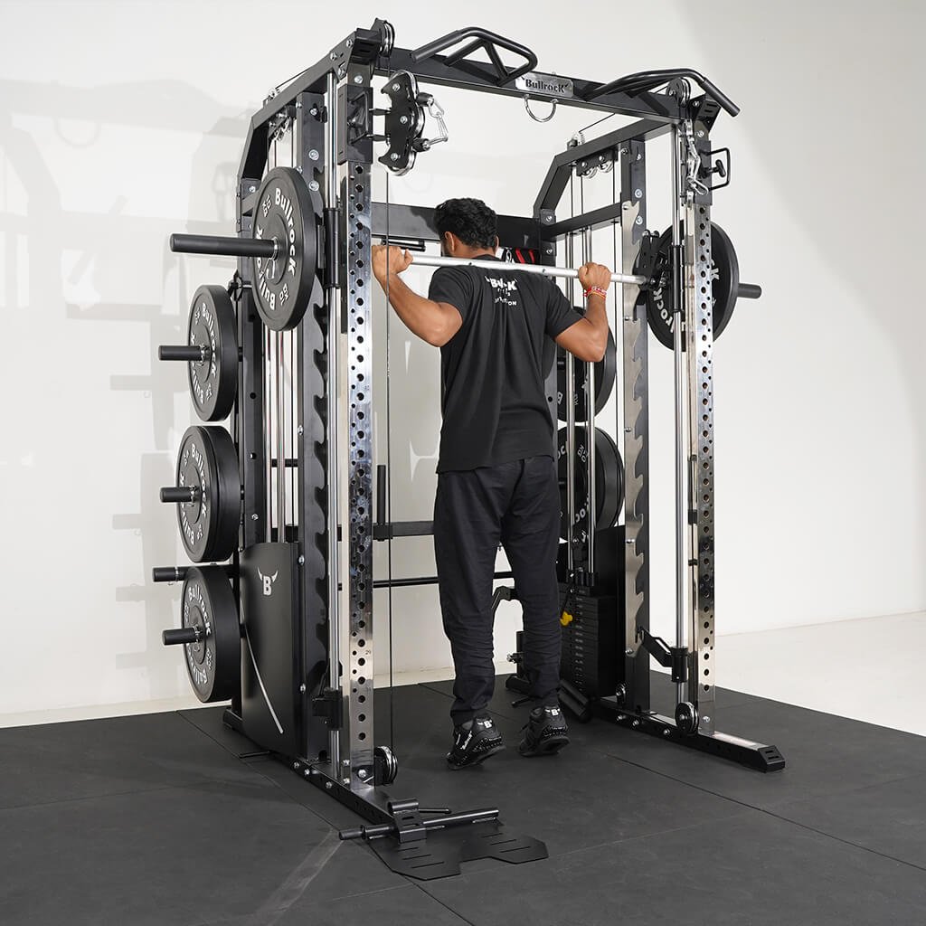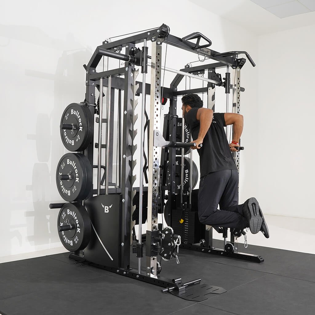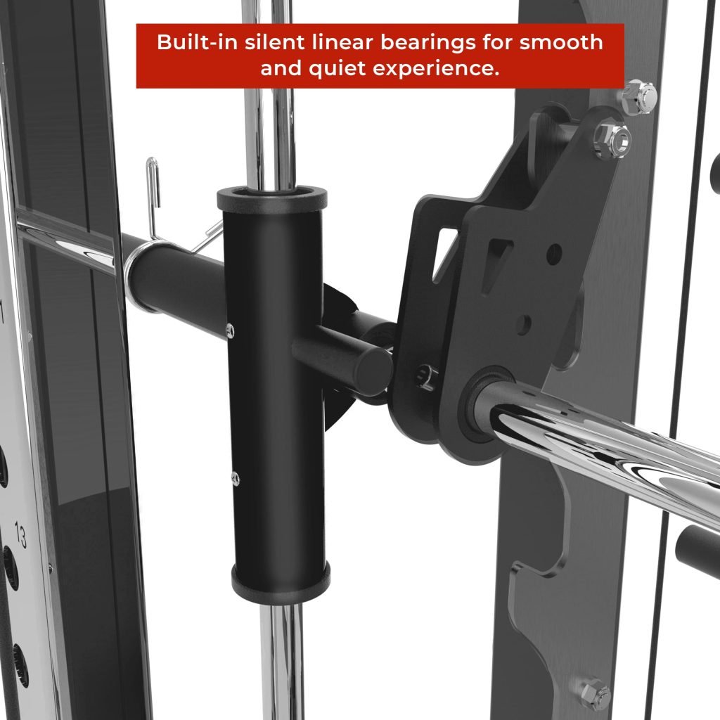 Lift Heavy, Get OX Strong 2:1 or 1:1 Patented Interchangeable cable pulley ratio system – Smith Bar Range Lock feature, Stainless Steel Toothed plate Smith Bar Diameter – 30mm Smith Bar Initial Weight – 14.5kg Suspension Trainer Hook can be used to attach suspension training straps, punching bag, and even resistance bands. Band Pegs for making the exercises more challenging with resistance bands. Organized Training Space Integrated Smart Storage System 6 Weight Horns 2 Bar Holders Rear Storage hooks for handles