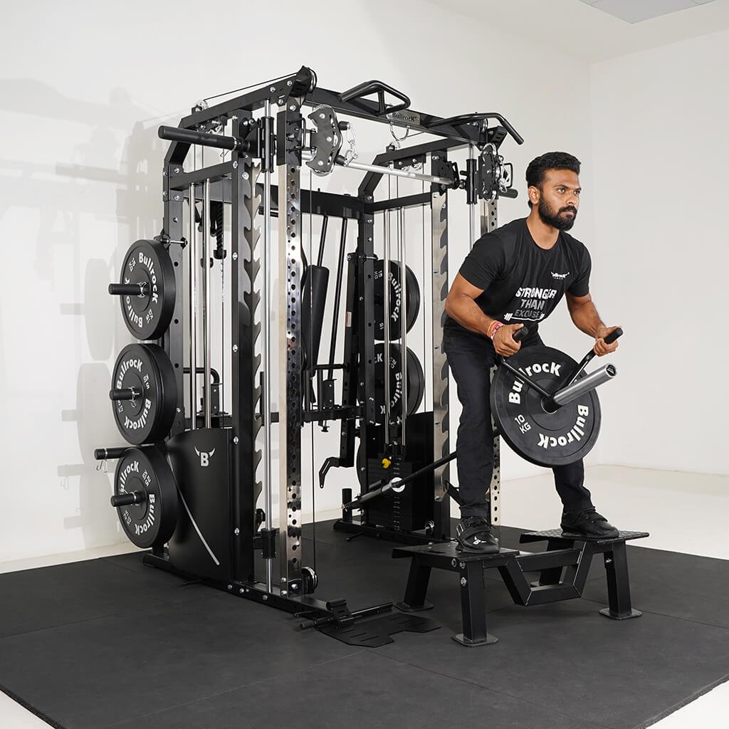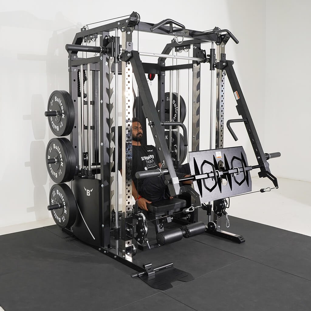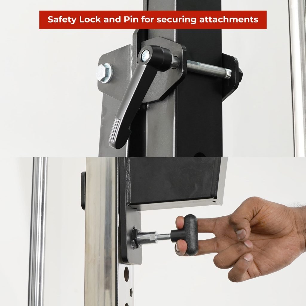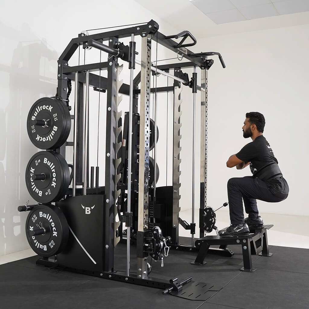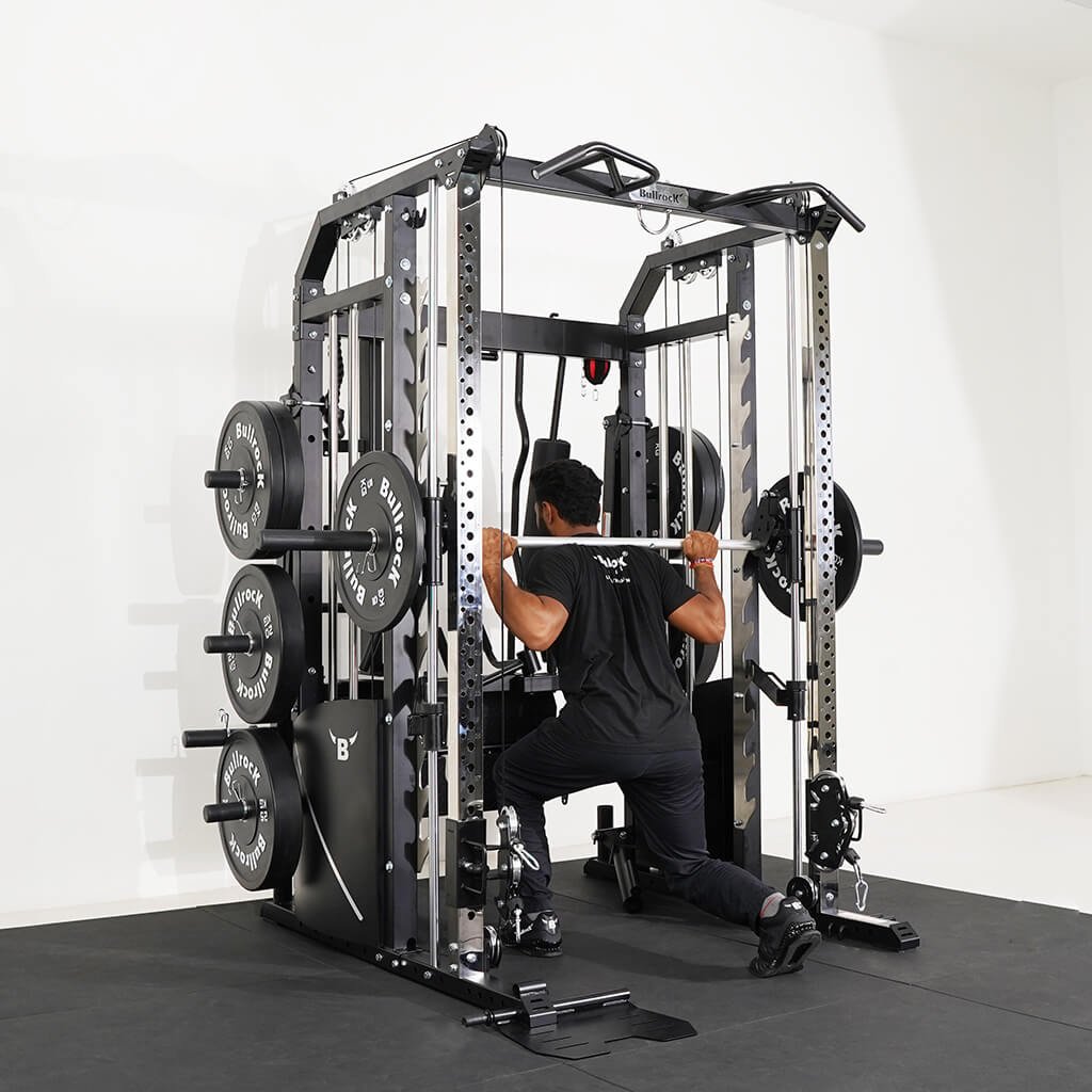 Lift Heavy, Get OX Strong 2:1 or 1:1 Patented Interchangeable cable pulley ratio system – Smith Bar Range Lock feature, Stainless Steel Toothed plate Smith Bar Diameter – 30mm Smith Bar Initial Weight – 14.5kg Suspension Trainer Hook can be used to attach suspension training straps, punching bag, and even resistance bands. Band Pegs for making the exercises more challenging with resistance bands. Organized Training Space Integrated Smart Storage System 6 Weight Horns 2 Bar Holders Rear Storage hooks for handles