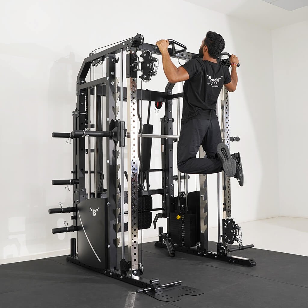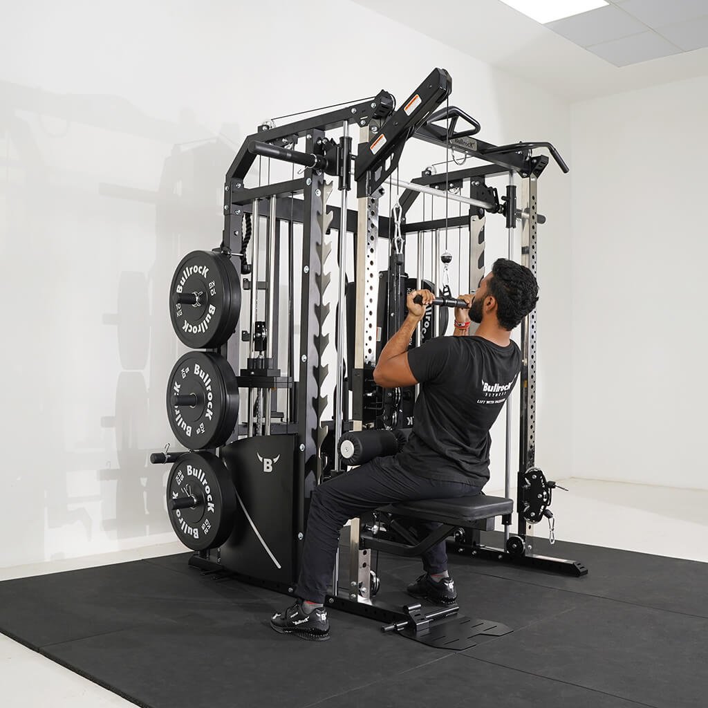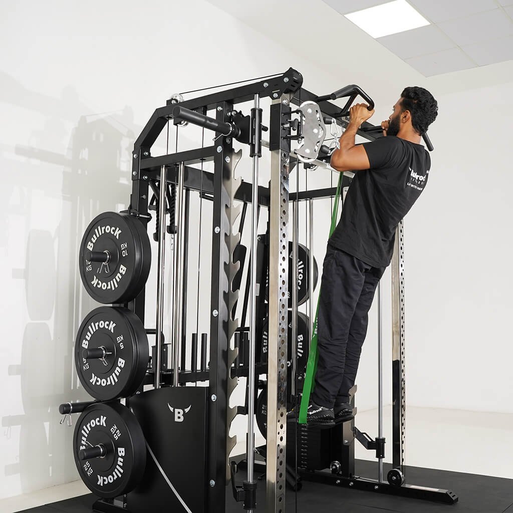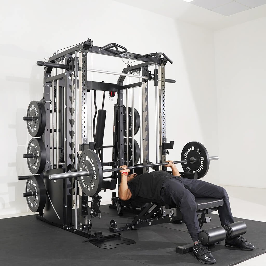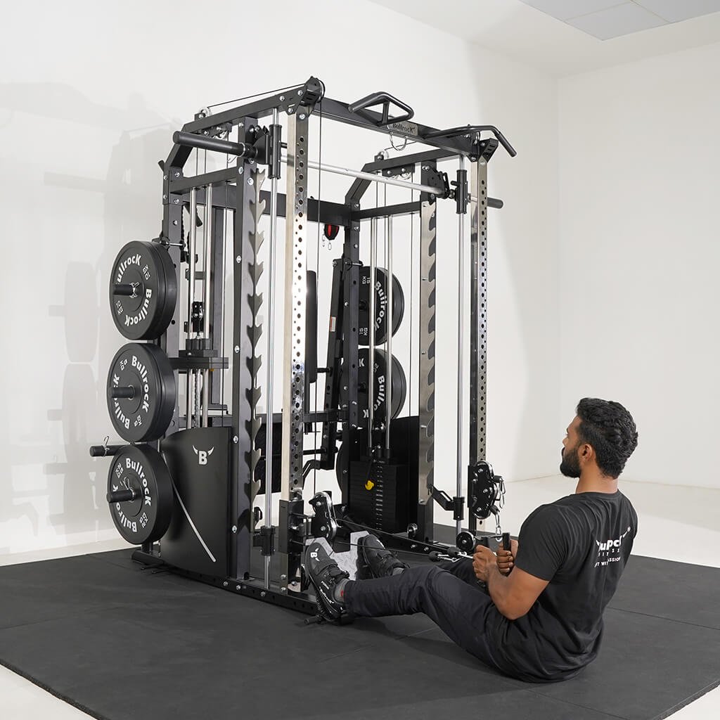 Lift Heavy, Get OX Strong 2:1 or 1:1 Patented Interchangeable cable pulley ratio system – Smith Bar Range Lock feature, Stainless Steel Toothed plate Smith Bar Diameter – 30mm Smith Bar Initial Weight – 14.5kg Suspension Trainer Hook can be used to attach suspension training straps, punching bag, and even resistance bands. Band Pegs for making the exercises more challenging with resistance bands. Organized Training Space Integrated Smart Storage System 6 Weight Horns 2 Bar Holders Rear Storage hooks for handles