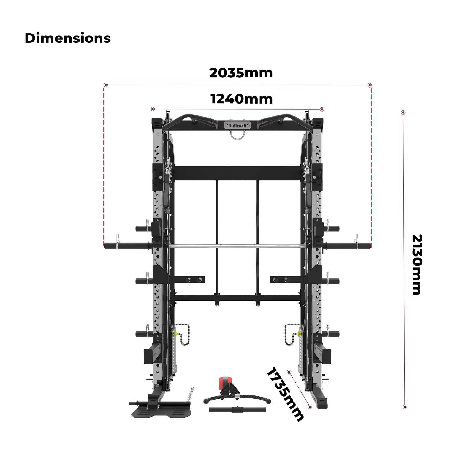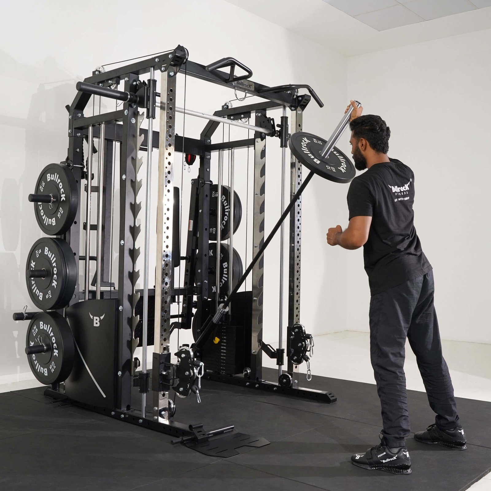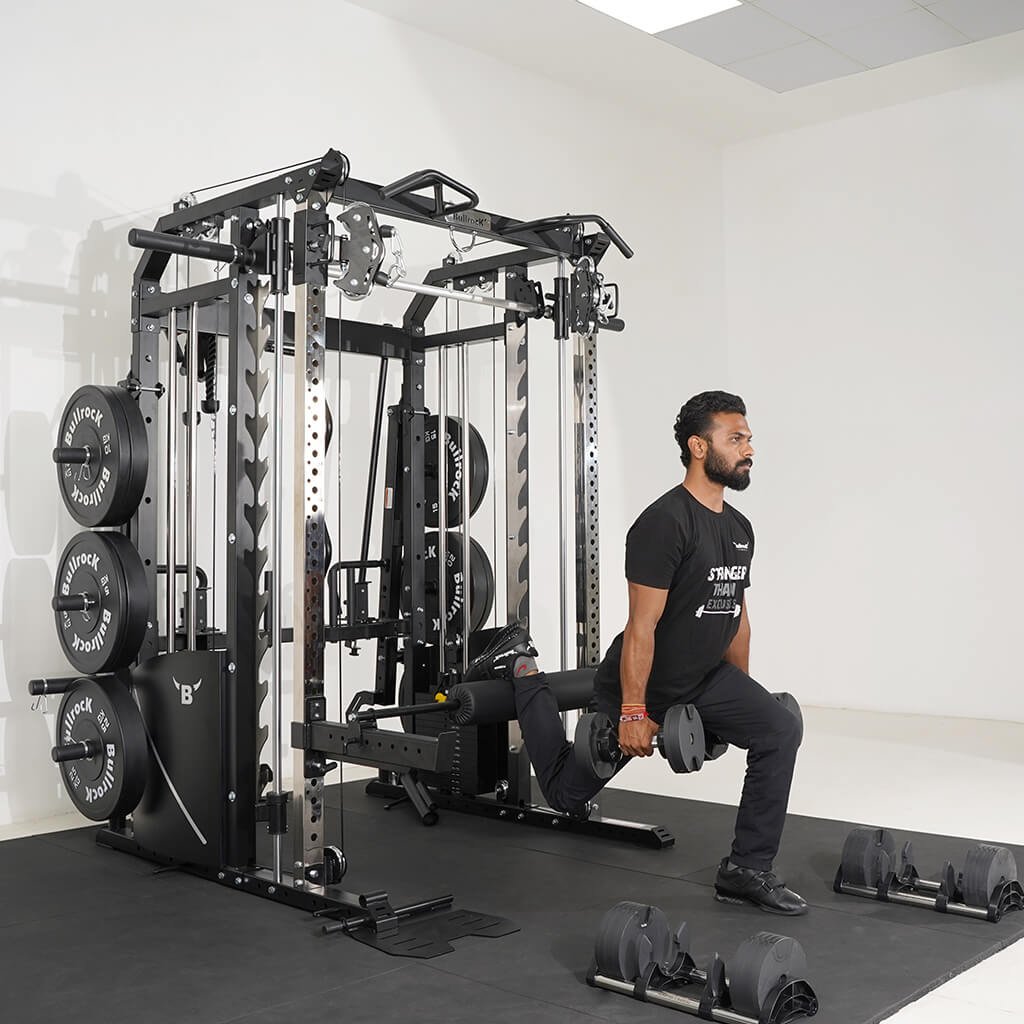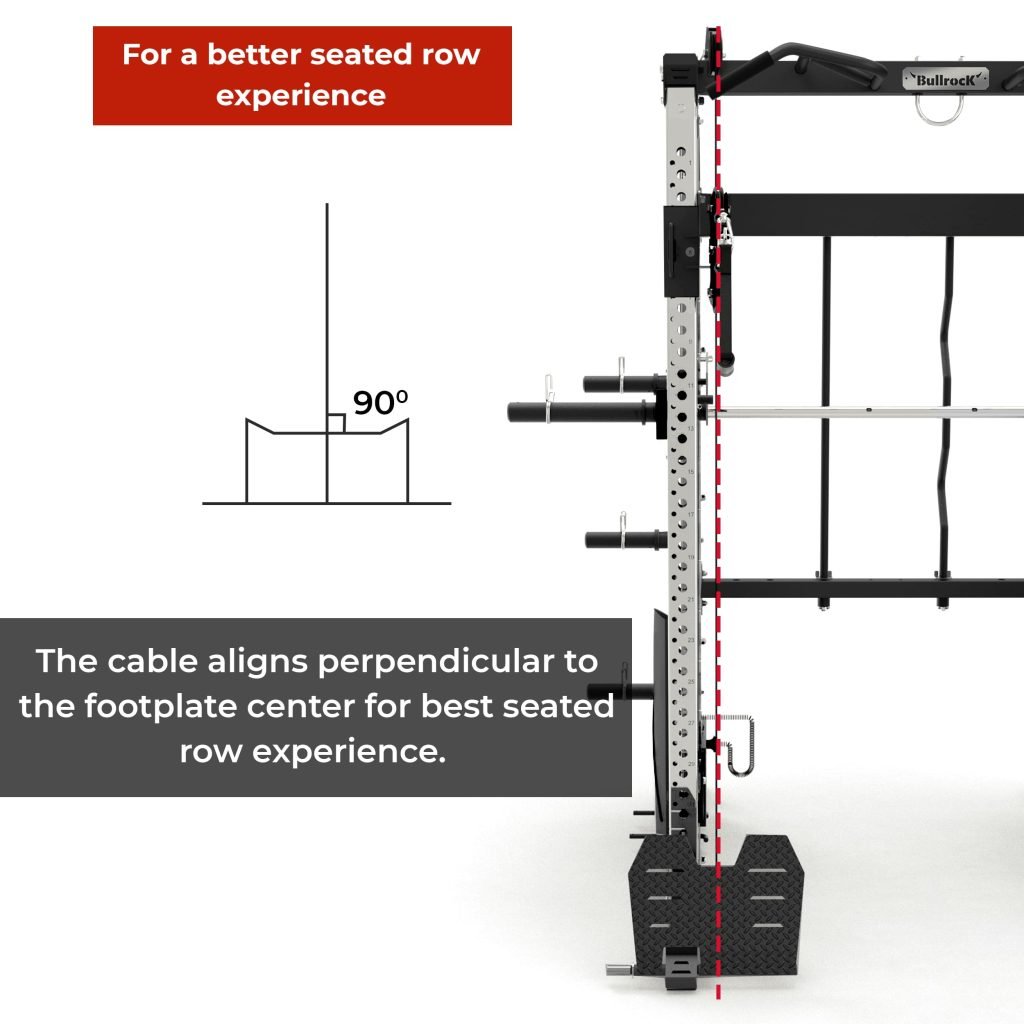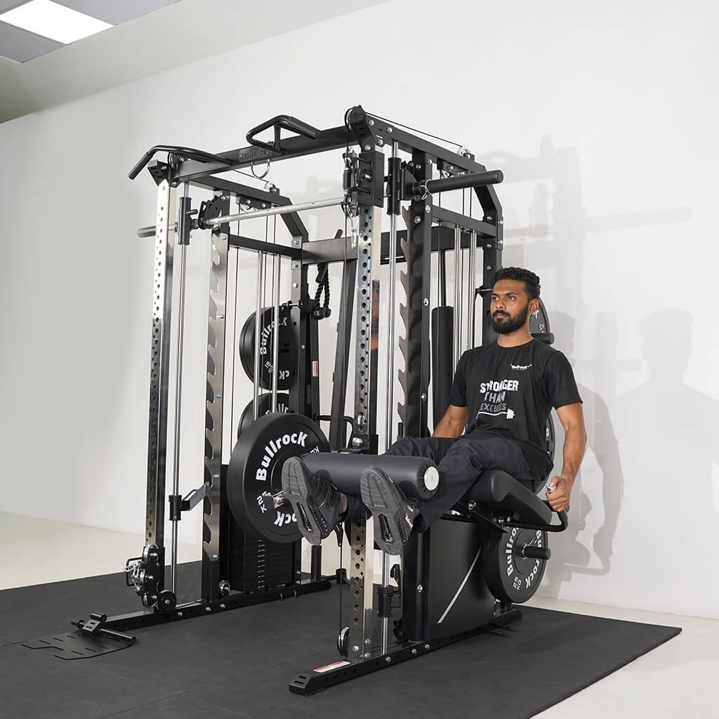 Lift Heavy, Get OX Strong 2:1 or 1:1 Patented Interchangeable cable pulley ratio system – Smith Bar Range Lock feature, Stainless Steel Toothed plate Smith Bar Diameter – 30mm Smith Bar Initial Weight – 14.5kg Suspension Trainer Hook can be used to attach suspension training straps, punching bag, and even resistance bands. Band Pegs for making the exercises more challenging with resistance bands. Organized Training Space Integrated Smart Storage System 6 Weight Horns 2 Bar Holders Rear Storage hooks for handles