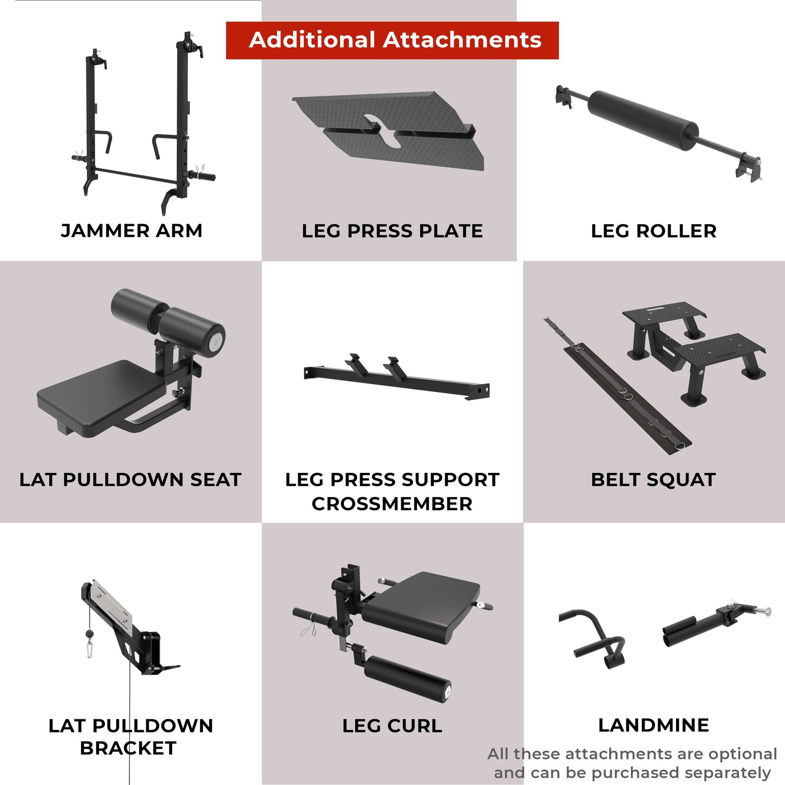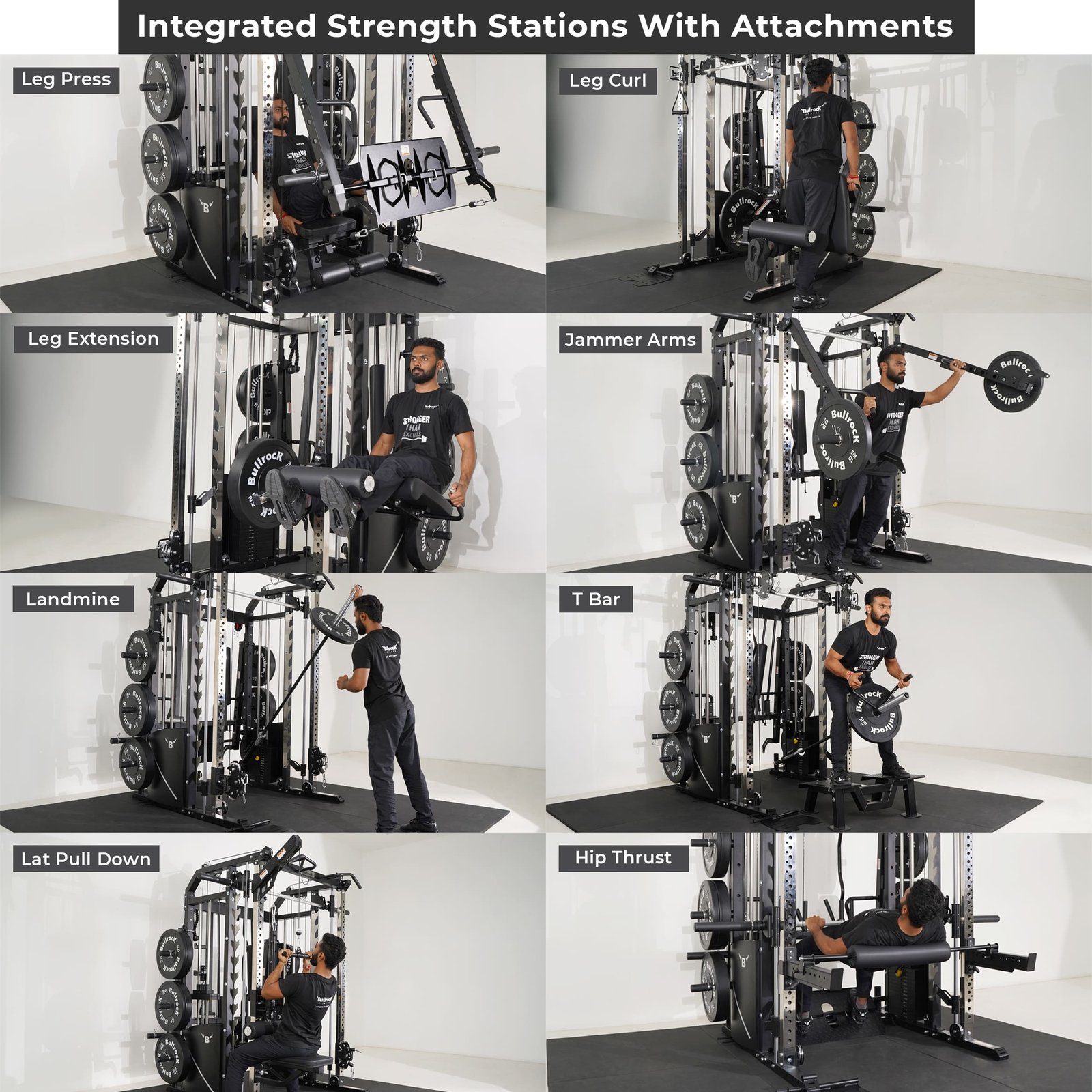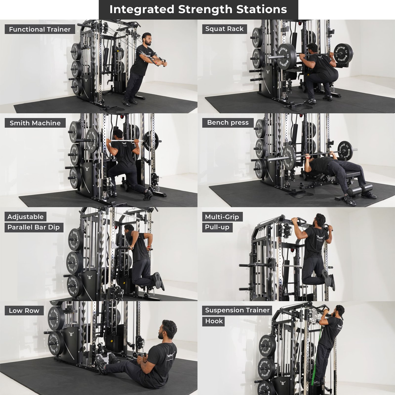 The Ox Pro 11 combines a Squat Rack, Functional Trainer, Smith Machine, Adjustable Dip Station, Low Row, Multi-Grip Pull-up Station and Suspension Trainer Hook in the footprint of a single power rack. With optional attachments, you can add nine more training station options without increasing the footprint!