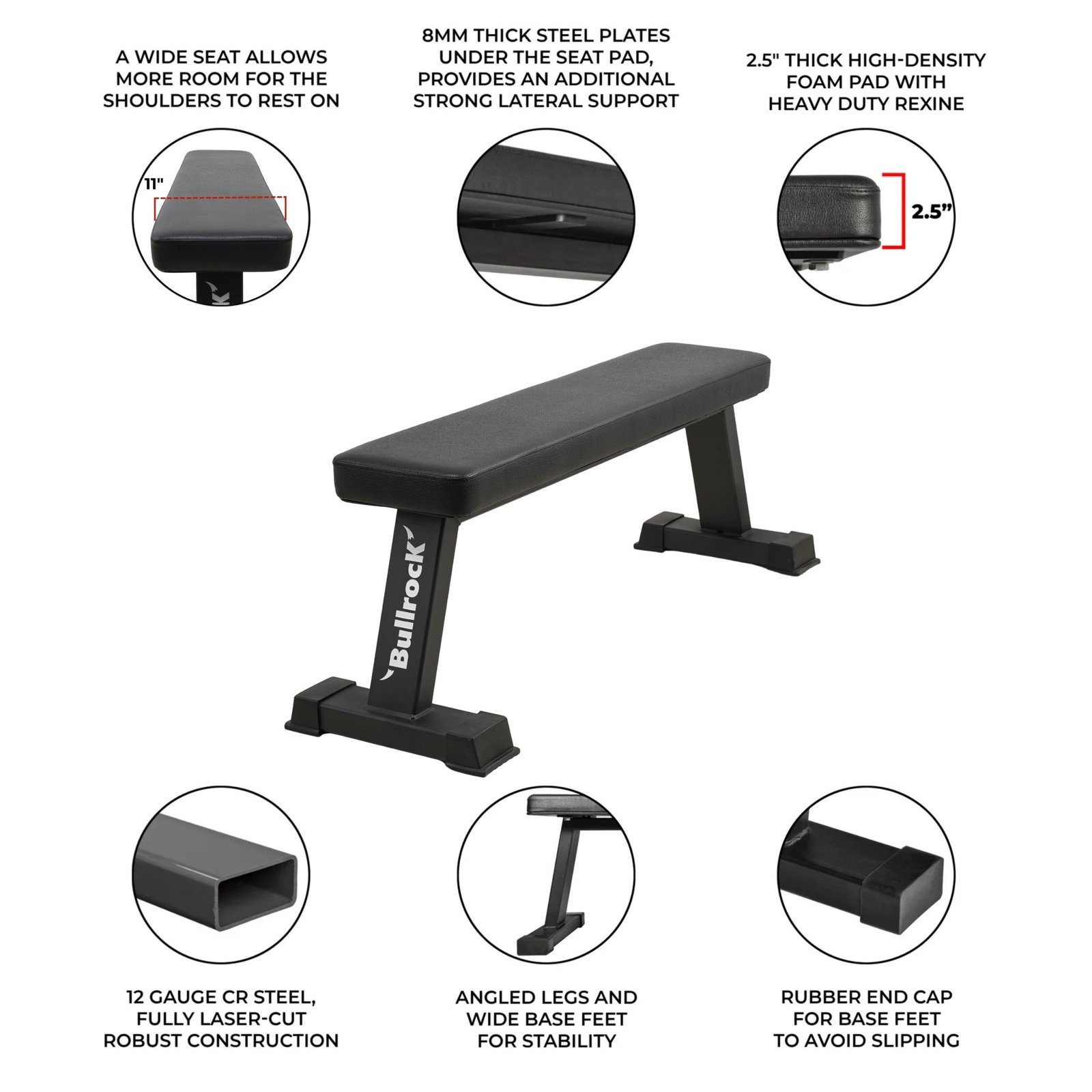 • Commercial-grade flat bench built with laser-cut 11-gauge CR steel