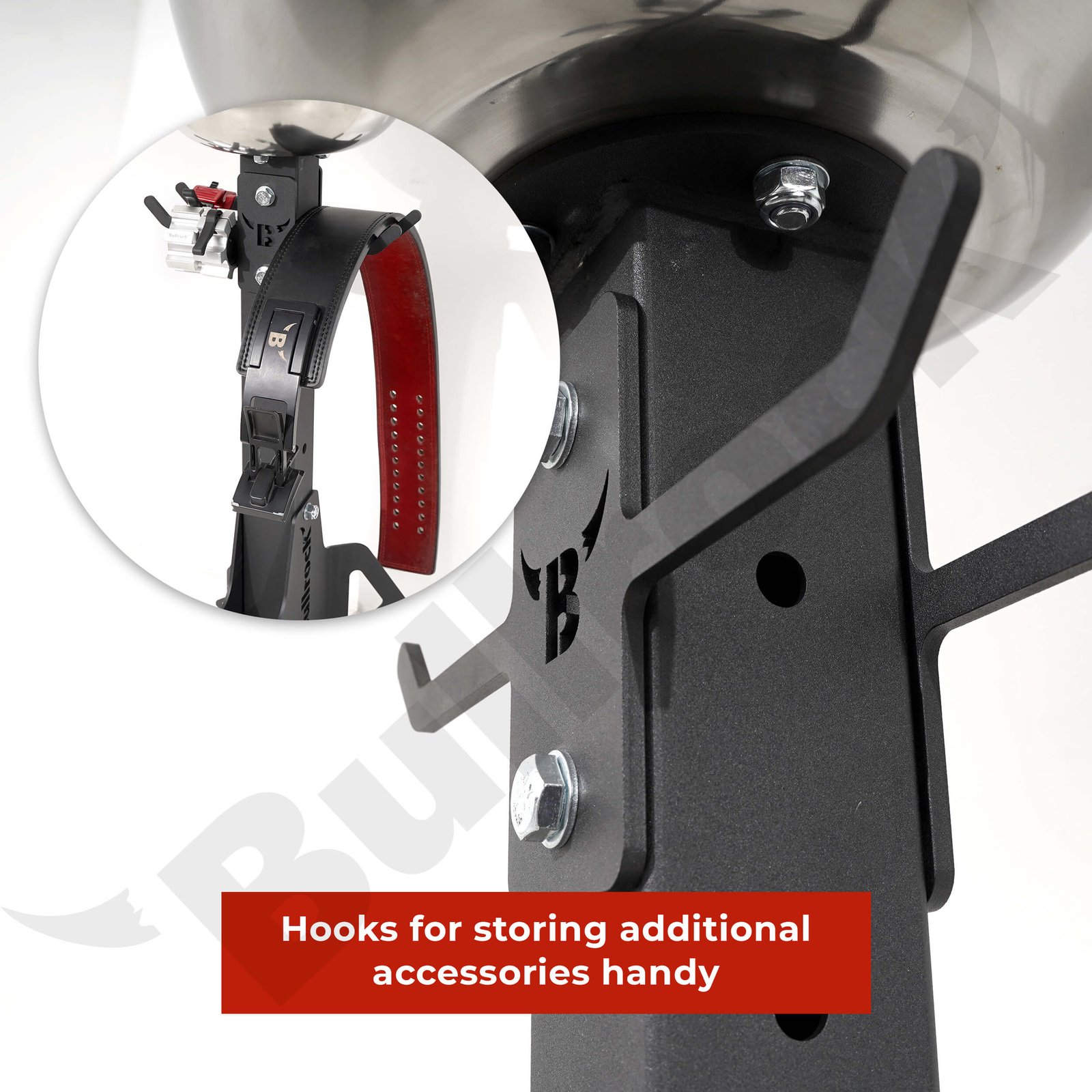 It has 6mm thick steel hooks below the bowl to store some additional accessories such as belts, resistance bands, collars etc, which can come handy during workouts.