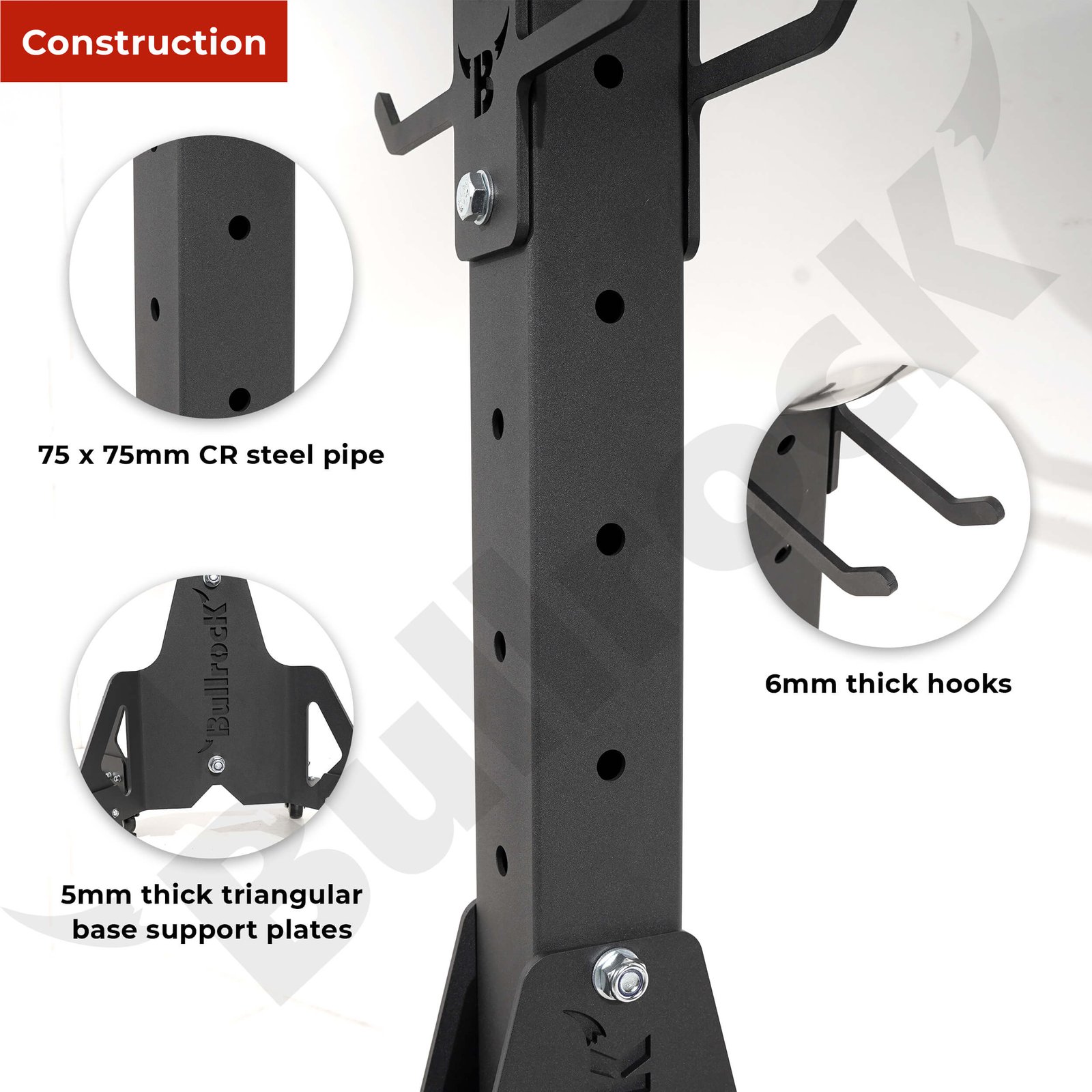 Constructed from 75 X 75mm steel pipe, it has 5mm triangular base support plates and takes a footprint of 482 x 482mm.