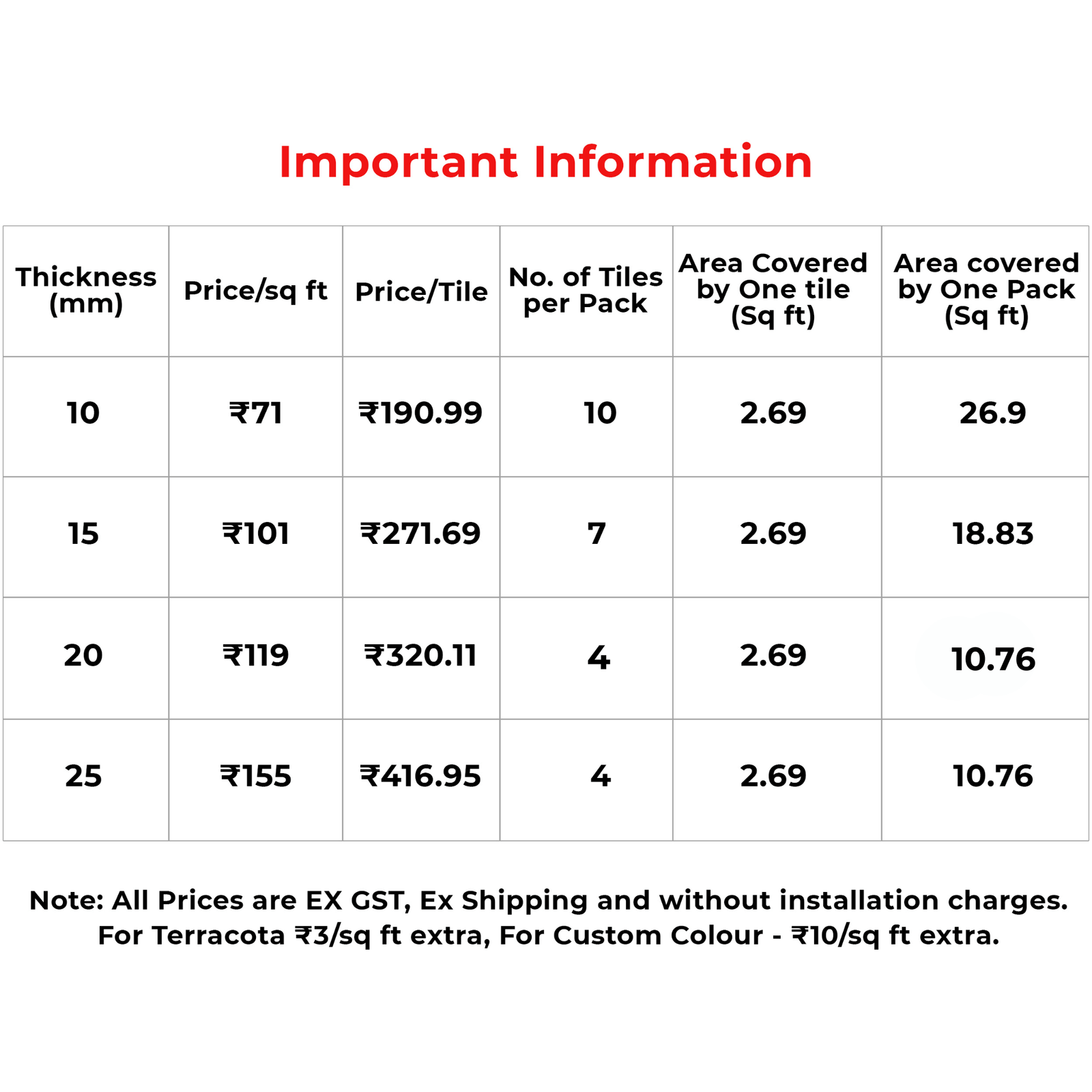 - The area covered by one tile is 2.69sqft/0.25sqm.