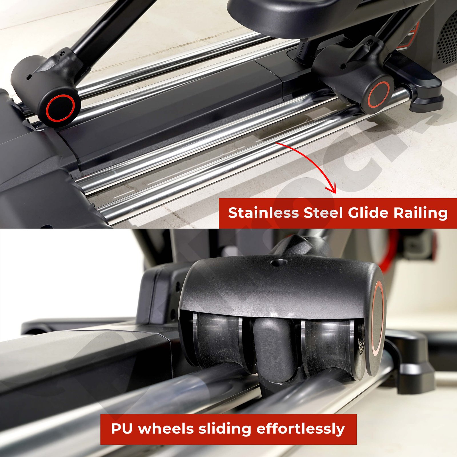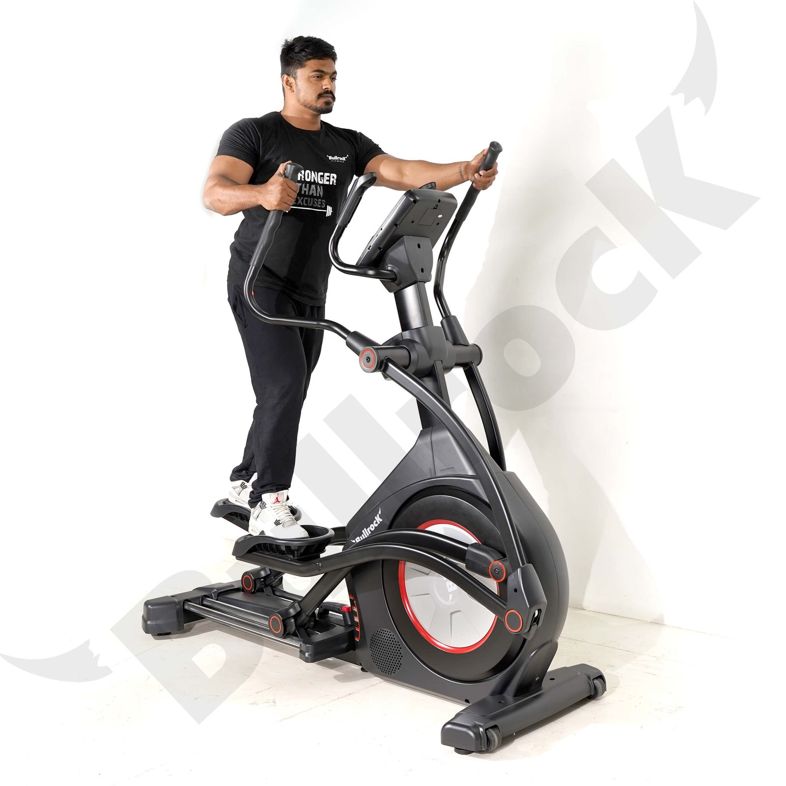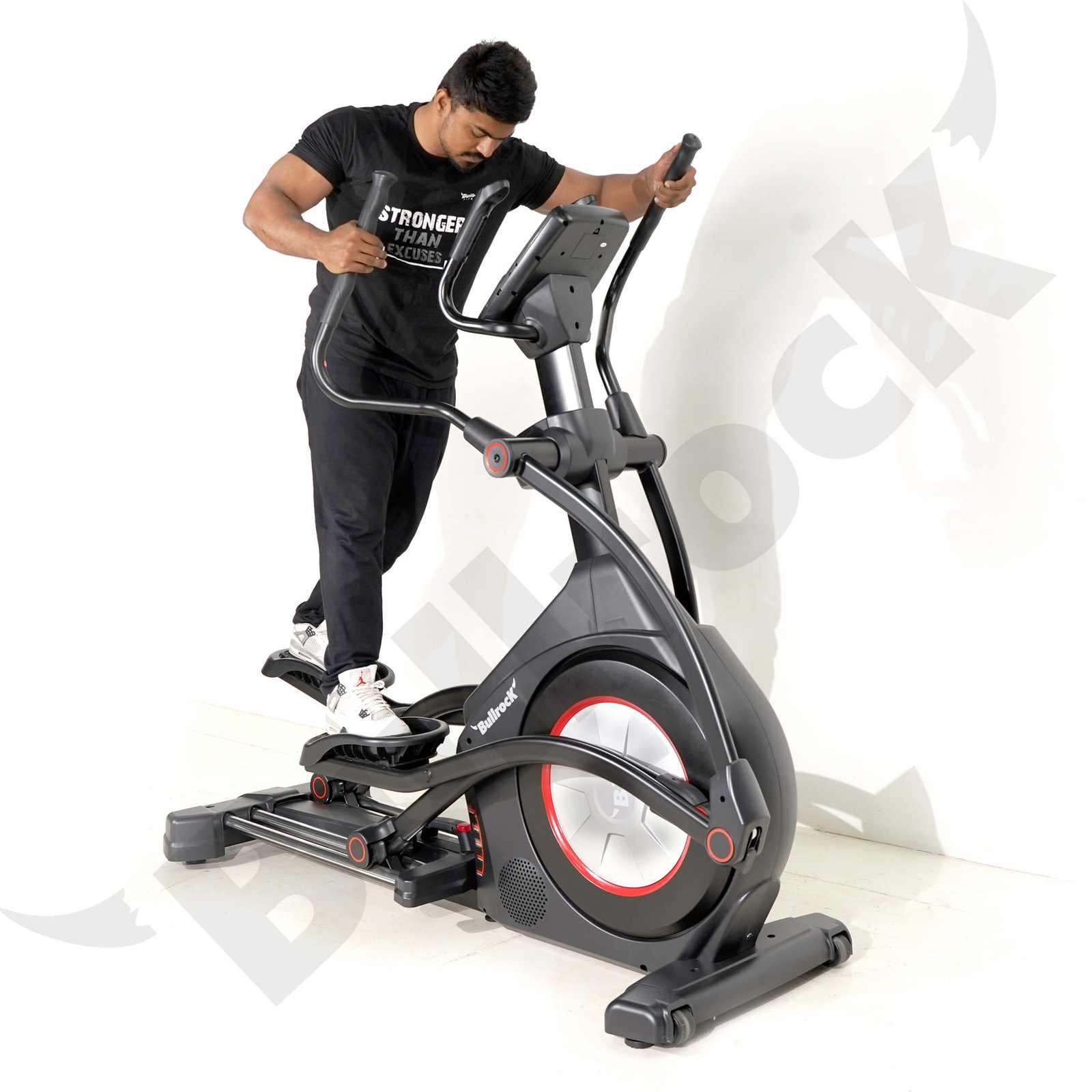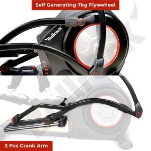 This gym elliptical is power efficient with its self generating 7kg flywheel, low powdered display. The 3 piece crank arm offers a smooth gliding motion over optimally spaced railings ensuring stability in rotation movements, with the PU wheels. The textured pedals attached to the crank have abundant surface area to place your feet comfortably.