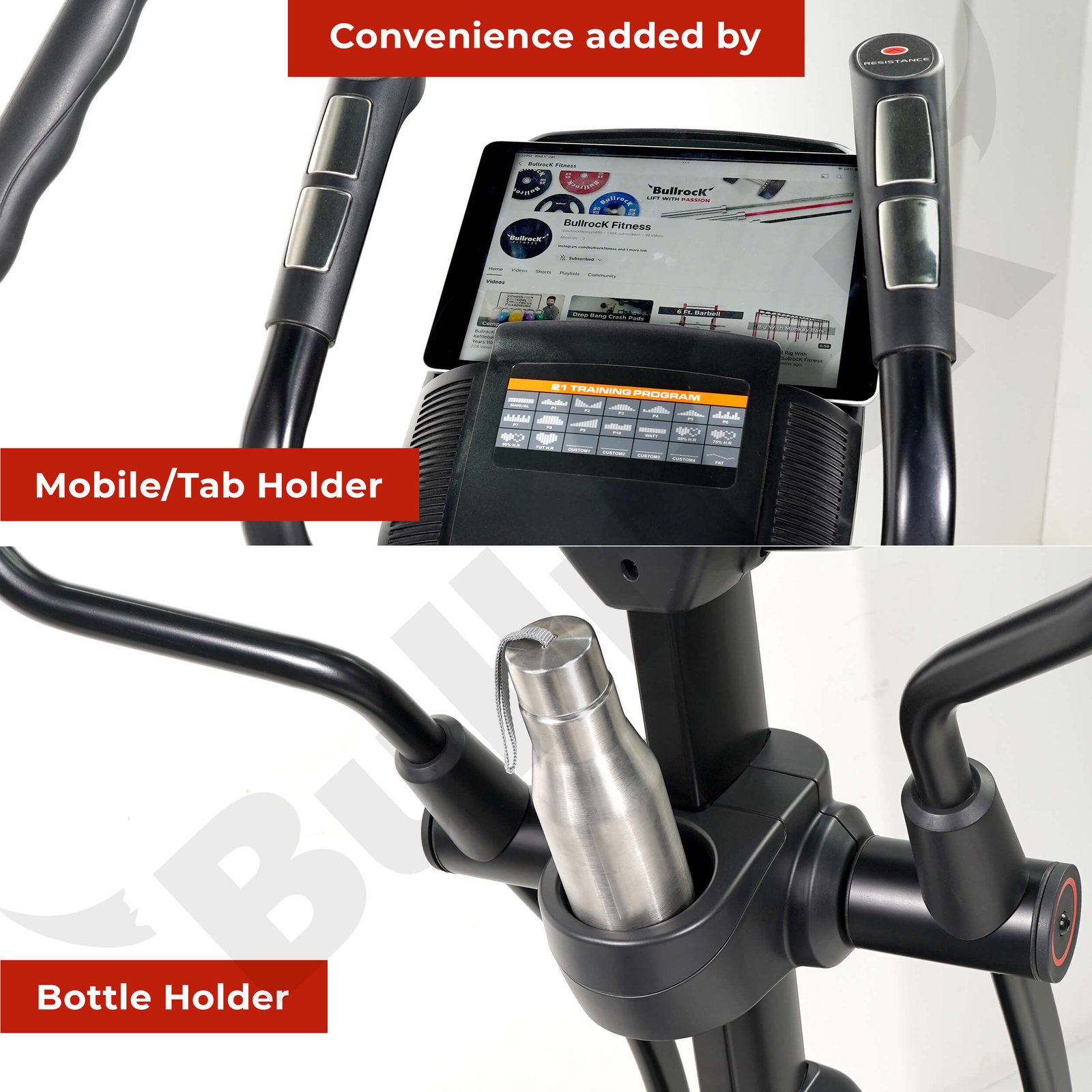 LED 5 Windows powered display makes it a user-friendly elliptical to track your time, distance, calories burned, and heart rate in real-time. The intuitive interface also offers preset workout programs and the ability to set your routines. The bottle holder and mobile holders add a convenience factor.