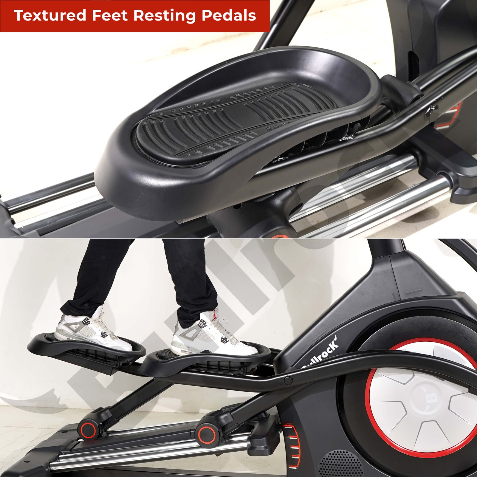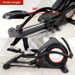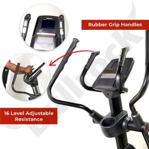 You leap to a 20″ stride on this with a 16 level adjustable resistance, which can be controlled from the handles itself. The handle offers a multi grip and attached pulse sensors to track your metrics effectively. The handle bars are foam coated for a firm grip.