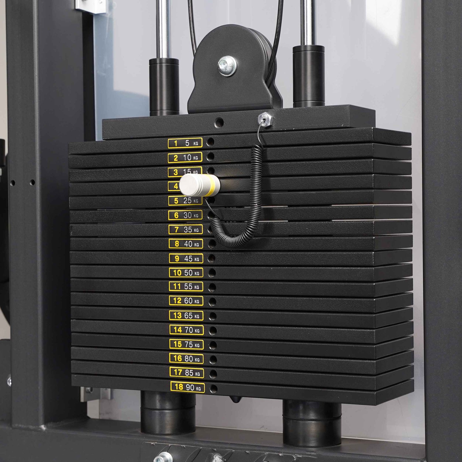 CNC machined precision steel weight stack – 5kg incremental, top stack plate is fitted with self-lubricating bushings.