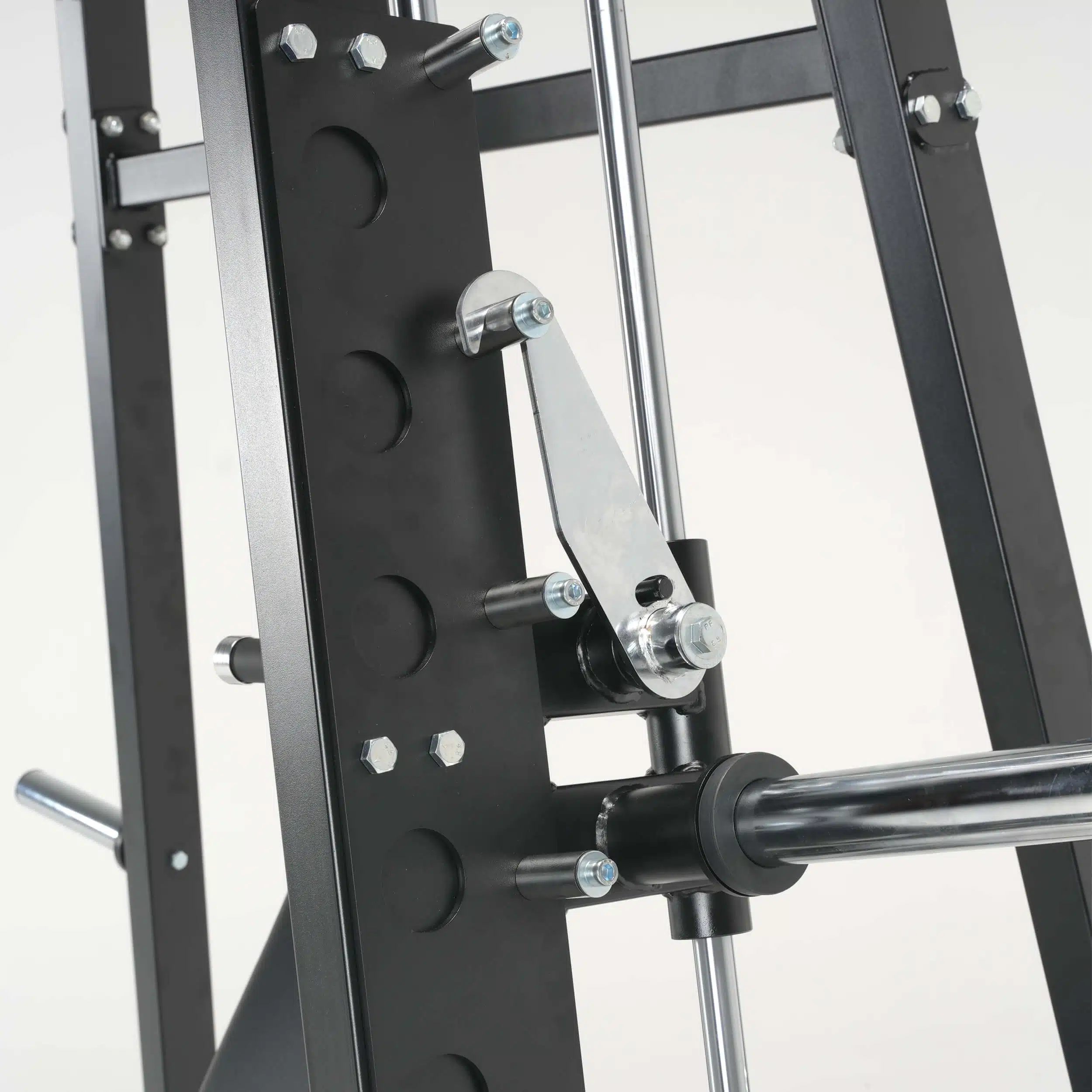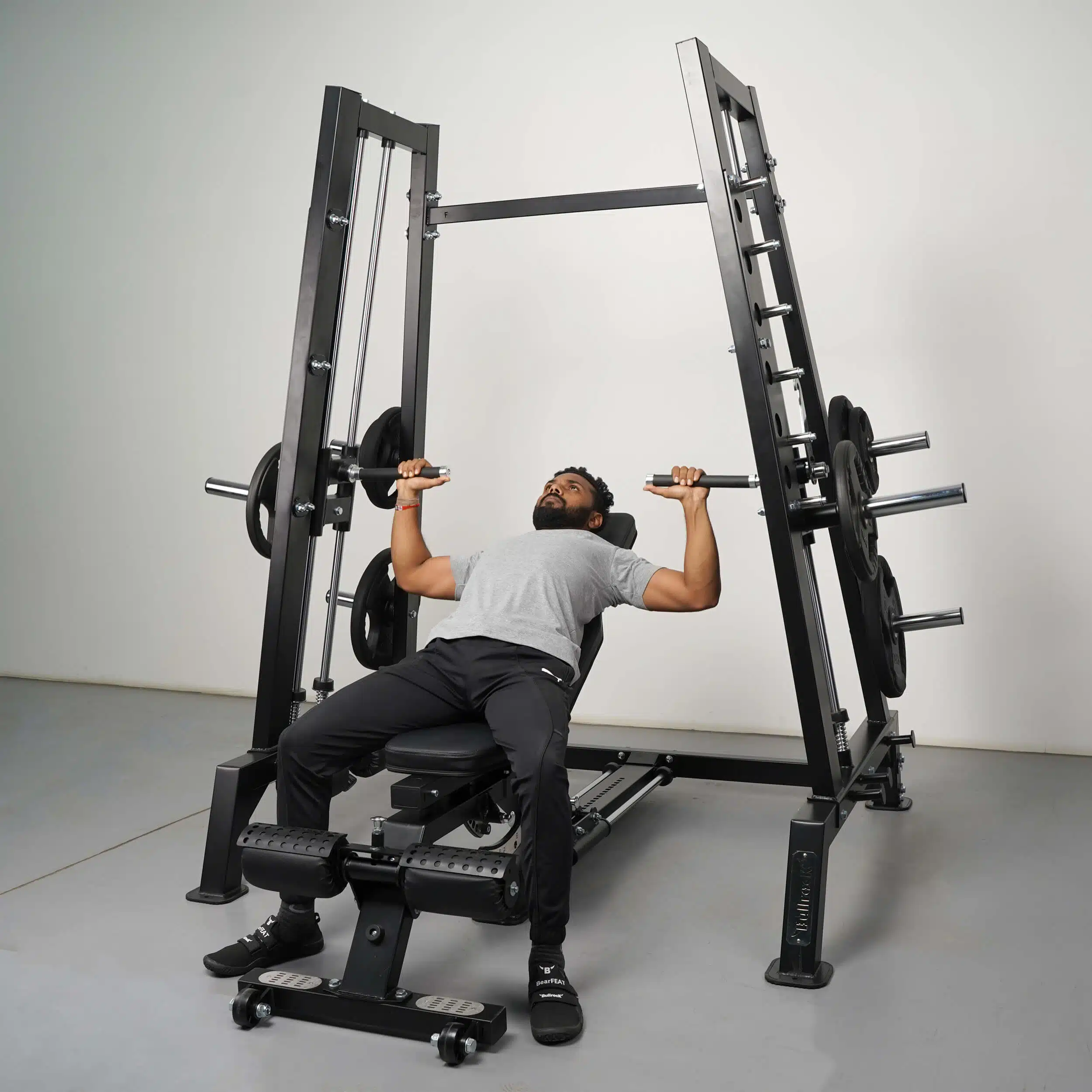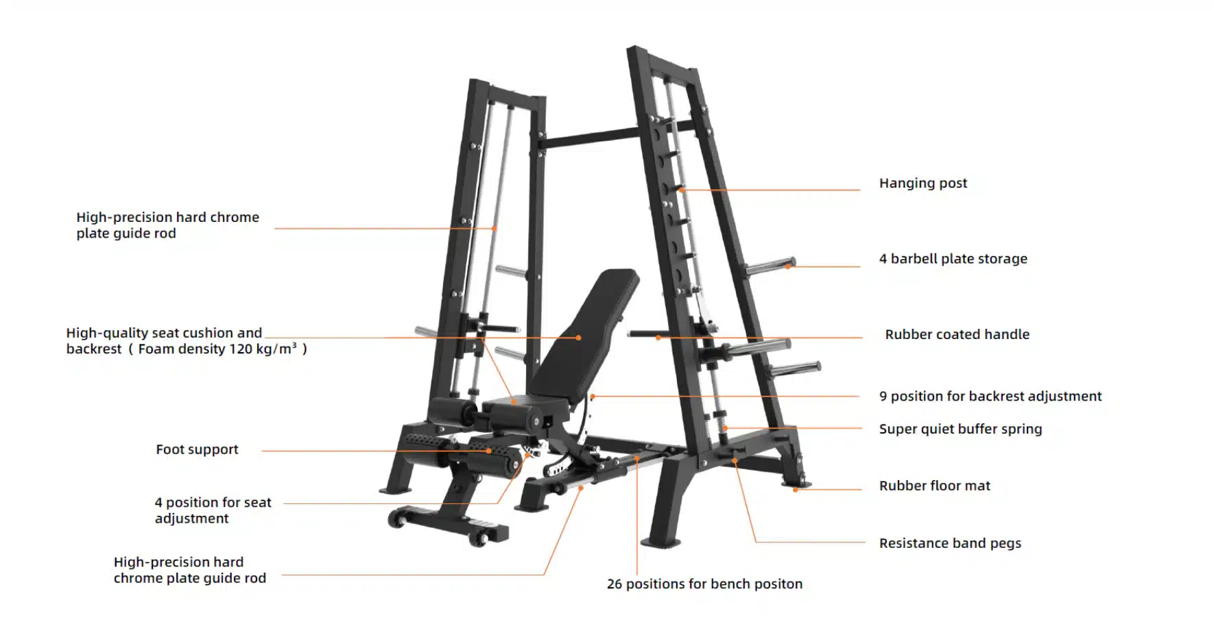 The integrated adjustable bench offers exceptional adjustments to create tailored settings for users. Robust construction, smooth smith movement by linear bearings.