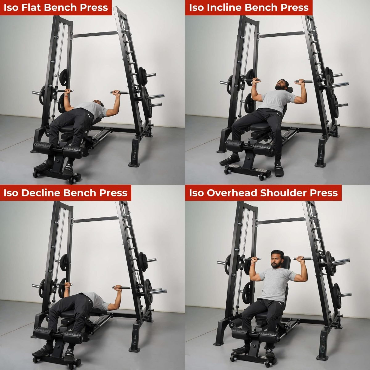 The Gladiator enables you to do different pressing movements to target major muscle groups Isolaterly, primarily focusing on chest, shoulder and triceps.