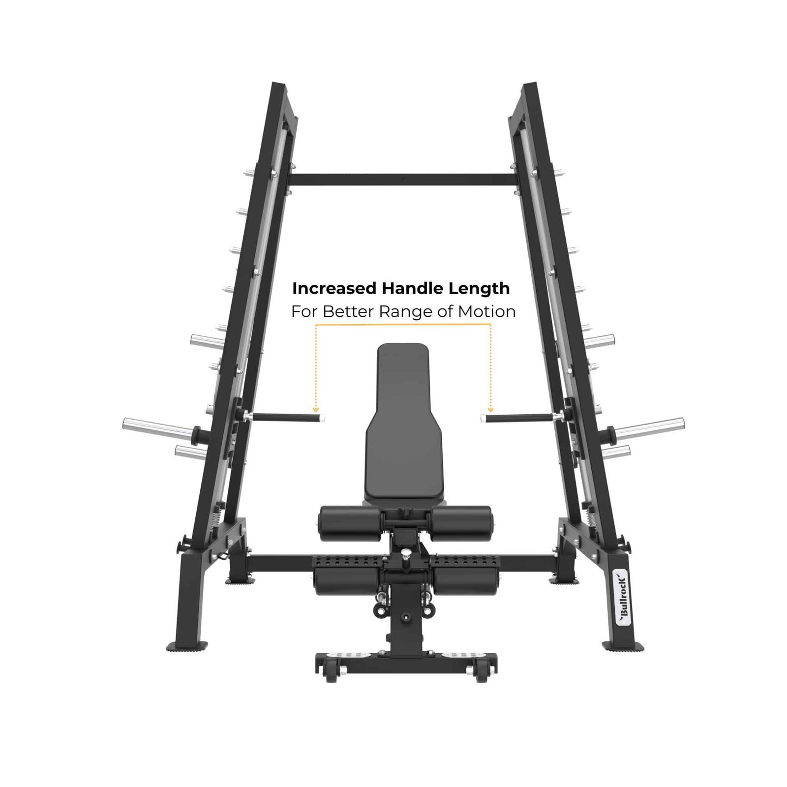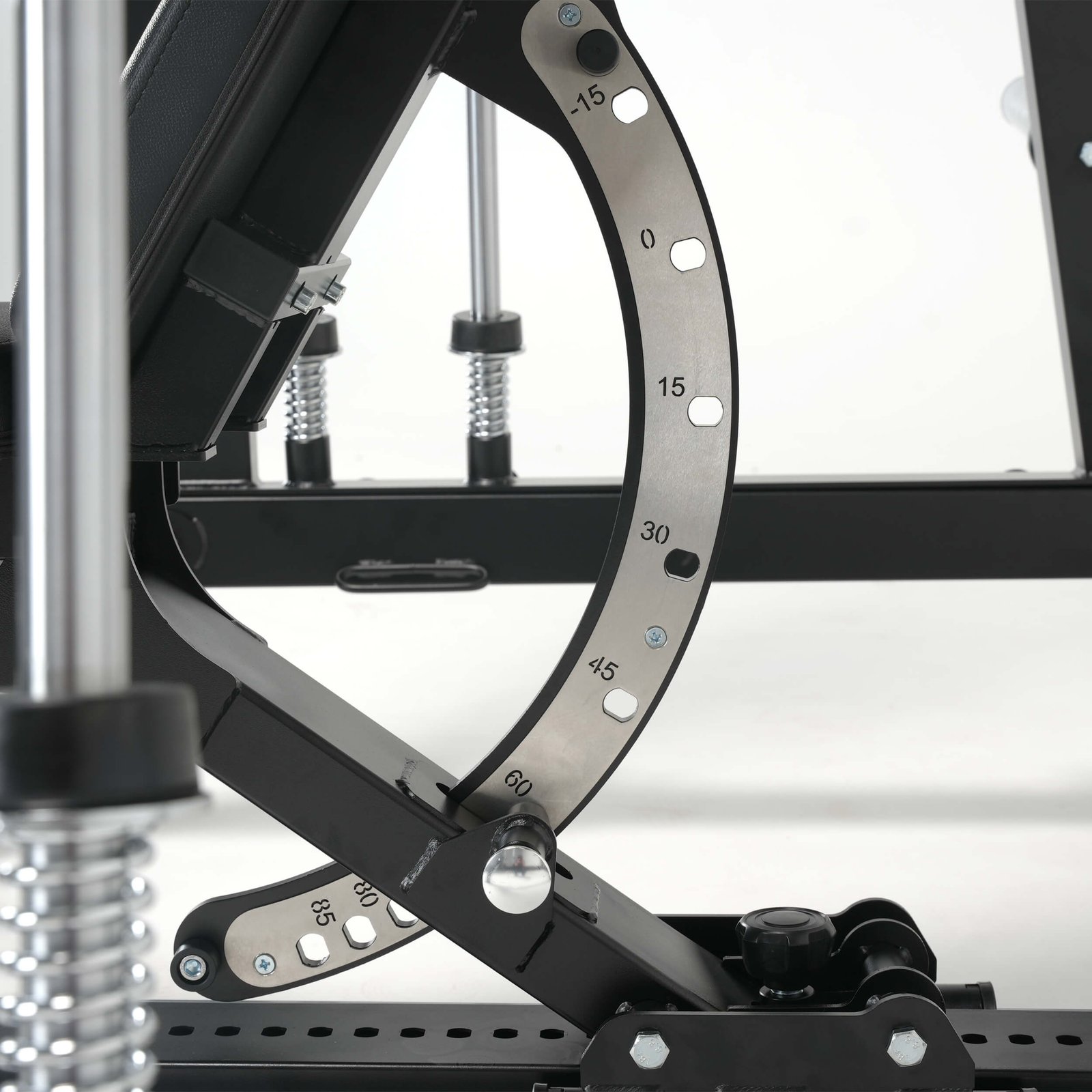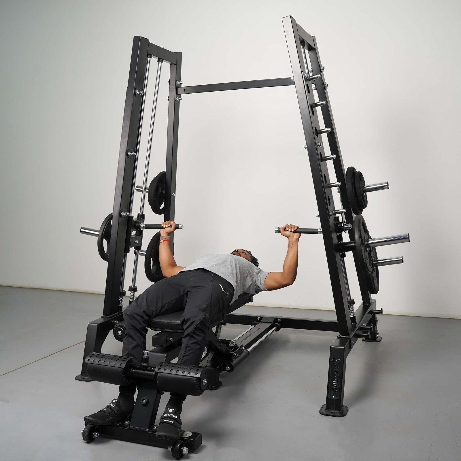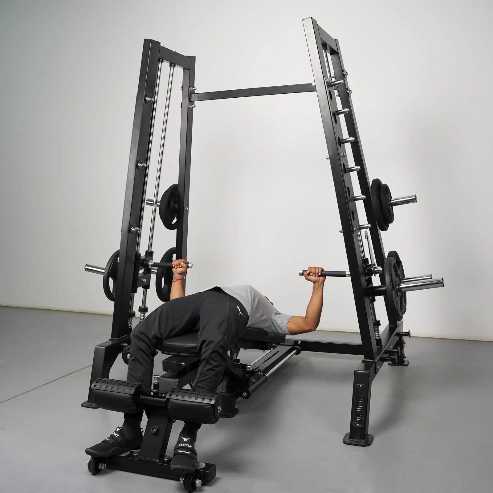 The integrated adjustable bench offers exceptional adjustments to create tailored settings for users. Robust construction, smooth smith movement by linear bearings.