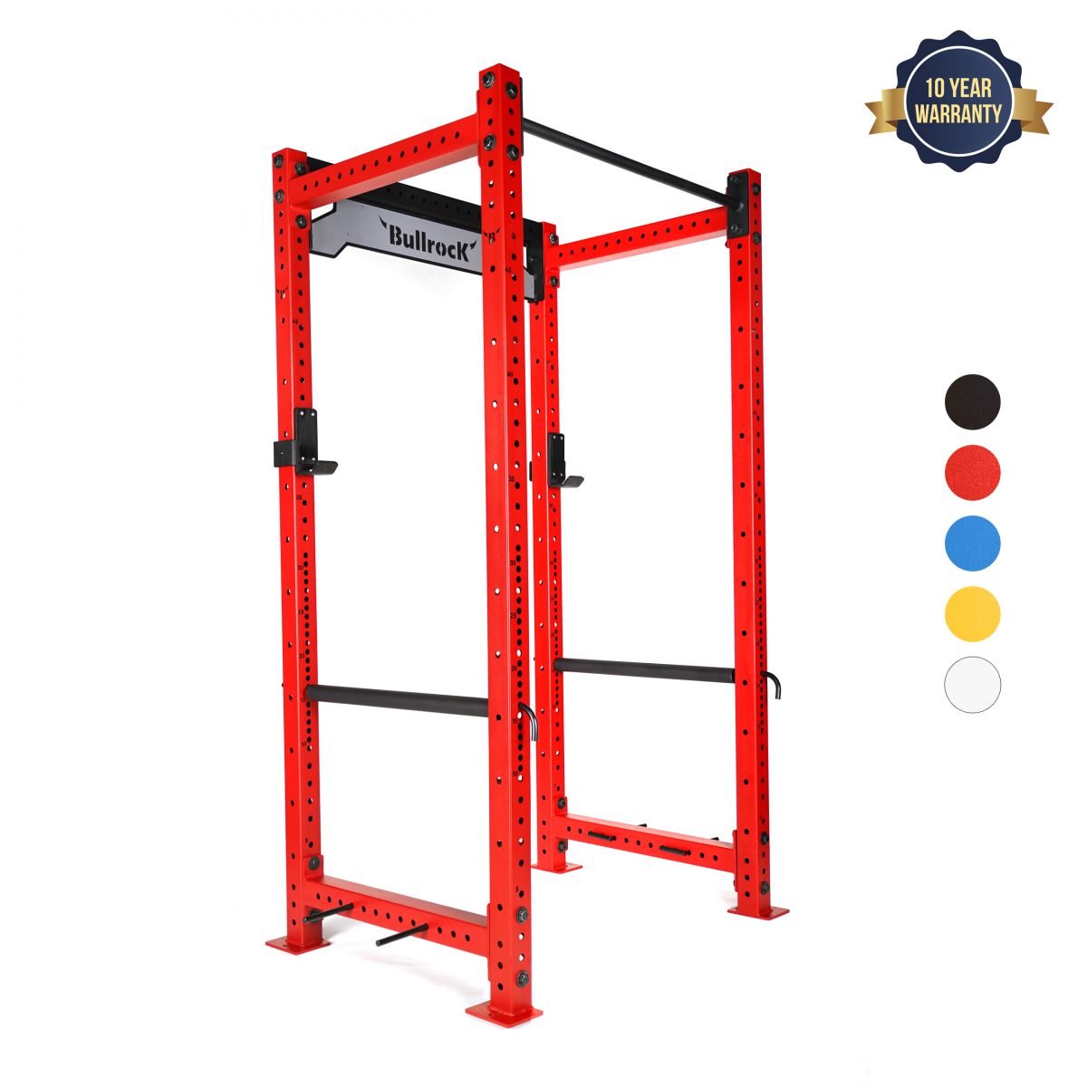 Material 3″ x3″ 11-gauge (3mm) CR Steel Tube | UHMW Plastic Dimensions Length – 36”, Width – 47”, Height – 90” Footprint (incl. base feet) 38.8″ x 51.6″ Max Load Capacity 1000lbs/454kg Finish (Coating) 7-Tank Powder Coated Product Weight 131kg Attachments Compatibility 16mm Fasteners M16 Black Zinc hardware Warranty 10-year Structural Warranty Included Components: 4 Uprights of 90″ tall, 4 Cross-members, 1 Cross-member with BullrocK Logo Plate, 1 Pull-up Bar of 32mm diameter, 4 Band Pegs, 2 Advanced J-Cups, 2 Safety Pins with 2 Pipes & 24 M16 x 110mm Bolt kit & 2 Spanners (24mm).
