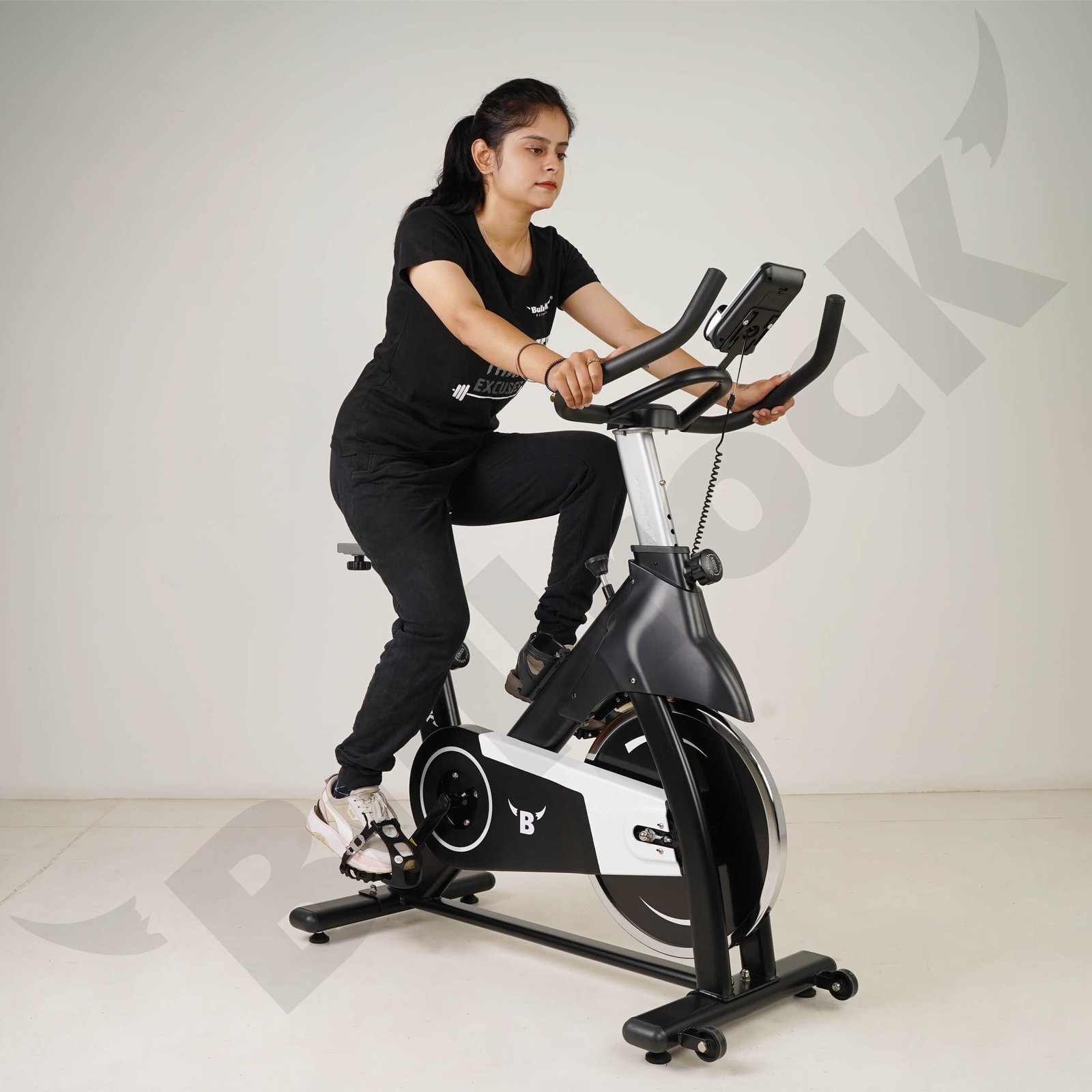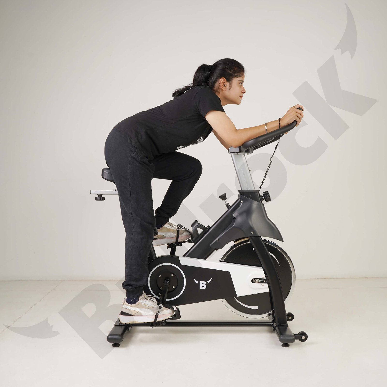 To give an authentic indoor cycling experience, this spin bike features a 13kg lightweight flywheel driven by a belt. The breaking mechanism is friction pad, the resistance of which is adjustable via a knob. It has almost zero noise in comparison to general friction pad spin bikes.