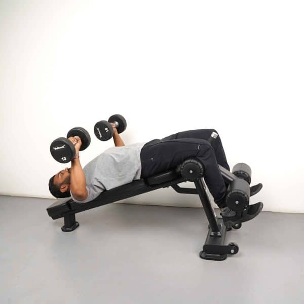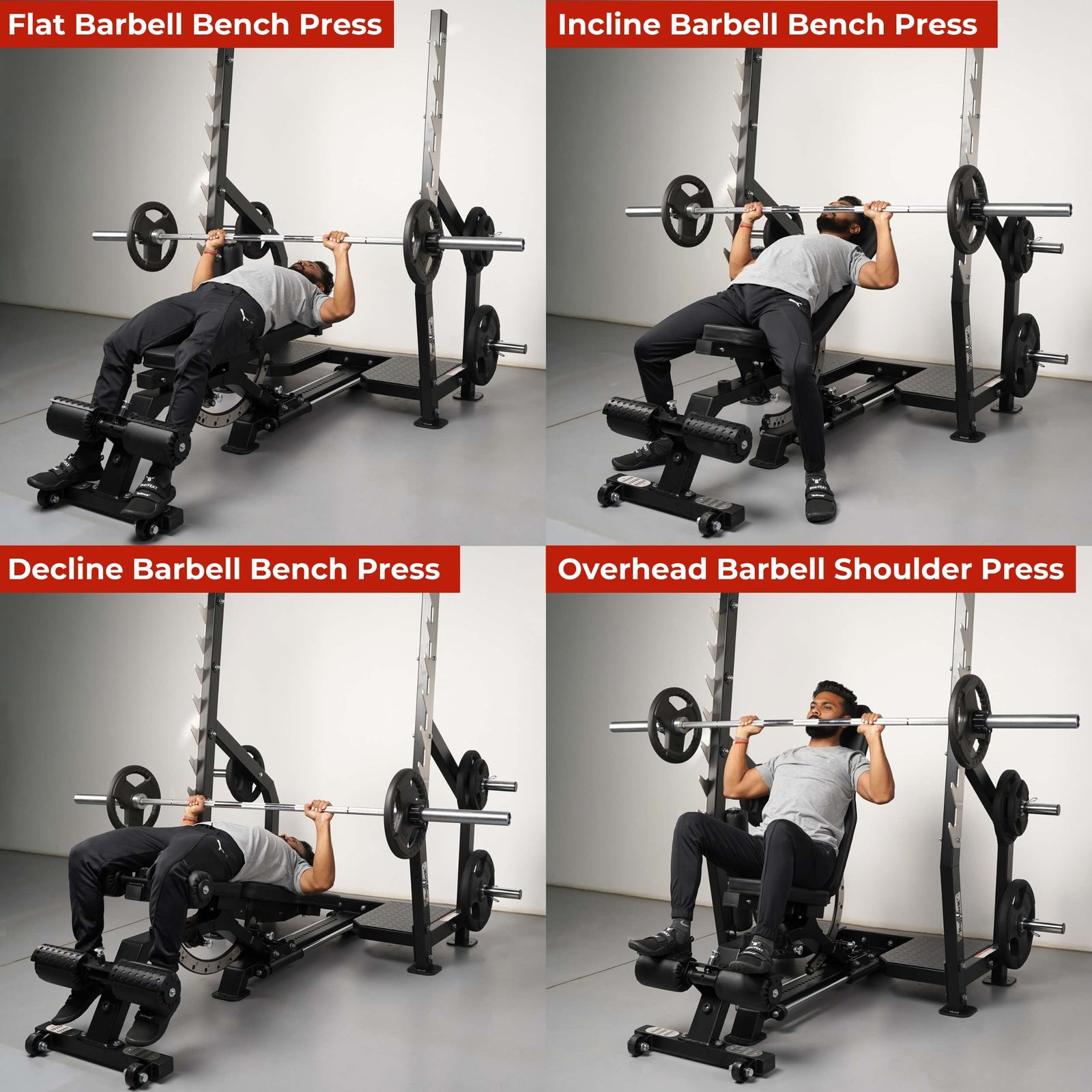 The integrated adjustable bench offers exceptional adjustments to create tailored settings for users. You can perform Barbell exercises for chest, shoulder and triceps, such as flat bench press, incline/decline presses, overhead presses for shoulders, close grip bench press for triceps etc.