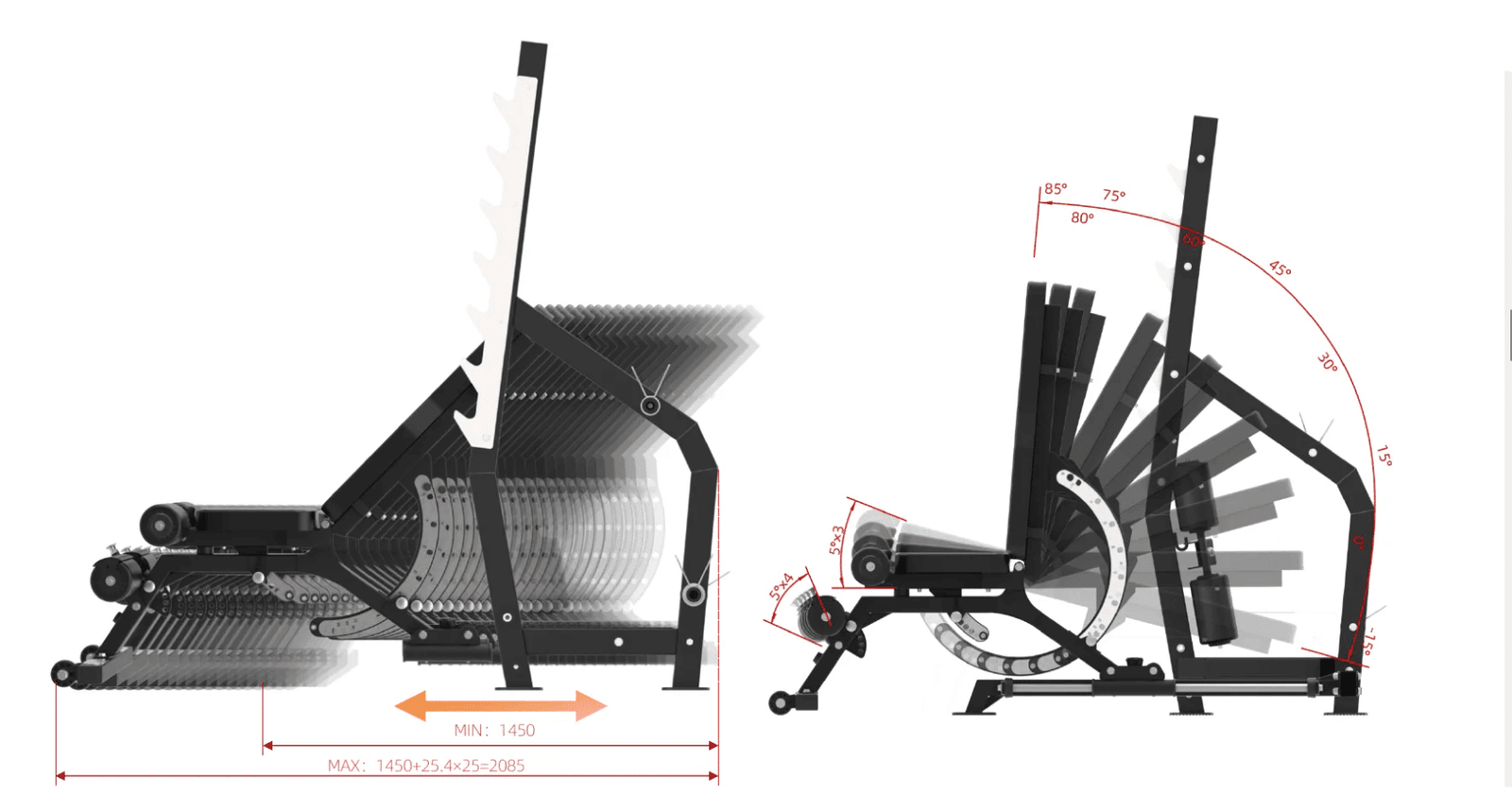 - Backrest: 9-position adjustment ranging from decline, flat, and incline (-15° to 85°).