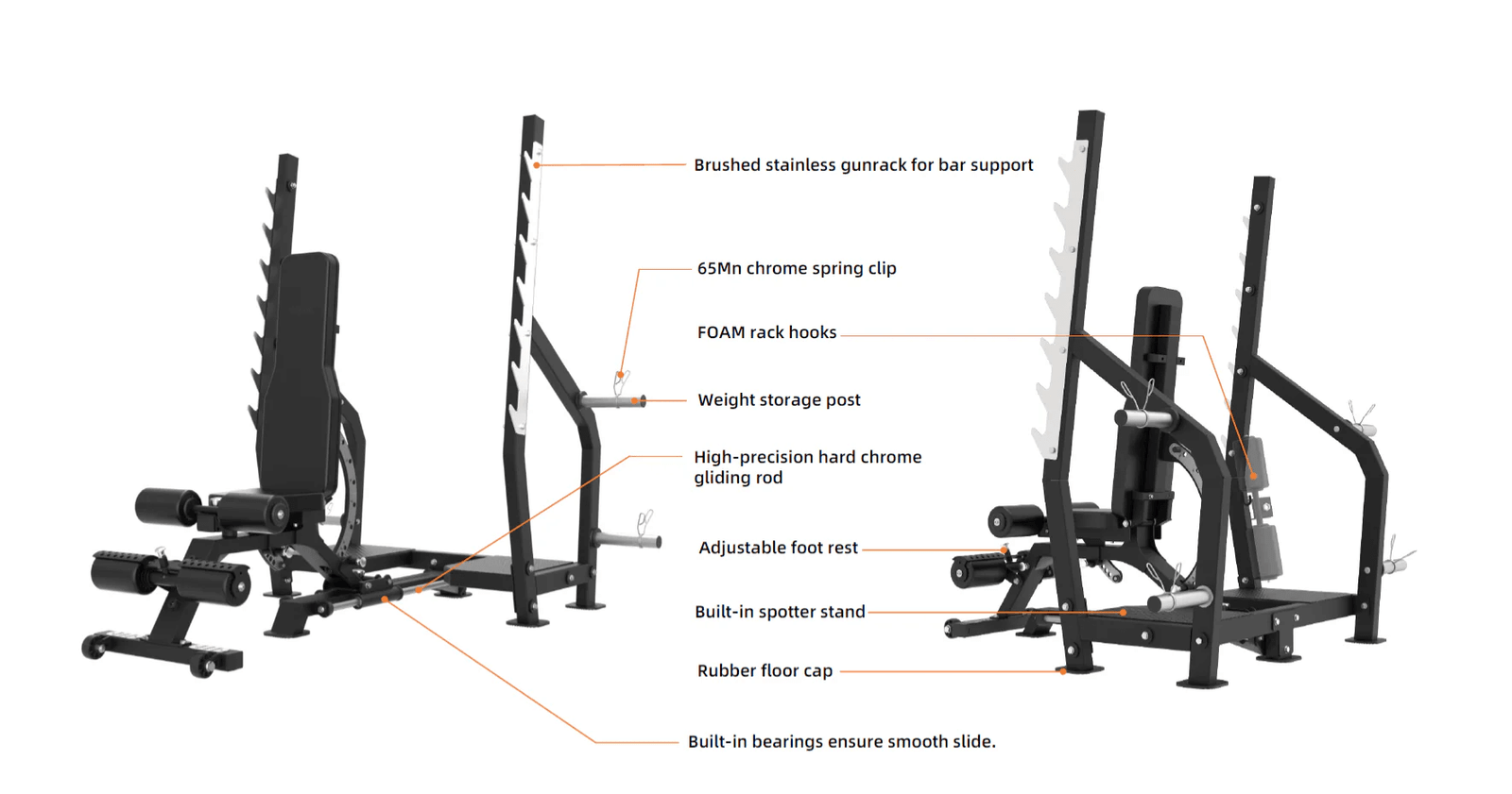 - Rubber buffer pads on seat support, sliding system, and weight storage horns for added durability.