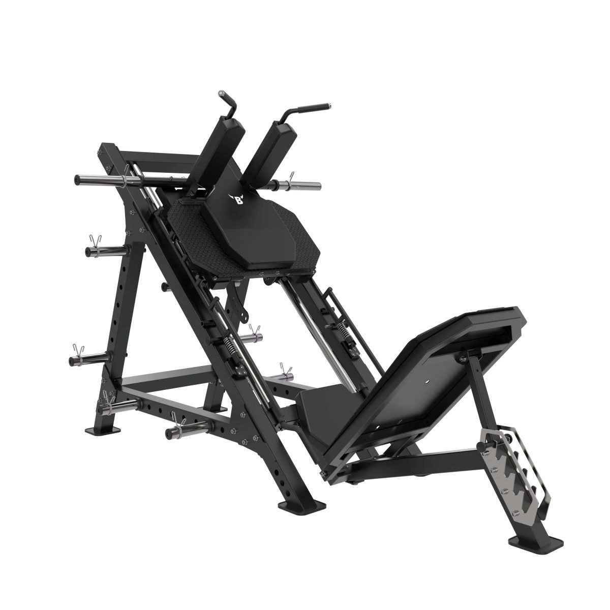 To customize the weights, additional stainless steel weight horns are present, along with a dual zone counterweight. Adjustable position settings are made convenient by simple aluminium alloy pin lock systems and ladder designs, to obtain a precise angle for individual training needs. It also has a provision as a landmine attachment to perform additional barbell exercises. The 8 pcs of storage weight horns can be mounted on side frame at convenient positions.