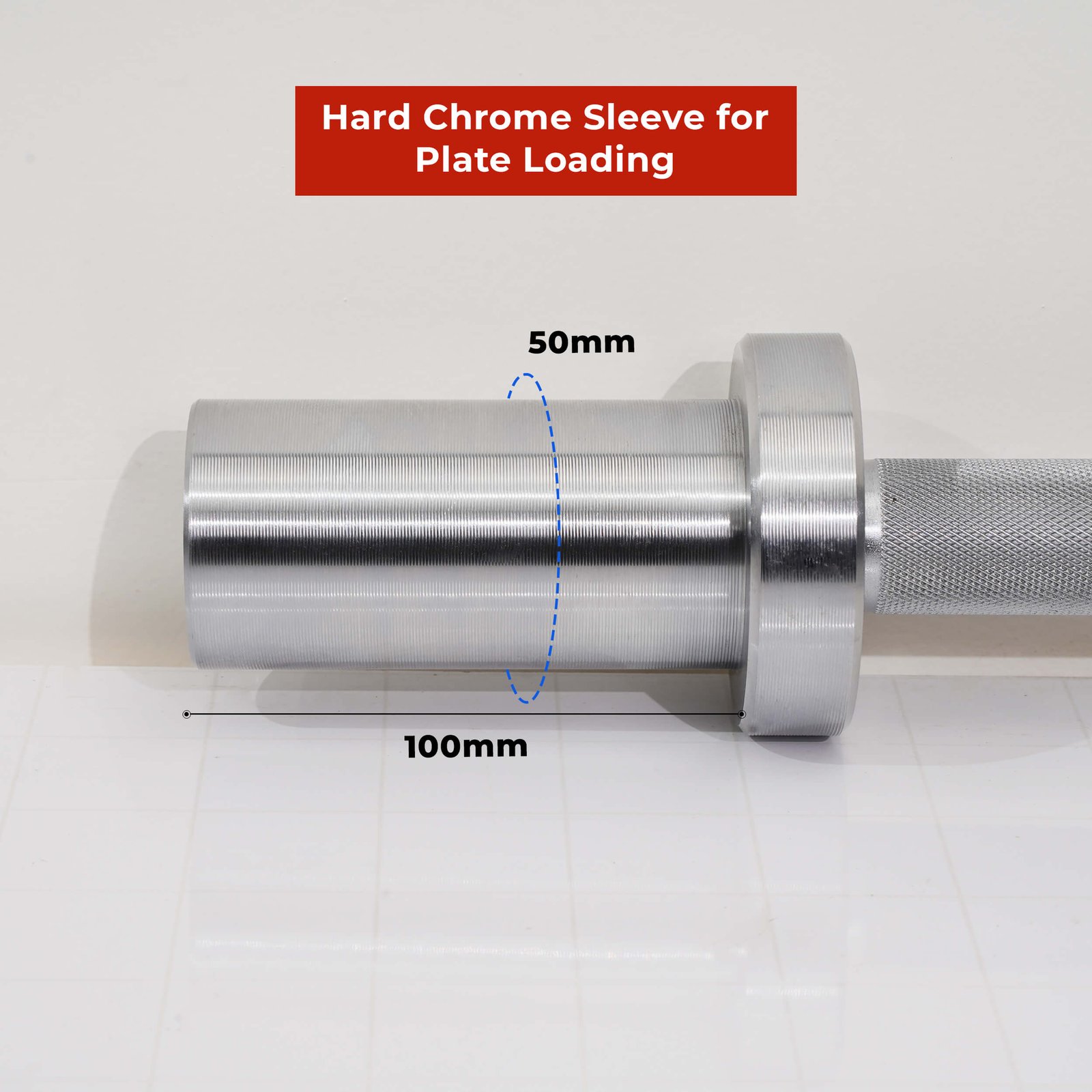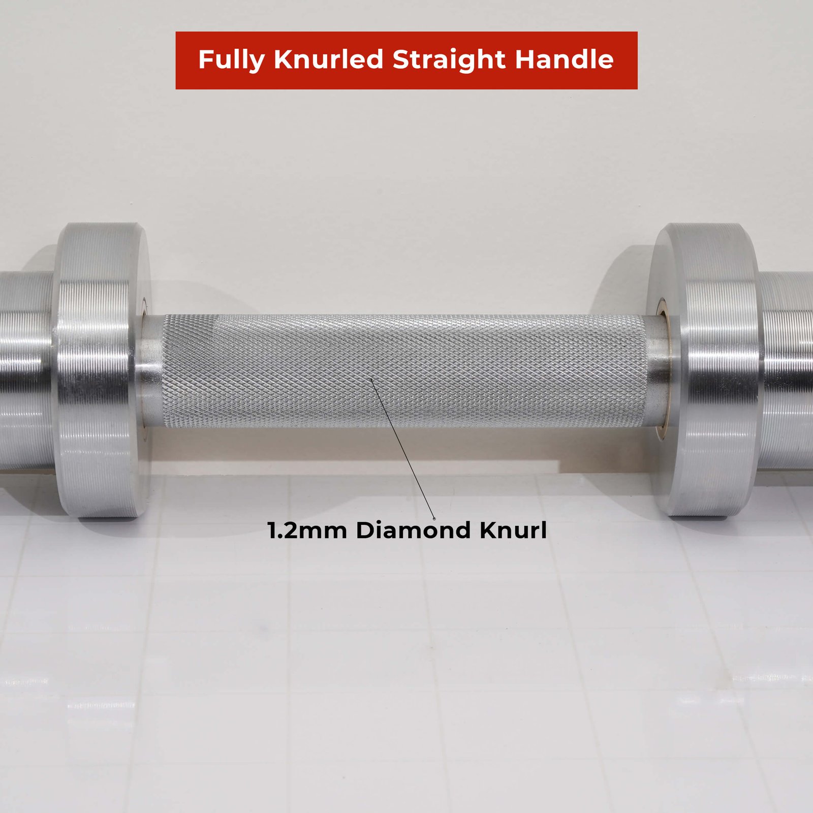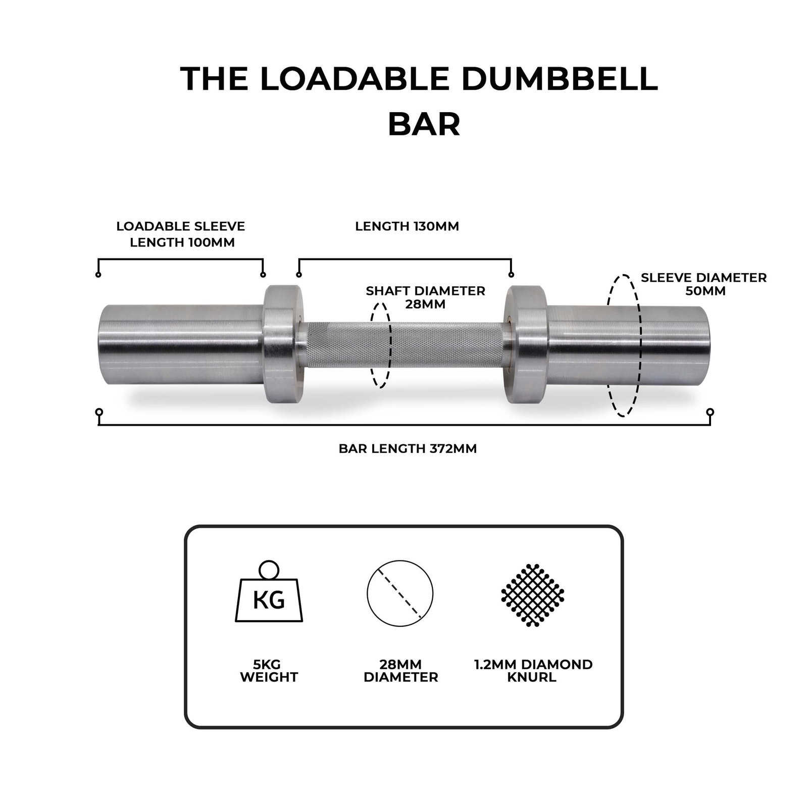 It is 372mm long and imitates a standard Olympic Bar in terms of a Handle/Shaft Diameter of 28mm and a Sleeve diameter of 50mm compatible with Standard Olympic Plates. It features a fully knurled straight handle/shaft with 1.2mm diamond knurl and weighs 5kg.