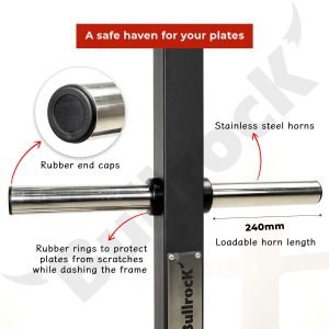 Constructed with an aim to improve the longevity of weight plates, this plate tree features stainless steel horns at three levels, along with a provision for storing four barbells with an added convenience. It features six storage posts that collectively enable 1440mm Plate Loading Capacity for different types of plates.