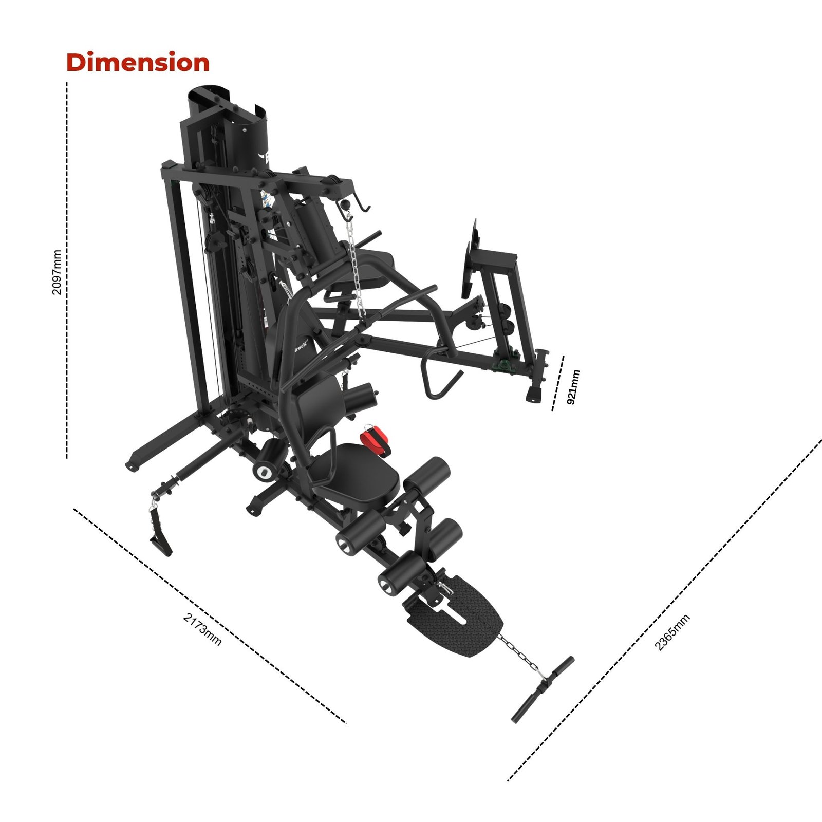 • Footprint (with Leg Press): 236.5 × 217.3 × 209.7 cm (L × W × H) · 93.1″ × 85.5″ × 82.6″