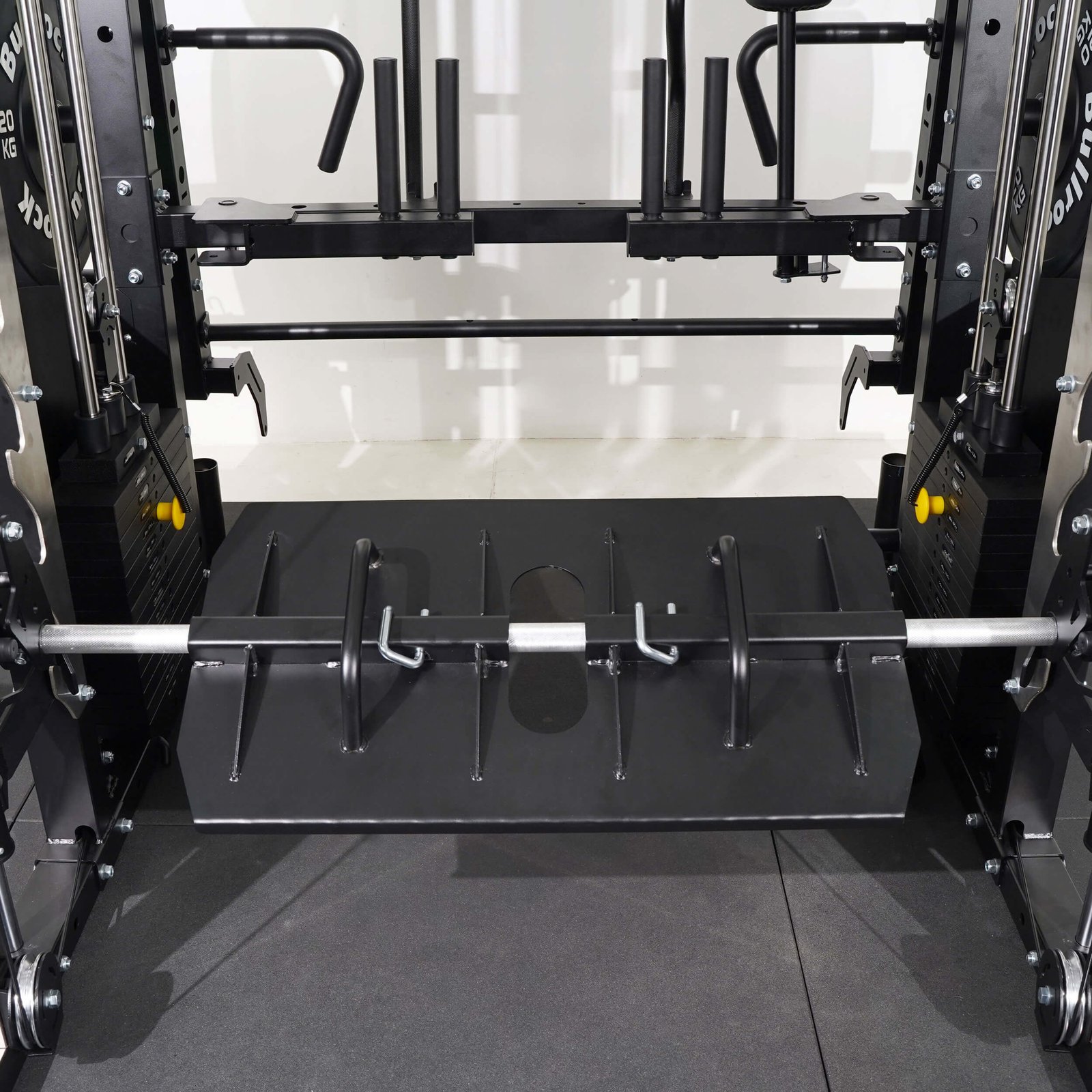 Compatible with All in One trainer OX Pro 11, this attachment can be attached to smith machine bar to perform 90 degree leg press/calf exercises in the home gym.