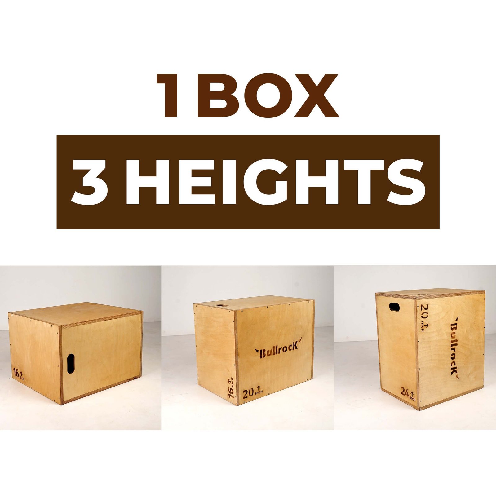 A fully assembled Box with 3 different heights. BullrocK’s BirchWood plyo box is built robust for carrying out explosive plyometric training, safely and effectively.