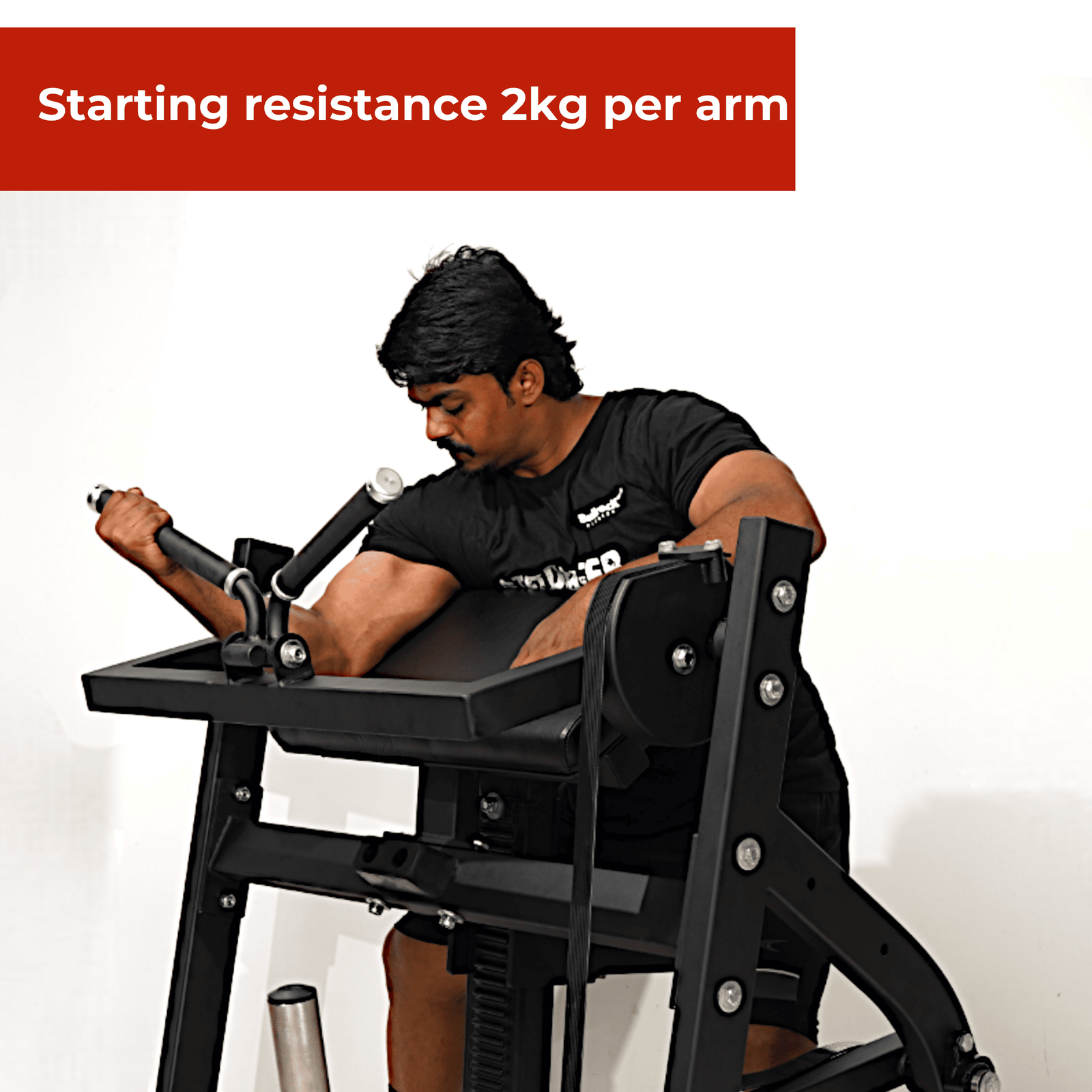 The preacher curl machine is expertly designed to deliver enhanced resistance for focused bicep targeted workouts. With its innovative belt-over-solid-steel cam mechanism, this machine provides a smooth, controlled experience, ensuring maximum muscle engagement during preacher curl exercises.