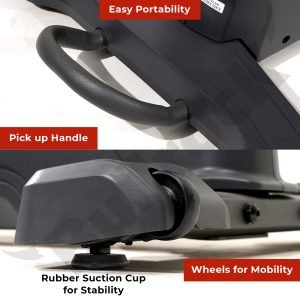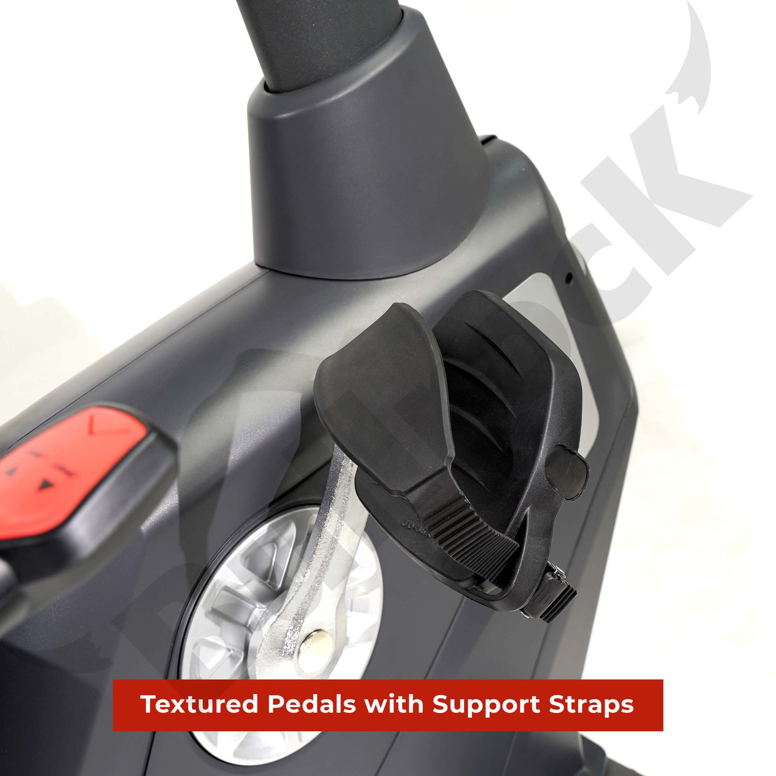 The textured peddles secure the feet with straps. Additionally, it features convenience features such as USB Charger, MP3 Socket + Speakers and a Fan.
