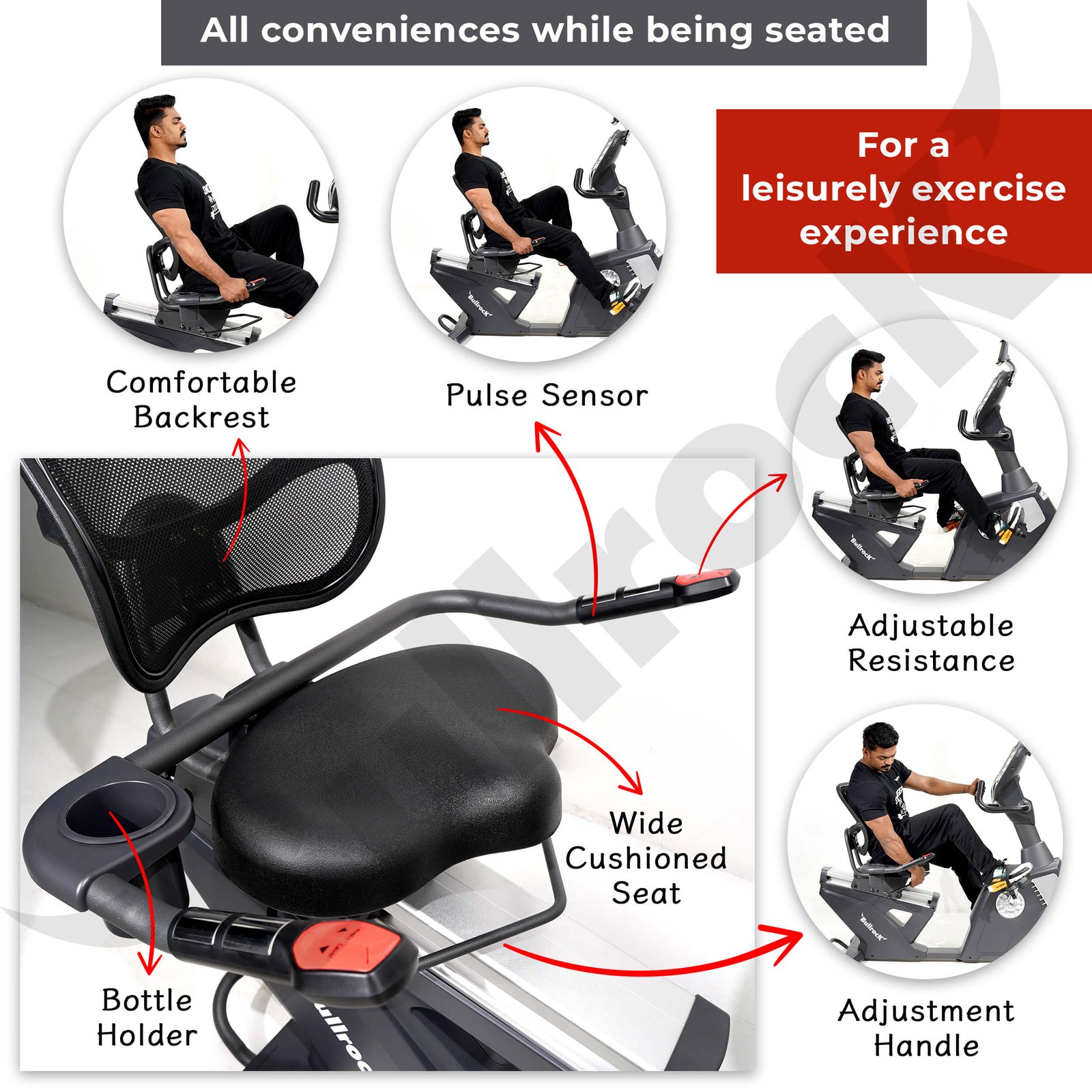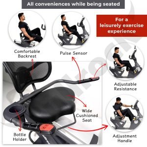 Offering an ultra convenience, you can adjust the resistance, change seat positions, and access the bottle holder, and handles, all while being seated and peddling, without bending or standing up. The seat is wide cushioned and has a firm back support to rest, useful for a rested workout without straining your back.