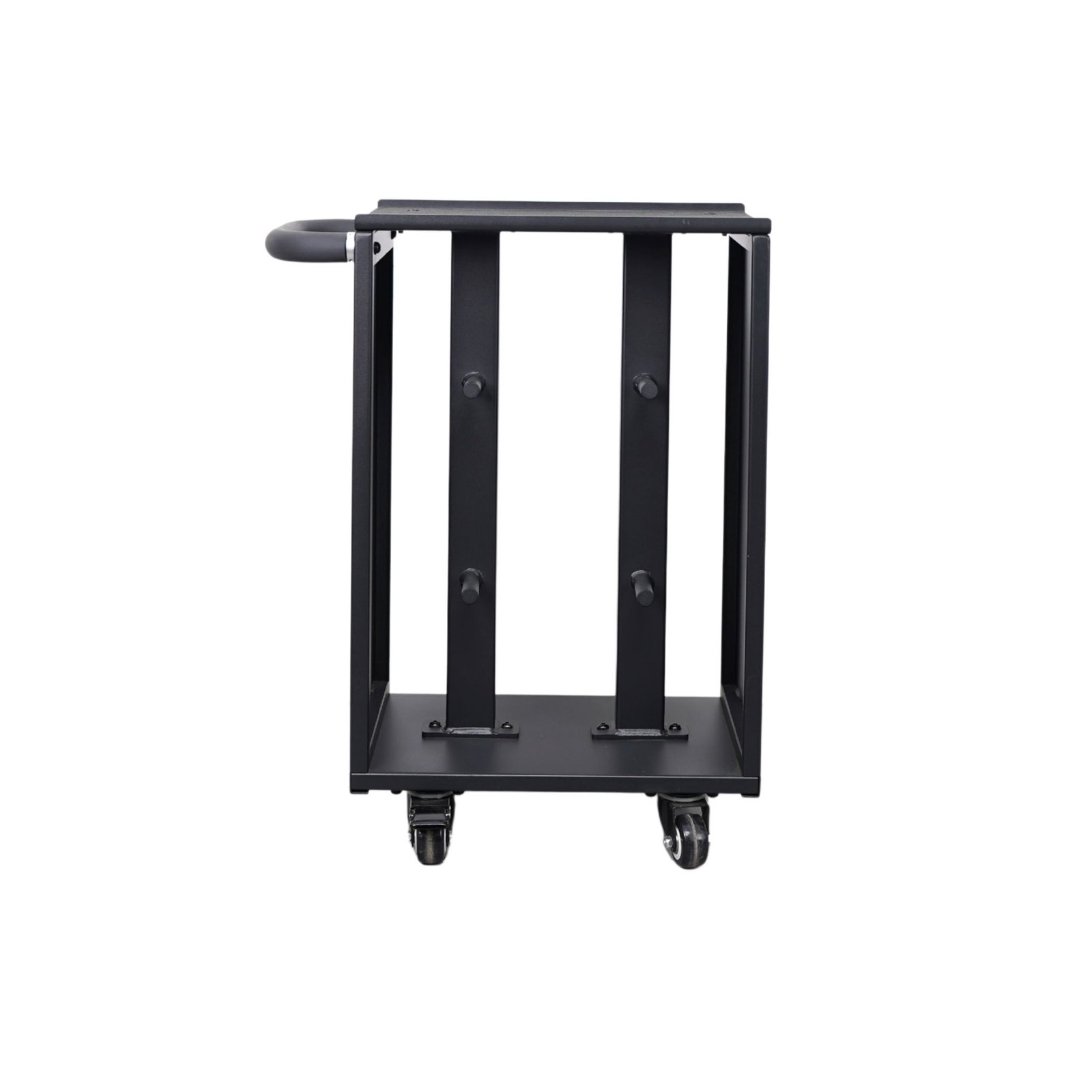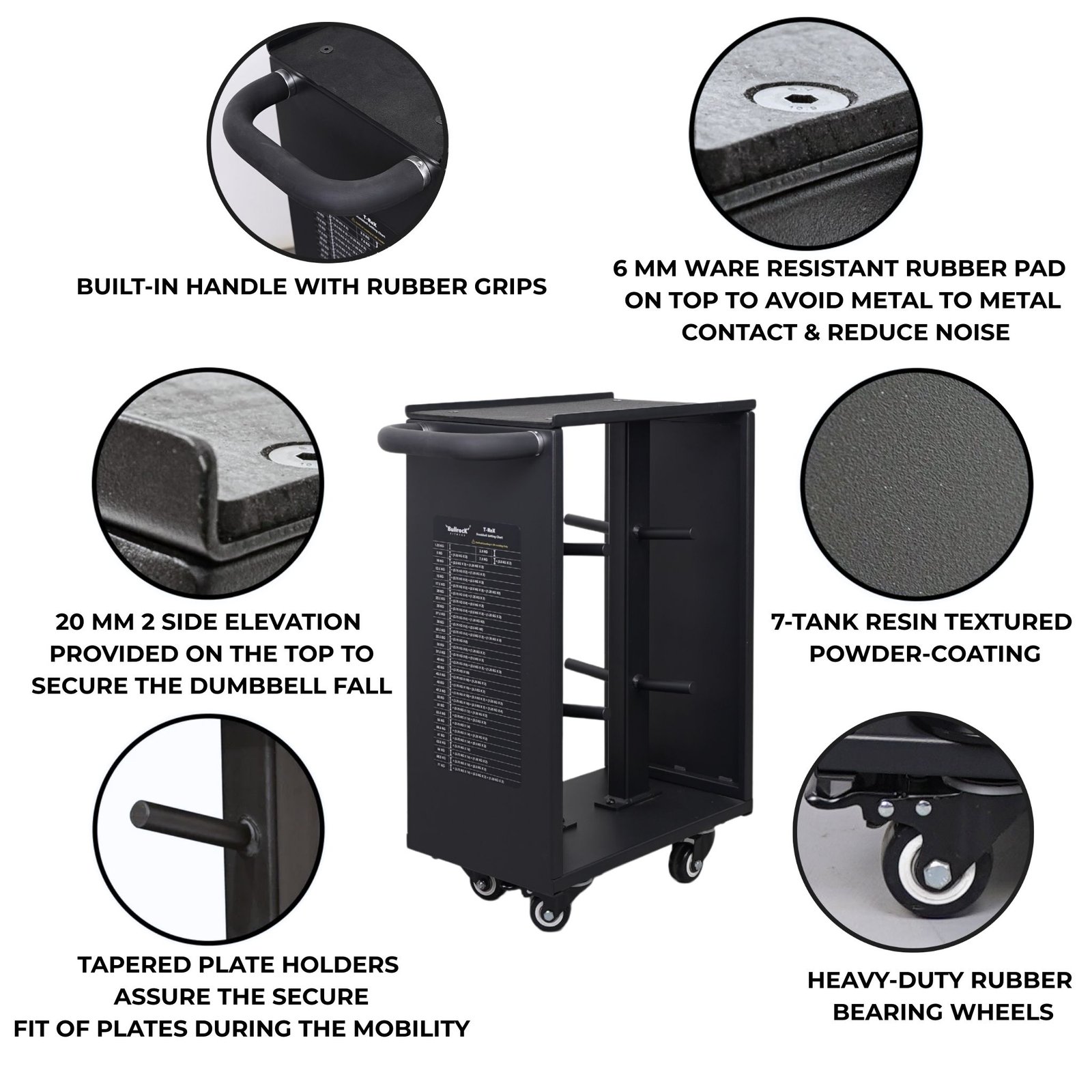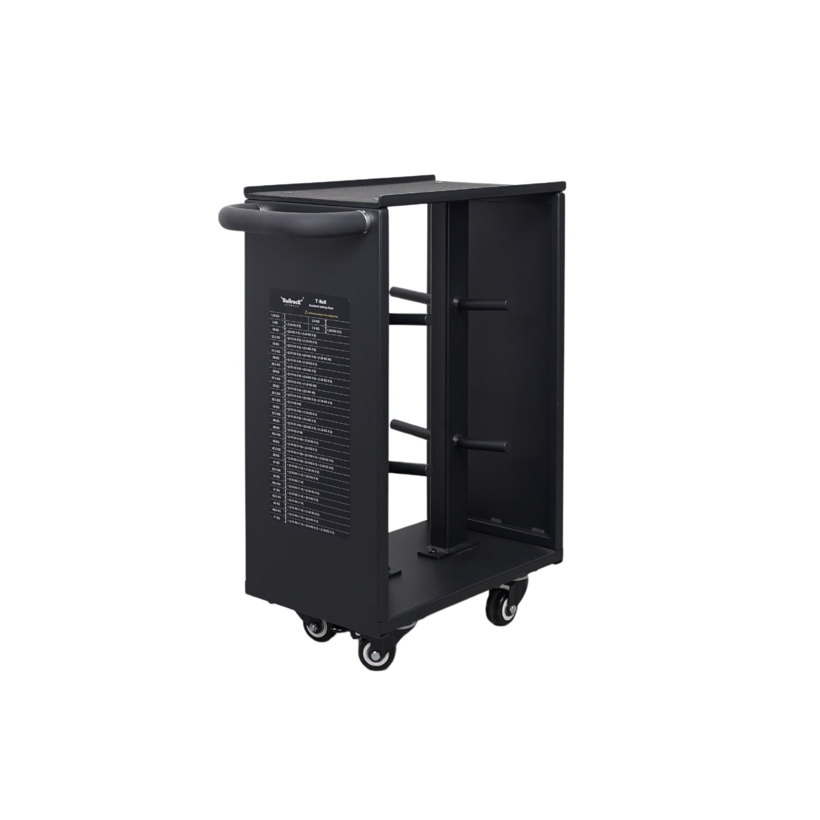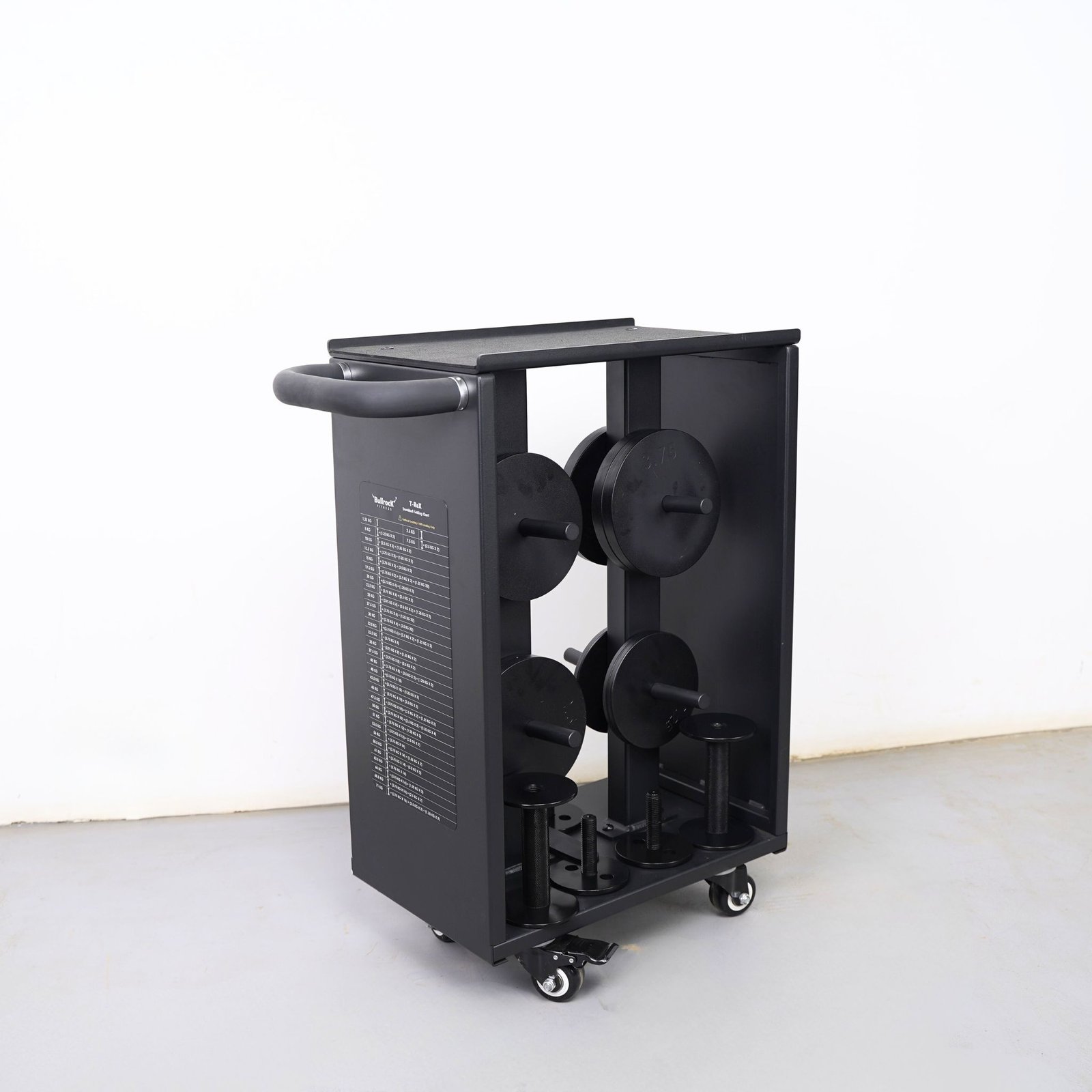 Safety is built in. 20 mm side elevations on the top surface help prevent accidental slips, while the tapered plate holders ensure a secure fit and reduce the chance of plates shifting during movement. Finished in a structured matte black powder coat, the trolley delivers a premium look while improving resistance to oxidation and long-term wear.