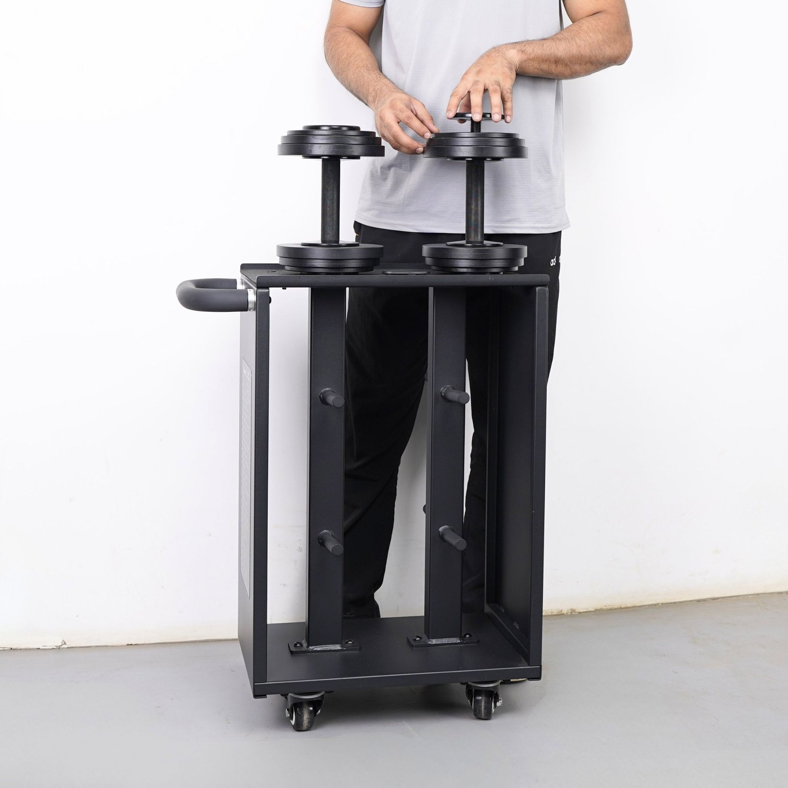 It helps keep your setup clean and organized by offering systemized plate storage along with a space-efficient dumbbell parking solution, allowing a 50 kg × 2 adjustable dumbbell set to stay neatly stored within an extremely small footprint.