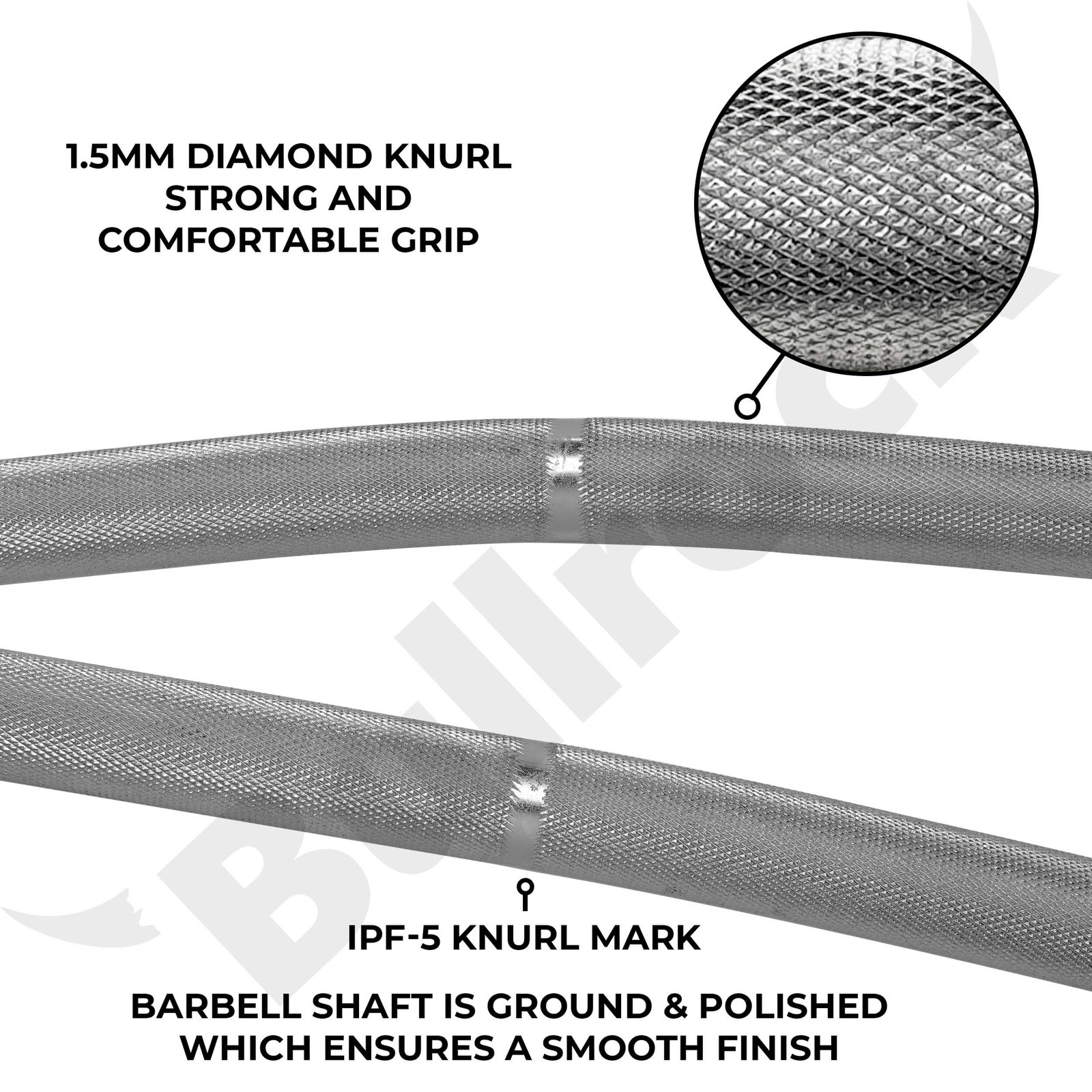 Knurling and Markings: It has a fully knurled shaft with a 1.5mm diamond knurl. The distance between two standard knurl markings is 800mm sleeve to sleeve, and 400mm from the centre knurl, securing you a comfortable holding and resting position.Â