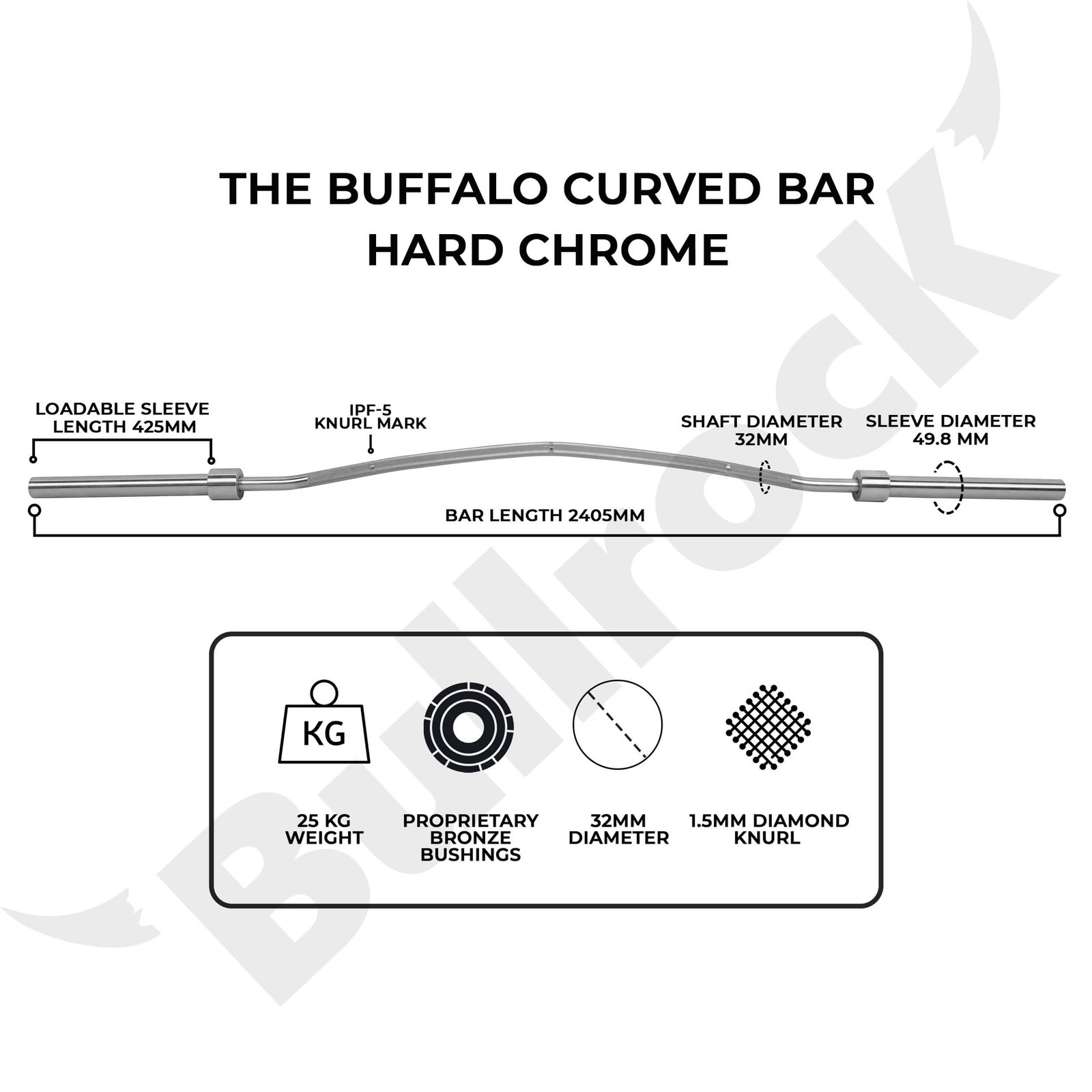 Superior Strength & Finish: The Buffalo Barbell is 8ft long having a shaft diameter of 32mm and a loadable sleeve length of 425mm with a maximum loading capacity of 1800lbs. The Shaft and Sleeves have a proprietary hard chrome coating.