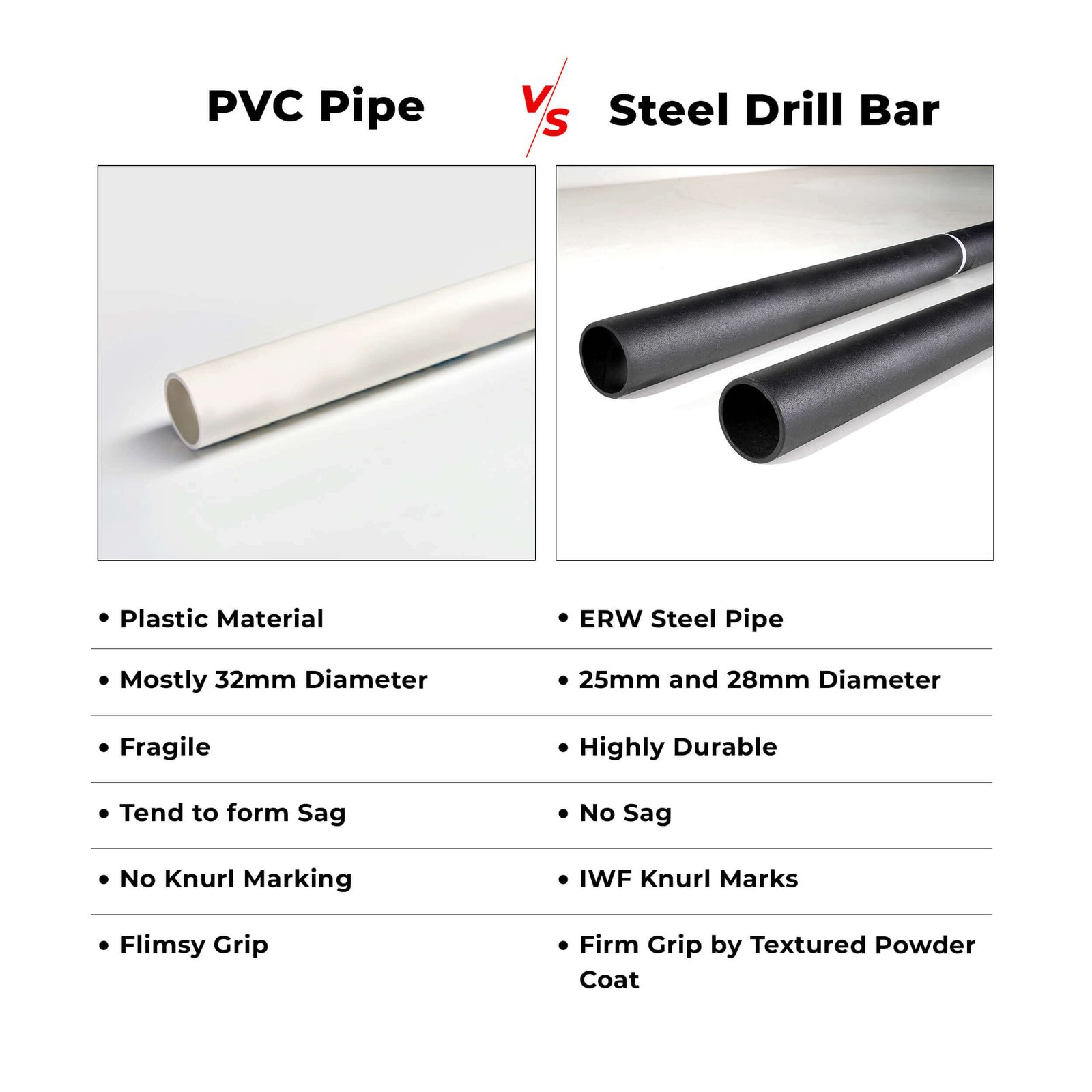 The Drill Bar is constructed with Seamless ERW Steel Pipe weighing just 1.5kg. The Bar is fully powder coated in textured black, and it has IWF standard 5mm Knurl marks which are grooved and coloured white.