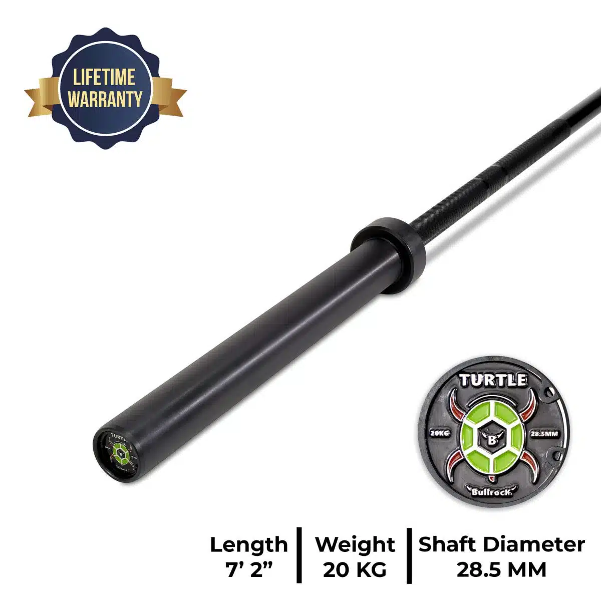 The Black Turtle’s shaft features original USA-made Cerakote – a thinner, premium ceramic coating – paired with a 1.0mm medium-depth knurl that delivers just the right grip without chewing your hands. Ideal for high-volume lifters who demand balance between feel and control.