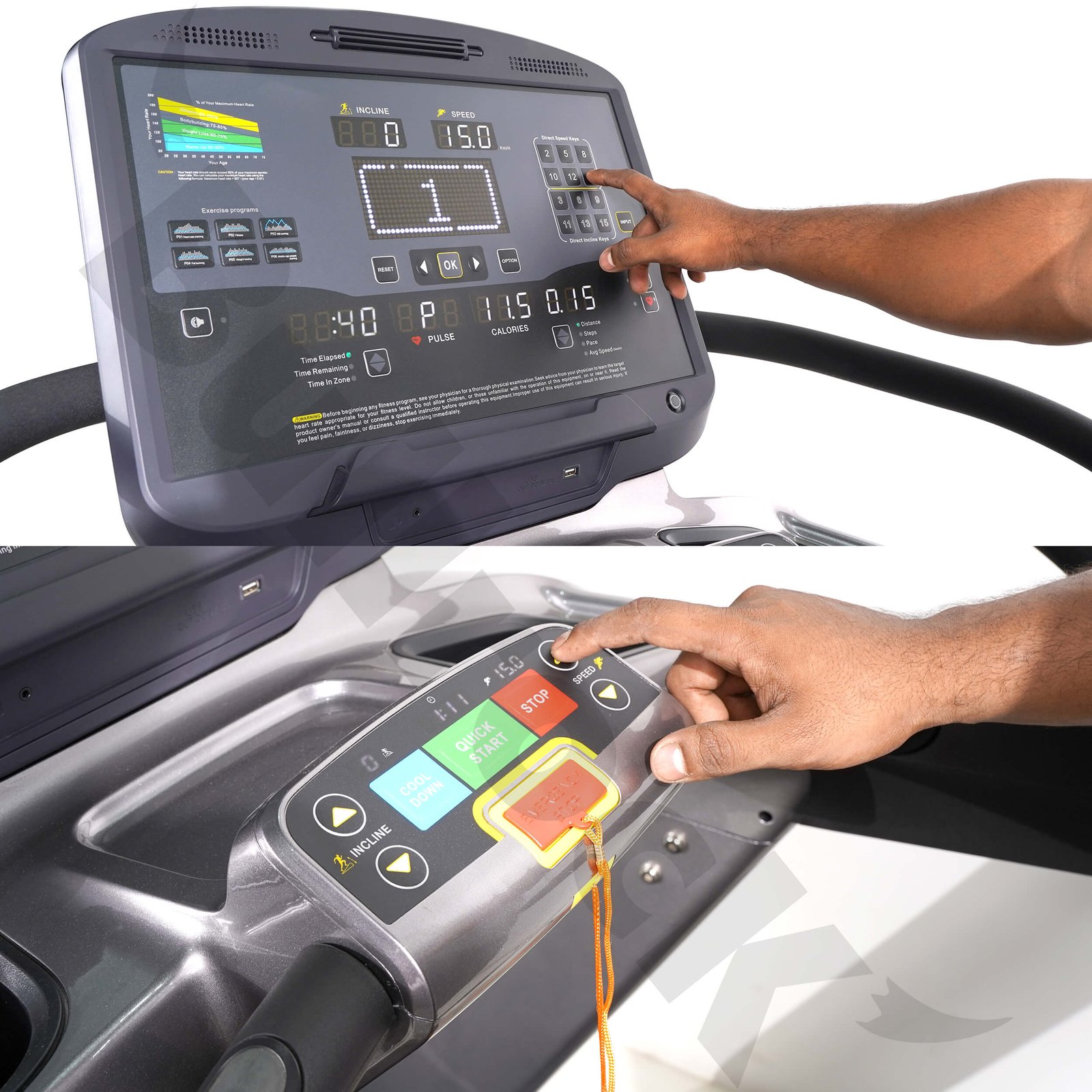 | Navigation Keys | Easily set speed ( 3,6 ,9 ,11 ) & inclination (2,5,8,10) with quick access buttons |