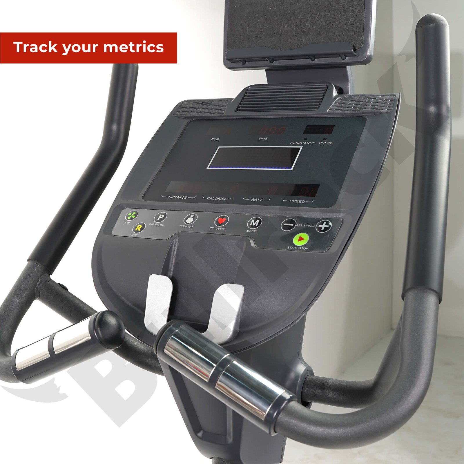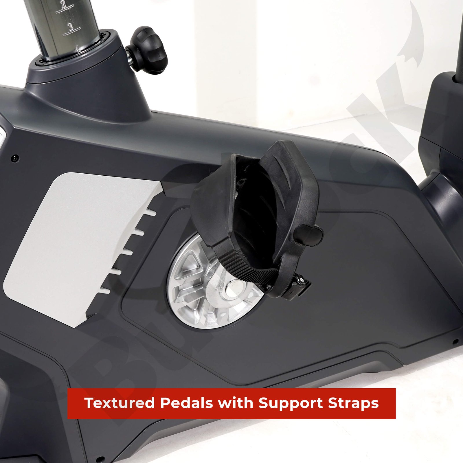 It features a reliable magnetic braking system and a self generating 15kg flywheel, delivering a consistently smooth riding experience with 20 level adjustable resistance.  The handles are foam covered and have pulse sensors. The LED display proves useful in tracking your metrics.