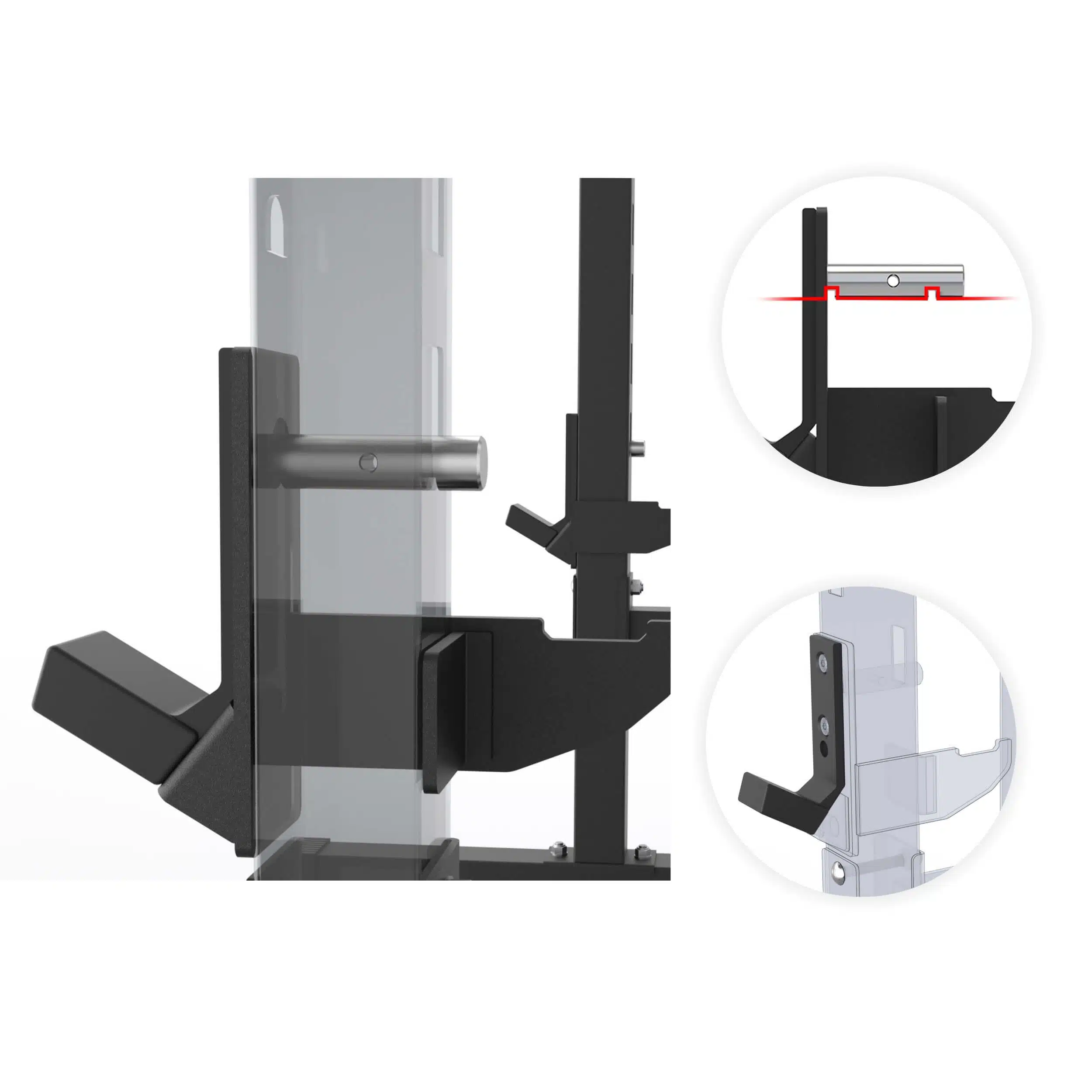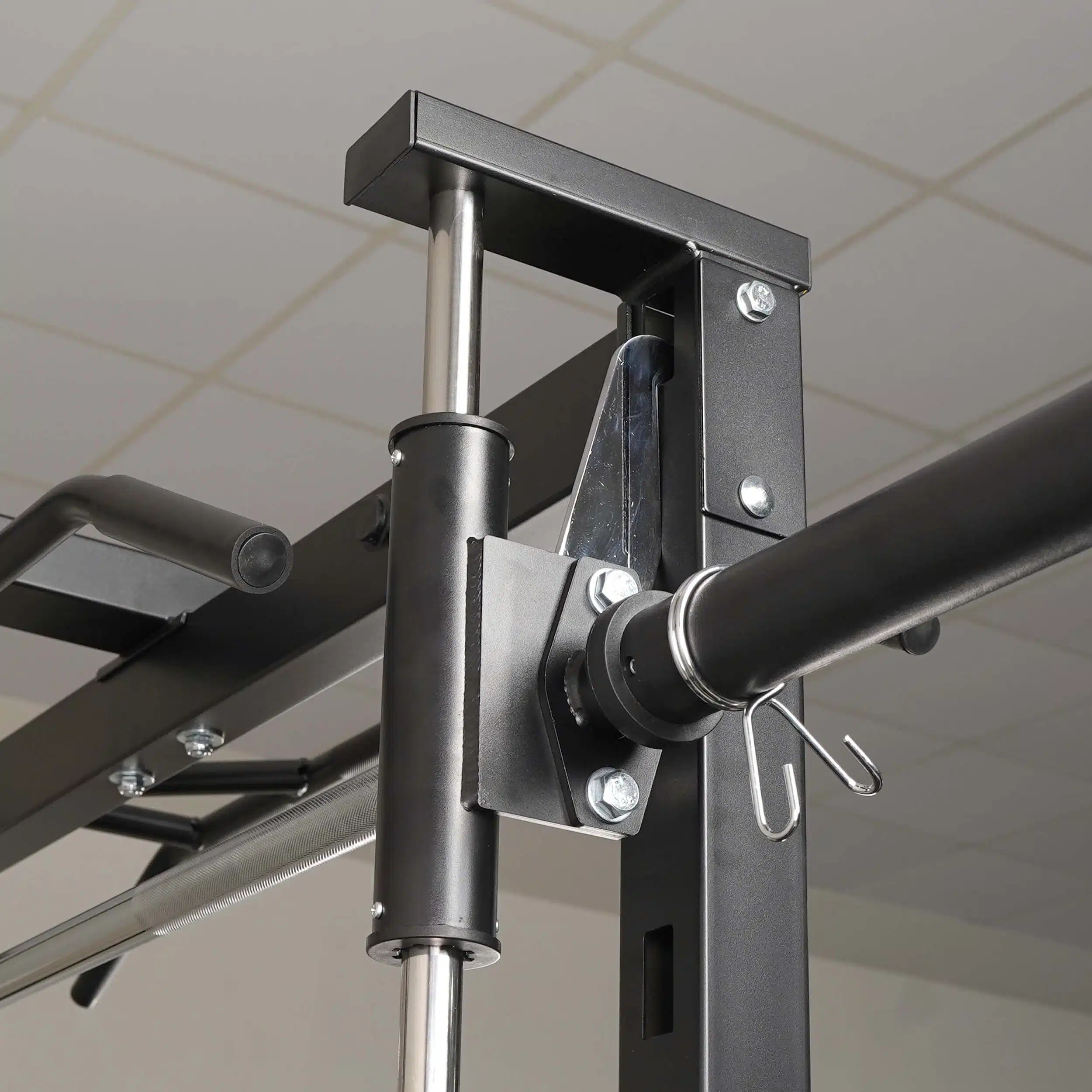 Smith Bar Range Lock feature with J-Cup adjustment. Also can be locked at top when not in use, making it convenient to perform other exercises.