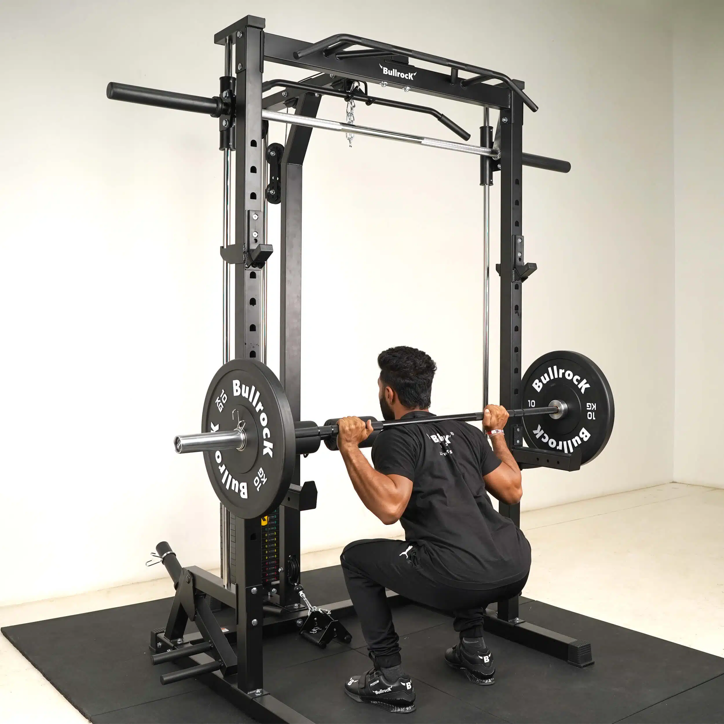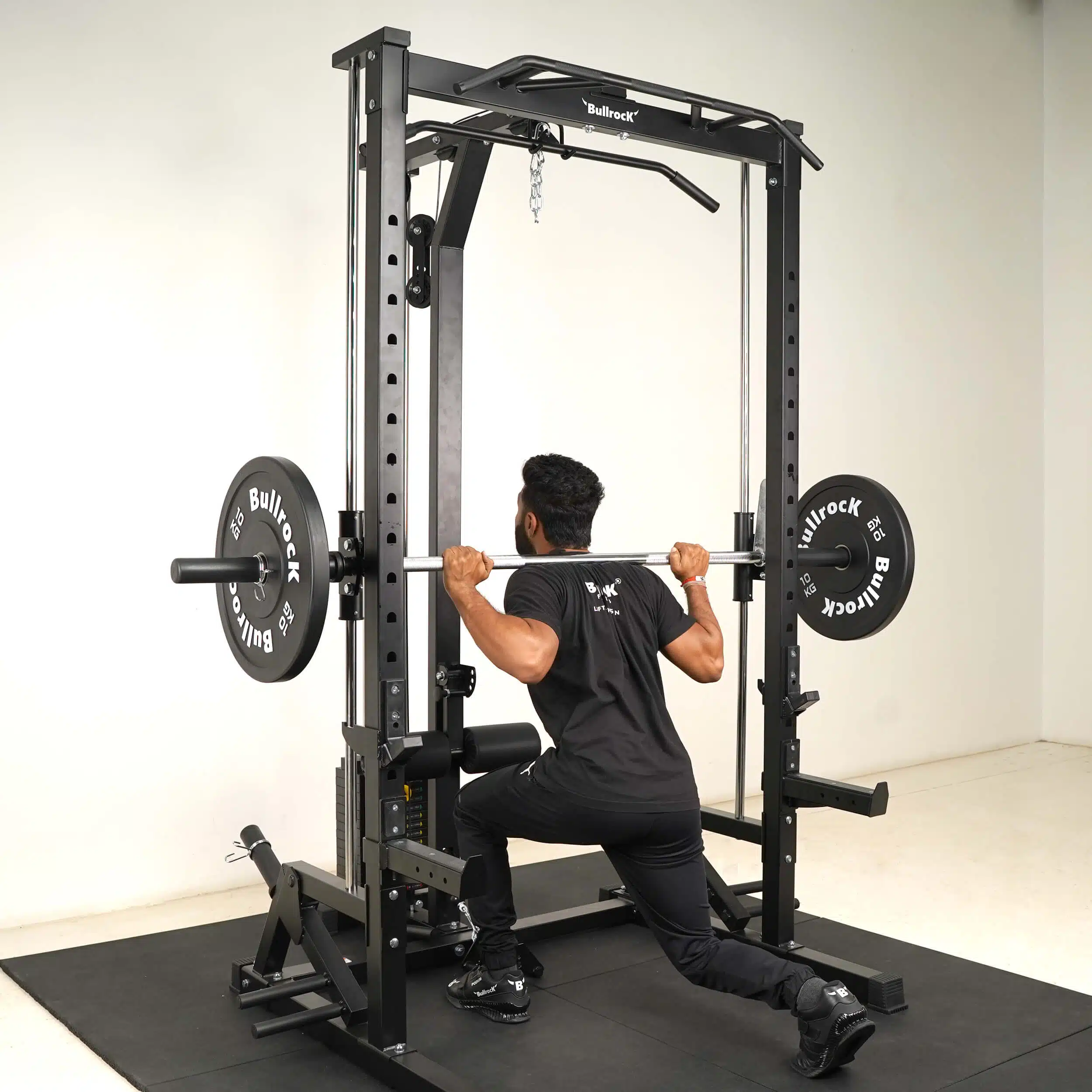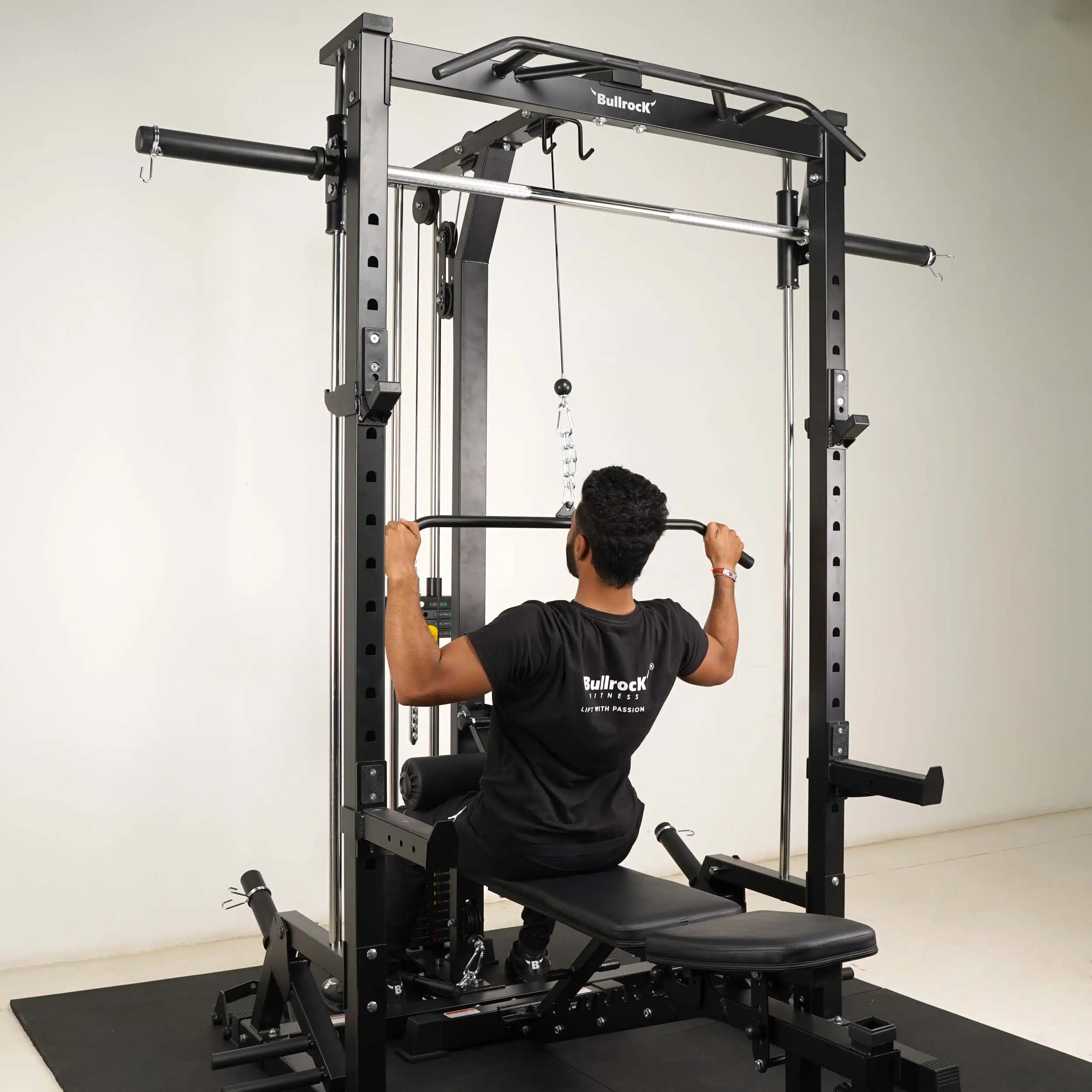 The OX 7 combines a Squat Rack, Smith Machine, Lat Pull Down, Low Row, Biceps Triceps Pulley, Multi-Grip Pull-up, Adjustable Parallel Bar Dip in the footprint of a single half rack.