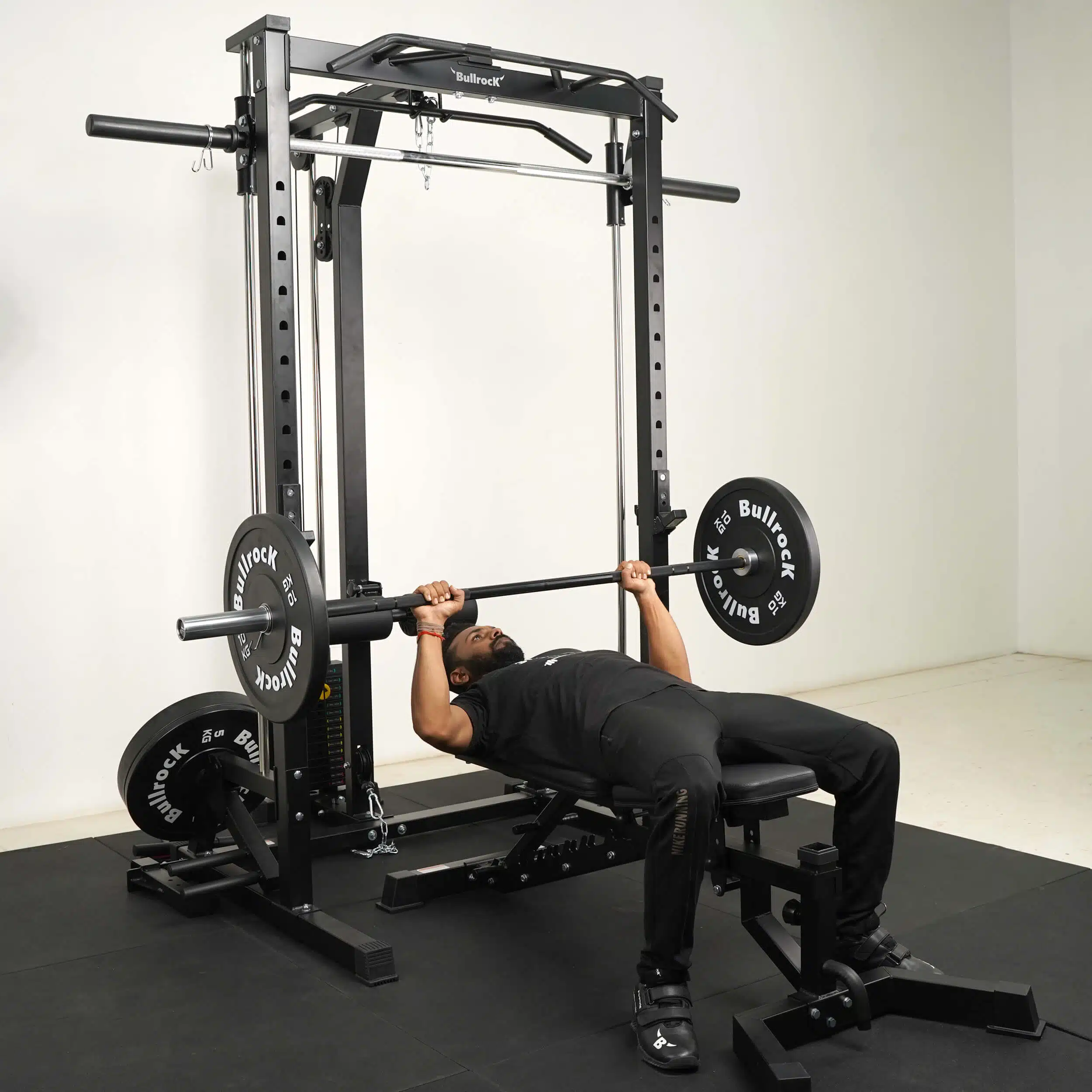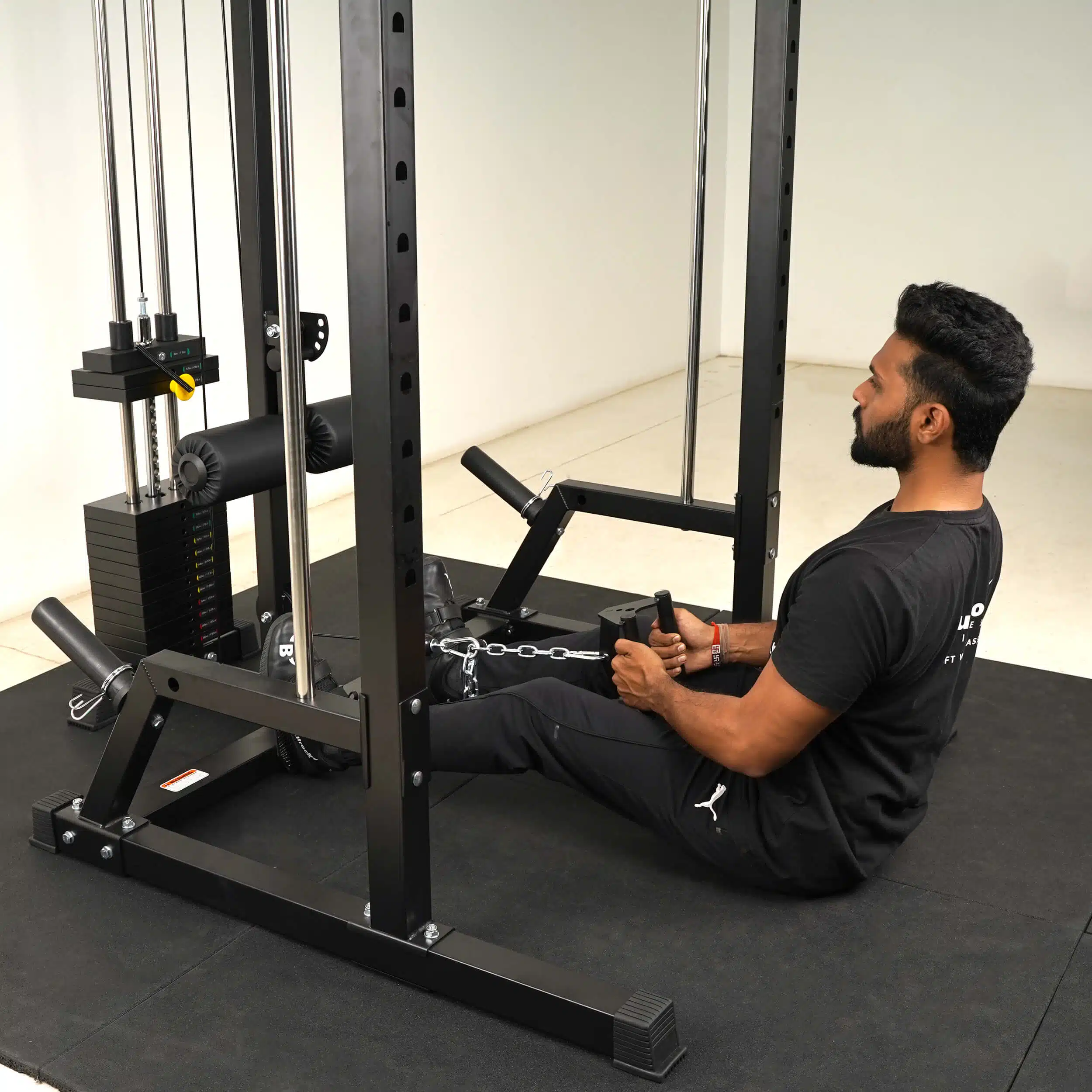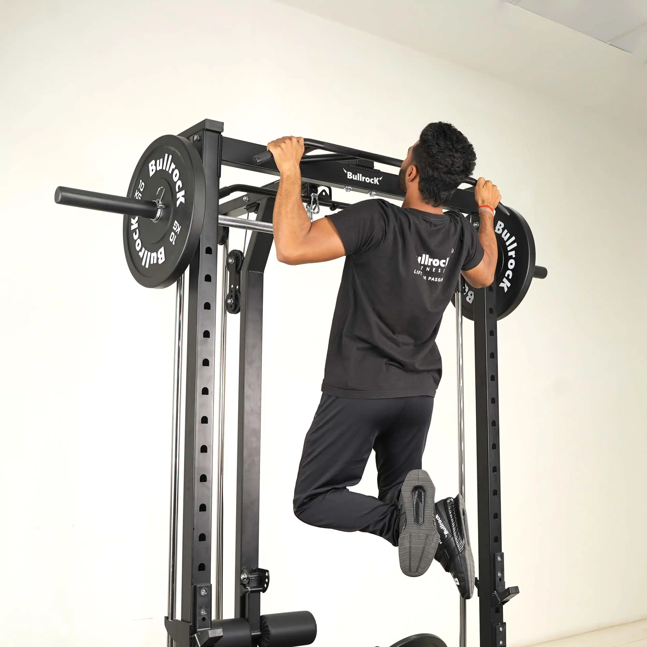The OX 7 combines a Squat Rack, Smith Machine, Lat Pull Down, Low Row, Biceps Triceps Pulley, Multi-Grip Pull-up, Adjustable Parallel Bar Dip in the footprint of a single half rack.