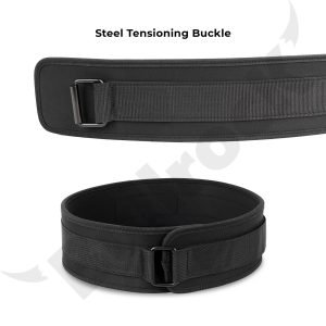 The belt is suitable for weightlifting as its thinner profile does not prick or pinch your abdomen while lift transitions (cleans, snatches) also especially when you bend down to begin. The 4″ wide strap of nylon material gives a comfortable yet stable support and an optimal contoured fit.